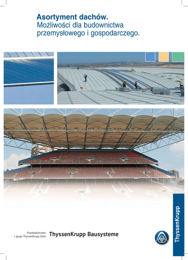 ThyssenKrupp Bausysteme tk Przedsiebiorstwo z grupy ThyssenKrupp Steel ThyssenKrupp Bausysteme Solidny partner, poważne przedsięwzięcia. Ekonomika, niewielkie koszty produkcji, duże wymiary budynków - to wymagania stawiane nowoczesnym budynkom przemysłowym lub budynkom gospodarczym. Wszędzie tam, gdzie wcześniej wystarczało proste „zadaszenie” aby zabezpieczyć pracowników na stanowiskach pracy przed głównymi wpływami atmosferycznymi takimi jak deszcz i wiatr, obecnie wymagana jest nowoczesna powłoka, która jest wyjątkowo oszczędna, tłumi hałas w każdym kierunku, lub nawet go „wchłania”.Ponadto taka powłoka powinna być łatwa w montażu, szybka do wymiany i niewiele kosztować. Największą powierzchnię w przemysłowym budownictwie wielokondygnacyjnym na większości budynków stanowi dach. Jednakże także tutaj w większości przypadków wprowadza się oszczędności, bez zastanowienia się nad późniejszymi skutkami. Przy tym dla najczęściej występujących zadań dostępne są rozwiązania „skrojone na miarę”. Firma ThyssenKrupp Bausysteme na całym świecie oferuje szeroki program produktów, również specjalnych na dach. Czy dach ma być zamontowany na miejscu w sposób konwencjonalny tylko z jednego, czy z kilku elementów, system firmy ThyssenKrupp Bausysteme oferuje dużą ilość „jednopowłokowych” elementów budowlanych: • Profile trapezowe, o wysokości 35 do 160 mm - również z perforacją dźwiękochłonną. • Hoesch Dachsystem 2000, dla dużych, dowolnych rozpiętości przęseł do 10 m. • Hoesch Bogendach, z dowolnymi rozpiętościami przęseł do 20 m, dla wymagających rozwiązań architektonicznych. Gdy wymagane jest szybkie, wielkopowierzchniowe pokrycie o wysokiej izolacji cieplnej - firma ThyssenKrupp Bausysteme zapewnia również obszerny program produktów w technologii wielowarstwowej: • Thermodach dzięki swoim fabrycznie umieszczonym trzem taśmom uszczelniającym systemu Triplex oraz dzięki poliuretanowemu rdzeniowi izolacyjnemu spełnia prawie wszystkie wymagania stawiane nowoczesnemu dachowi przemysłowemu. • Hoesch isodach integral®, dalsze rozwinięcie dachu wielowarstwowego. Również w tym przypadku stosowany jest system Triplex. Ponadto rozwiązanie to charakteryzuje kryte mocowanie do minimum redukujące możliwe punkty przecieków uwarunkowane tym systemem. • Hoesch isodach mono®, do budowy dużych, prawie płaskich powierzchni. Umożliwia uproszczoną zabudowę wycięć dachowych i dobudówek, które są potrzebne do nowoczesnego i przyjaznego dla środowiska pozyskiwania energii. • Hoesch isorock® integral D, pierwszy „niepalny” dach wielowarstwowy. Dach ten spełnia wymagania odpowiedniej klasyfikacji materiałów budowlanych, jest szybki w układaniu i bezpieczny w użyciu. Ponadto zapewnia ogniotrwałość do 90 minut. Obojętnie, jakie macie Państwo pomysły i wymagania, w firmie ThyssenKrupp Bausysteme znajdziecie Państwo solidnego partnera, który zawsze zapewni wsparcie realizacji Państwa zadań poprzez: • obszerny program z przyjaznymi dla środowiska i nadającymi się do recyklingu produktami dla wielokondygnacyjnego budownictwa dla przemysłu i rzemiosła, • produkty i usługi optymalnie dostosowane do wymagań Klientów, • lokalizację produkcji w pobliżu rynków zbytu, a tym samym szybkość i elastyczność procesów, • silnie umotywowanych i wykwalifikowanych pracowników o wysokich kompetencjach w zakresie doradztwa, • wysokiej jakości produkty i innowacje w atrakcyjnych cenach. Serdecznie witamy w firmie ThyssenKrupp Bausysteme. Program elementów budowlanych do konstrukcji dachów. Spis tresci 03 04 05 06 Hoesch Dachsystem 2000 Hoesch Bogendach 07 08 ClassicLine Thermodach 09 Trapezprofile 10 D · Info 1.1.2 · 7.2007 · bc Hoesch isorock® integral D Hoesch isodach mono® Hoesch isodach integral® Hoesch isowelle® Dach SpecialLine D · Info 1.1.2 · 7.2007 · bc CreativeLine Niepalny dach o odporności ogniowej do 90 minut. W przypadku systemu Hoesch isorock® integral D płaska powierzchnia ułatwia przede wszystkim zabudowę przewodów i klap wentylacyjnych lub pozostałych otworów. Dzięki systemowi Hoesch isorock® integral D wycięcia dachowe można w szczególnie prosty sposób wykonać i niezawodnie uszczelnić. Listwa kryjąca CreativeLine Własności produktu: • kryte mocowanie, minimalizacja możliwych punktów przecieków, • jako element wielowarstwowy „niepalny“ zgodnie z EN 13 501-1: A2-s1, d0, • płyty z wełny mineralnej o klasie materiałów budowlanych A1, niepalne, • płyty z wełny mineralnej podlegające biodegradacji, • okładziny zewnętrzne GALFAN® plus powłoki, • minimalne nachylenie dachu 5°, • wysoka izolacyjność cieplna dzięki oszczędnemu głębokiemu rowkowaniu, prawie całkowite wykorzystanie nominalnej wysokości elementu, • okładziny nie przepuszczające pary wodnej z fabrycznie naniesioną taśmą uszczelniającą, • separacja termiczna okładzin, • klasy odporności ogniowej zgodnie z DIN EN 13 501-2 od EI 30 do REI 90. d Listwa kryjąca 1000 Szerokość budowlana Listwa kryjąca Nr zamówieniowy: S33-052 Element mocujący Nr zamówieniowy: Z33-051 Przekrój złącza Nazwa elementu budowlanego Typ Grubość elementu d mm Grubość okładziny Zewn. tN mm Wewn. tN mm 95 D1 Hoesch isorock® integral D 115 135 0,60 0,75 0,50 0,75 155 95 D2 D · Info 1.1.2 · 7.2007 · bc D · Info 1.1.2 · 7.2007 · bc Hoesch isorock® integral D 115 135 155 0,60 0,75 0,50 0,75 Max. dostarczana długość Ciężar m 18,0 17,8 18,0 16,3 17,2 15,1 15,9 14,0 18,0 16,1 16,7 14,7 15,1 13,4 13,8 12,4 kg/m2 19,0 22,5 21,0 24,5 23,0 26,5 25,0 28,5 21,2 24,8 23,7 27,3 26,2 29,8 28,7 32,3 Opór cieplny R m2K/W Współczynnik przenikania ciepła U W/m2K 2,19 0,42 2,65 0,35 3,12 0,30 3,58 0,27 2,04 0,45 2,48 0,38 2,91 0,32 3,35 0,28 certyfikowany Profilowanie Liniowana (L) Mikroprofilowana (M) V-profilowana (V) Pow