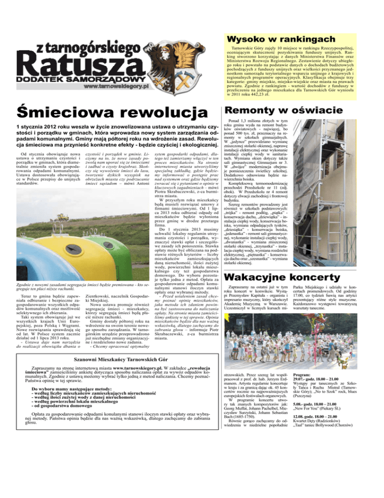 Wysoko w rankingach Tarnowskie Góry zajęły 10 miejsce w rankingu Rzeczypospolitej, oceniającym skuteczność pozyskiwania funduszy unijnych. Ranking stworzono korzystając z danych Ministerstwa Finansów oraz Ministerstwa Rozwoju Regionalnego. Zestawienie dotyczy ubiegłego roku i powstało na podstawie danych o dochodach budżetowych pochodzących z funduszy unijnych oraz wielkości przyznanego jednostkom samorządu terytorialnego wsparcia unijnego z krajowych i regionalnych programów operacyjnych. Klasyfikacja obejmuje trzy kategorie: gminy miejskie, miejsko-wiejskie oraz miasta na prawach powiatu. Zgodnie z rankingiem - wartość dochodów z funduszy w przeliczeniu na jednego mieszkańca dla Tarnowskich Gór wyniosła w 2011 roku 442,23 zł. Śmieciowa rewolucja 1 stycznia 2012 roku weszła w życie znowelizowana ustawa o utrzymaniu czystości i porządku w gminach, która wprowadza nowy system zarządzania odpadami komunalnymi. Gminy mają półtorej roku na wdrożenie zasad. Rewolucja śmieciowa ma przynieść konkretne efekty - będzie czyściej i ekologiczniej. Od stycznia obowiązuje nowa ustawa o utrzymaniu czystości i porządku w gminach, która diametralnie zmieniła system gospodarowania odpadami komunalnymi. Ustawa dostosowała obowiązujące w Polsce przepisy do unijnych standardów. czystość i porządek w gminie. Liczymy na to, że nowe zasady pozwolą nam uporać się ze śmieciami i zadbać o czysty krajobraz. Skończy się wywożenie śmieci do lasu, tworzenie dzikich wysypisk na obrzeżach miasta czy podrzucanie śmieci sąsiadom – mówi Antoni Zgodnie z nowymi zasadami segregacja śmieci będzie premiowana - kto segreguje ten płaci niższe rachunki. Teraz to gmina będzie zapewniała odbieranie i bezpieczne zagospodarowanie wszystkich odpadów komunalnych oraz możliwość selektywnego ich zbierania. Taki system obowiązuje już we wszystkich krajach Unii Europejskiej, poza Polską i Węgrami. Nowe rozwiązania sprawdzają się od lat. W Polsce system zacznie działać od 1 lipca 2013 roku. - Ustawa daje nam narzędzia do realizacji obowiązku dbania o Zientkowski, naczelnik Gospodarki Miejskiej. Nowa ustawa promuje również segregację śmieci - mieszkańcy, którzy segregują śmieci będą płacić niższe rachunki. Gminy dostały półtorej roku na wdrożenie na swoim terenie nowego sposobu zarządzania. W tarnogórskim urzędzie przeprowadzono już niezbędne zmiany organizacyjne i rozdzielono nowe zadania. - Chcemy opracować optymalny sytem gospodarki odpadami, dlatego też zamierzamy włączyć w ten proces mieszkańców. Na stronie internetowej miasta utworzyliśmy specjalną zakładkę, gdzie będziemy informować o postępie prac nad systemem oraz gdzie będziemy zwracać się z pytaniami o opinie w kluczowych zagadnieniach – mówi Piotra Skrabaczewski, z-ca burmistrza miasta. W przyszłym roku mieszkańcy będą musieli rozwiązać umowy z firmami śmieciowymi. Od 1 lipca 2013 roku odbierać odpady od mieszkańców będzie wyłoniona przez gminę w drodze przetargu firma. Do 1 stycznia 2013 musimy uchwalić lokalny regulamin utrzymania czystości i porządku, wyznaczyć stawki opłat i szczegółowe zasady ich ponoszenia. Stawka opłaty może być obliczana na podstawie różnych kryteriów – liczby mieszkańców zamieszkujących daną nieruchomość, ilości zużytej wody, powierzchni lokalu mieszkalnego czy też gospodarstwa domowego. Do wyboru pozostaje tylko jedna z metod. Opłata za gospodarowanie odpadami komunalnymi stanowi iloczyn stawki opłaty oraz wybranej metody. - Przed ustaleniem zasad chcemy poznać opinię mieszkańców, jaka metoda ich zdaniem powinna być zastosowana do naliczania opłaty. Na stronie miasta zamieściliśmy ankietę w tej sprawie. Opinia mieszkańców będzie dla nas ważną wskazówką, dlatego zachęcamy do zabrania głosu – informuje Piotr Skrabaczewski, z-ca burmistrza miasta. Remonty w oświacie Ponad 1,3 miliona złotych w tym roku gmina wyda na remont budynków oświatowych - najwięcej, bo ponad 500 tys. zł, przeznaczy na remonty w szkołach gimnazjalnych. W „jedynce” przewidziano wymianę zniszczonej stolarki okiennej, naprawę instalacji elektrycznej oraz wykonanie instalacji ciepłej wody w sanitariatach. Wymiana okien dotyczy także sali gimnastycznej Gimnazjum nr 3. W „dwójce” modernizacja obejmuje pomieszczenia świetlicy szkolnej. Dodatkowo odnowiona będzie nawierzchnia boiska. Kompleksową termomodernizację przechodzi Przedszkole nr 11 (zdj. obok). W Przedszkolu nr 4 remont dotyczy elwacji zachodniej i frontowej budynku. Szereg remontów prowadzony jest również w szkołach podstawowych: „trójka” - remont podłóg, „piątka” konserwacja dachu, „dziewiątka” - instalacja ciepłej wody, konserwacja boiska, wymiana odpadających tynków, „dziesiątka” - konserwacja boiska, „jedenastka” - remont sali gimnastycznej, wykonanie instalacji ciepłej wody, „dwunastka” - wymiana zniszczonej stolarki okiennej, „trzynastka” - instalacja ciepłej wody, wymiana rozdzielni elektrycznej, „piętnastka” - konserwacja dachu oraz „szesnastka” - wymiana stolarki okiennej. Wakacyjne koncerty Zapraszamy na ostatni już w tym roku koncert w konwikcie. Wystąpi Przemysław Kapituła - organista i impresario muzyczny, który ukończył Akademię Muzyczną w Warszawie. Uczestniczył w licznych kursach mi- Parku Miejskiego i udziału w koncertach promendowych. Od godziny 17.00, co tydzień bawią nas artyści prezentujący różne style muzyczne. Każdorazowo występowi towarzyszą warsztaty taneczne. strzowskich. Przez szereg lat współpracował z prof. dr. hab. Jerzym Erdmanem. Artysta regularnie koncertuje w kraju i za granicą dając ok. 45 koncertów rocznie na najpoważniejszych europejskich festiwalach organowych. W programie koncertu utwory tak znanych kompozytorów jak: Georg Muffat, Johann Pachelbel, Mieczysław Surzyński, Johann Sebastian Bach (1685-1750).