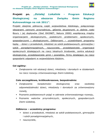 Projekt pn. „Działaj Lokalnie - Program Edukacji Ekologicznej na obszarze Związku Gmin Regionu Kutnowskiego”. Projekt „Działaj pn. Ekologicznej na Lokalnie obszarze - Program Edukacji Gmin Regionu Związku Kutnowskiego na rok 2011”. Projekt obejmie północną część województwa łódzkiego, połączonego obszarami cennymi przyrodniczo, głównie skupionymi w dolinie rzeki Bzury i jej dopływów (Sieć EKONET, Natura 2000) współpracą między organizacjami ekologicznymi, podobnymi problemami społecznymi, gospodarczymi i ekologicznymi. Odbiorcami – uczestnikami programu będą: - dzieci z przedszkoli, młodzież ze szkół podstawowych, gimnazjów i szkół ponadgimnazjalnych, nauczyciele, przedstawiciele organizacji społecznych działających na rzecz lokalnych środowisk, centra edukacji ekologicznej, przedstawiciele gmin i powiatów, firmy działające na rzecz gospodarki odpadami w województwie łódzkim. Cel ogólny: Zwiększenie roli edukacji dzieci, młodzieży i dorosłych w działaniach na rzecz rozwoju zrównoważonego Ziemi Łódzkiej. Cele szczegółowe, krótkookresowe, bezpośrednie: Zwiększenie świadomości ekologicznej oraz osobistej odpowiedzialności dzieci, młodzieży i dorosłych za zrównoważony rozwój, Poznanie podstawowych pojęć w zakresie zrównoważonego rozwoju, Poznanie walorów przyrodniczych, społecznych, gospodarczych Ziemi Łódzkiej. Odbiorca – uczestnicy programu: dzieci z przedszkoli, młodzież ze szkół podstawowych, gimnazjów i szkół ponadgimnazjalnych, nauczyciele, 1 Projekt pn. „Działaj Lokalnie - Program Edukacji Ekologicznej na obszarze Związku Gmin Regionu Kutnowskiego”. przedstawiciele organizacji społecznych działających na rzecz lokalnych środowisk, centra edukacji ekologicznej, przedstawiciele gmin i powiatów, firmy działające na rzecz gospodarki odpadami w województwie łódzkim. Partnerzy: - Przedsiębiorstwo Oczyszczania Miasta „Eko-Serwis” w Kutnie Ul. Łąkoszyńska 127, 99-300 Kutno Zakres współpracy: recykler – program selektywnej zbiórki odpadów - Reba – Organizacja Odzysku S .A. ul.Kubickiego 19 lok. 16, 02-954 Warszawa Zakres współpracy: recykler – program selektywnej zbiórki odpadów - Rekopol –Organizacja odzysku S. A. ul. Pory 59, 02-757 Warszawa Zakres współpracy: recykler – program selektywnej zbiórki odpadów - Regionalne Centrum Edukacji Ekologicznej w Płocku ul. Stary Rynek 20 09-400 Płock Zakres współpracy: Przeprowadzenie zajęć ekologicznych w ramach warsztatów plenerowych - Stowarzyszenie Rozwoju Gmin „CENTRUM” Nowe Ostrowy 80, 99-350 Ostrowy www.srgc.pl 2 Projekt pn. „Działaj Lokalnie - Program Edukacji Ekologicznej na obszarze Związku Gmin Regionu Kutnowskiego”. OPIS SZCZEGÓŁOWYCH ZADAŃ PRZYJĘTYCH DO REALIZACJI W ROKU 2011: Konkurs grantowy „Lokalni Liderzy Edukacji Ekologicznej” I. – konkurs adresowany do wszystkich placówek oświatowych / przedszkola, szkoły podstawowe, gimnazja/ zgłoszonych do projektu, uczniowie, młodzież, nauczyciele. a) data ogłoszenia konkursu: kwiecień 2011 r. b) data rozstrzygnięcia konkursu: maj 2011 r. c) realizacja projektów lokalnych w szkołach i podsumowanie w postaci warsztatów plenerowych – 8 nagrodzonych projektów i 8 jednodniowych warsztatów plenerowych – opisanych w pkt. II w miesiącach maj – wrzesień 2011 r. do uzgodnienia w placówkach Uczestnicy: „Lokalni bezpośredni Liderzy realizatorzy Edukacji projektów, Ekologicznej”, laureaci dzieci, konkursu młodzież, dorośli, społeczność lokalna ( ok. 400 osób na każdy warsztat plenerowy). Przedmiot konkursu: - Projekt edukacji ekologicznej w placówce oświatowej aktywizujący młodzież szkolną i całą społeczność lokalną do wspólnych działań na rzecz środowiska, - udział w warsztatach plenerowych, będących podsumowaniem prowadzonych działań, zajęć przez jednostki uczestniczące w projekcie. Szczegółowy opis: Placówka biorąca udział w konkursie grantowym wypełnia wniosek konkursowy przygotowany przez Związek Gmin Regionu Kutnowskiego. Celem konkursu wypracowanie ekologicznej lub w „Lokalni zgłoszenie placówce Liderzy już Edukacji realizowanego oświatowej. Jury Ekologicznej” projektu konkursowe jest edukacji wyłoni 8 3 Projekt pn. „Działaj Lokalnie - Program Edukacji Ekologicznej na obszarze Związku Gmin Regionu Kutnowskiego”. najlepszych pod względem merytorycznym i finansowym projektów i dofinansuje w postaci nagrody grantowej 8 projektów / po 2.000 zł./ Pomiędzy ZGRK a dotowanym zostanie podpisana umowa dotacji, na podstawie której zostanie wypłacona laureatowi grant pieniężny (rozliczenie z WFOŚiGW w postaci umowy, wyciągu bankowego i polecenia przelewu) Szczegółowy opis – regulamin konkursu zał. II. Warsztaty plenerowe -5 warsztatów plenerowych „ JA TY MY - Chrońmy klimat Ziemi” – warsztaty w ramach nagród w konkursie „Lokalni Liderzy Edukacji Ekologicznej” a) data warsztatów – maj – czerwiec – wrzesień 2011 r. godz. 10.00 – 15.00 ( 5 godz) b) miejsce organizacji warsztatów / do uzgodnienia z laureatami konkursu/. Uczestnicy: „Lokalni bezpośredni Liderzy Edukacji realizatorzy projektów, Ekologicznej”, dzieci, laureaci konkursu młodzież, dorośli, społeczność lokalna ( ok. 400 osób na każdy warsztat plenerowy). Sposób rekrutacji: bezpośrednie zaproszenia do szkół, informacje na stronach www. zgrk.pl, zaproszenia, media. Cel: zapoznanie z działaniami na rzecz ochrony klimatu. Program warsztatów: 1. Otwarcie warsztatów. 2. Podsumowanie wyników konkursu grantowego „Lokalni Liderzy Edukacji Ekologicznej”, wręczenie dyplomów dla szkół i nagród. 3. Prezentacja nagrodzonego projektu – szkoła, która wygrała konkurs. 4 Projekt pn. „Działaj Lokalnie - Program Edukacji Ekologicznej na obszarze Związku Gmin Regionu Kutnowskiego”. 4. Zajęcia warsztatowe przyrodnicze i artystyczno-przyrodnicze: - Jak