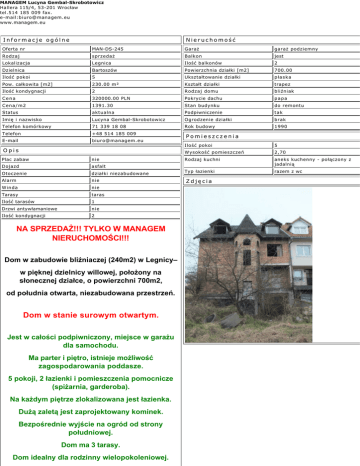 MANAGEM Lucyna Gembal-Skrobotowicz Hallera 115/4, 53-201 Wrocław tel.514 185 009 fax. e-mail:[email protected] www.managem.eu Informacje ogólne Nieruchomość Oferta nr MAN-DS-245 Garaż garaż podziemny Rodzaj sprzedaż Balkon jest Lokalizacja Legnica Ilość balkonów 2 Dzielnica Bartoszów Powierzchnia działki [m2] 700.00 Ilość pokoi 5 Ukształtowanie działki płaska Pow. całkowita [m2] 230.00 m² Kształt działki trapez Ilość kondygnacji 2 Rodzaj domu bliźniak Cena 320000.00 PLN Pokrycie dachu papa Cena/m2 1391.30 Stan budynku do remontu Status aktualna Podpiwniczenie tak Imię i nazwisko Lucyna Gembal-Skrobotowicz Ogrodzenie działki brak Telefon komórkowy 71 339 18 08 Rok budowy 1990 Telefon +48 514 185 009 E-mail [email protected] Opis Pomieszczenia Ilość pokoi 5 Wysokość pomieszczeń 2,70 Rodzaj kuchni aneks kuchenny - połączony z jadalnią razem z wc Plac zabaw nie Dojazd asfalt Otoczenie działki niezabudowane Typ łazienki Alarm nie Zdjęcia Winda nie Tarasy taras Ilość tarasów 1 Drzwi antywłamaniowe nie Ilość kondygnacji 2 NA SPRZEDAŻ!!! TYLKO W MANAGEM NIERUCHOMOŚCI!!! Dom w zabudowie bliźniaczej (240m2) w Legnicy– w pięknej dzielnicy willowej, położony na słonecznej działce, o powierzchni 700m2, od południa otwarta, niezabudowana przestrzeń. Dom w stanie surowym otwartym. Jest w całości podpiwniczony, miejsce w garażu dla samochodu. Ma parter i piętro, istnieje możliwość zagospodarowania poddasze. 5 pokoji, 2 łazienki i pomieszczenia pomocnicze (spiżarnia, garderoba). Na każdym piętrze zlokalizowana jest łazienka. Dużą zaletą jest zaprojektowany kominek. Bezpośrednie wyjście na ogród od strony południowej. Dom ma 3 tarasy. Dom idealny dla rodzinny wielopokoleniowej. Konstrukcja solidna, bardzo innowacyjna, jak na czasy budowy. Stropy monolityczne. Ściany wielowarstwowe z izolacją wewnątrz. Dom o niepowtarzalnym klimacie, w spokojnej okolicy, na dobrze doświetlonej działce. Sąsiedztwo bardzo zadbane. Dom składa się z dwóch kondygnacji: 1. Przyziemie (parter): ma dwa wejścia. Jedno od strony drogi dojazdowej, prowadzi do przedsionka (wiatrołapu). Drugie wejście na ogród zlokalizowane jest przy kuchni. Na parterze znajduje się duży salon (obniżony w stosunku do innych pomieszczeń), połączony z gabinetem. Duża widna kuchnia za spiżarnią. Osobny WC. 2. Kondygnacja druga: ma 3 duże pokoje, garderobę i salon łazienkowy. Dodatkowym atutem jest duży, słoneczny ogród, położony od strony południowej. Widok na otwartą przestrzeń – cisza i spokój!!! Cena: 320 000 zł (do negocjacji) POLECAM SERDECZNIE I ZAPRASZAM NA PREZENTACJĘ! BIURO NIERUCHOMOŚCI MANAGEM ul. Hallera 115/4 53-201 Wrocław Pośrednik odpowiedzialny zawodowo: nr licencji 20487 KONTAKT: AGNIESZKA ZIMNA tel. 533 355 788 © Wszelkie prawa zastrzeżone - Managem