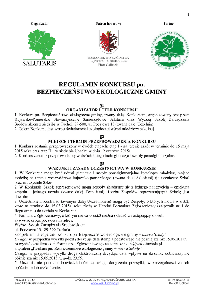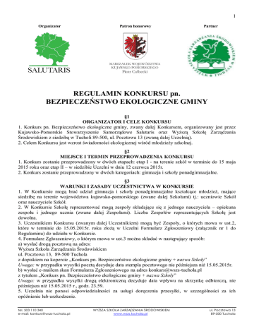 1 Organizator Patron honorowy Partner REGULAMIN KONKURSU pn. BEZPIECZEŃSTWO EKOLOGICZNE GMINY §1 ORGANIZATOR I CELE KONKURSU 1. Konkurs pn. Bezpieczeństwo ekologiczne gminy, zwany dalej Konkursem, organizowany jest przez Kujawsko-Pomorskie Stowarzyszenie Samorządowe Salutaris oraz Wyższą Szkołę Zarządzania Środowiskiem z siedzibą w Tucholi 89-500, ul. Pocztowa 13 (zwaną dalej Uczelnią). 2. Celem Konkursu jest wzrost świadomości ekologicznej wśród młodzieży szkolnej. §2 MIEJSCE I TERMIN PRZEPROWADZENIA KONKURSU 1. Konkurs zostanie przeprowadzony w dwóch etapach: etap I - na terenie szkół w terminie do 15 maja 2015 roku oraz etap II – w siedzibie Uczelni w dniu 12 czerwca 2015r. 2. Konkurs zostanie przeprowadzony w dwóch kategoriach: gimnazja i szkoły ponadgimnazjalne. §3 WARUNKI I ZASADY UCZESTNICTWA W KONKURSIE 1. W Konkursie mogą brać udział gimnazja i szkoły ponadgimnazjalne kształcące młodzież, mające siedzibę na terenie województwa kujawsko-pomorskiego (zwane dalej Szkołami) tj.: uczniowie Szkół oraz nauczyciele Szkół. 2. W Konkursie Szkołę reprezentować mogą zespoły składające się z jednego nauczyciela – opiekuna zespołu i jednego ucznia (zwane dalej Zespołami). Liczba Zespołów reprezentujących Szkołę jest dowolna. 3. Uczestnikiem Konkursu (zwanym dalej Uczestnikiem) mogą być Zespoły, o których mowa w ust.2, które w terminie do 15.05.2015r. roku złożą w Uczelni Formularz Zgłoszeniowy (załącznik nr 1 do Regulaminu) do udziału w Konkursie. 4. Formularz Zgłoszeniowy, o którym mowa w ust.3 można składać w następujący sposób: a) wysłać drogą pocztową na adres: Wyższa Szkoła Zarządzania Środowiskiem ul. Pocztowa 13, 89-500 Tuchola z dopiskiem na kopercie „Konkurs pn. Bezpieczeństwo ekologiczne gminy + nazwa Szkoły” Uwaga: w przypadku wysyłki pocztą decyduje data stempla pocztowego nie późniejsza niż 15.05.2015r. b) wysłać e-mailem skan Formularza Zgłoszeniowego na adres [email protected] z tytułem „Konkurs pn. Bezpieczeństwo ekologiczne gminy + nazwa Szkoły” Uwaga: w przypadku wysyłki drogą elektroniczną decyduje data wpływu na skrzynkę odbiorczą, nie późniejsza niż 15.05.2015 r., godz. 23.59. 5. Uczelnia nie ponosi odpowiedzialności za usługi doręczenia przesyłki, w szczególności za ich opóźnienie lub uszkodzenie. tel. 503 110 340 e-mail: [email protected] WYŻSZA SZKOŁA ZARZĄDZANIA ŚRODOWISKIEM www.wszs.tuchola.pl ul. Pocztowa 13 89-500 Tuchola 2 §4 PRZEBIEG I ROZSTRZYGNIĘCIE KONKURSU 1. W I etapie Uczestnicy zgłaszają do Konkursu prezentacje lub referaty pt.”Moja miejscowość bezpieczna ekologicznie” lub „Moja miejscowość niebezpieczna ekologicznie, czyli o źródłach zagrożeń zdrowia i życia mieszkańców”. 2. Dany Uczestnik może zgłosić tylko jedną pracę. 3. Uczestnicy Konkursu dostarczają do Uczelni przygotowane prace w formie papierowej i na nośniku cyfrowym w nieprzekraczalnym terminie do 15.05.2015 r. 4. Materiały nadesłane nie podlegają zwrotowi. 5. Koszty przygotowania i zgłaszania prac ponoszą Uczestnicy. 6. Prace należy wysłać drogą pocztową na adres: Wyższa Szkoła Zarządzania Środowiskiem ul. Pocztowa 13, 89-500 Tuchola z dopiskiem na kopercie „Konkurs pn. Bezpieczeństwo ekologiczne gminy + nazwa Szkoły” Uwaga: decyduje data stempla pocztowego nie późniejsza niż 15.05.2015r. 7. Zgłoszone prace będą podlegały ocenie zgodności z wymogami formalnymi oraz ocenie merytorycznej przez Komisję Konkursową powołaną przez Uczelnię, zwaną dalej Komisją. 8. Ocena merytoryczna prac zostanie przeprowadzona przez Komisję według kryteriów i skali punktowej określonych w §5 niniejszego Regulaminu. 9. W wyniku oceny przeprowadzonej przez Komisję każda praca uzyska liczbę punktów stanowiących sumę punktów przyznanych indywidualnie danej pracy przez poszczególnych członków Komisji. 10. Praca, która uzyska największą liczbę punktów będzie pracą najwyżej ocenioną przez Komisję. 11. Do II etapu Konkursu zakwalifikowanych zostanie po dziesięciu laureatów I etapu w każdej z kategorii: gimnazja i szkoły ponadgimnazjalne (zwanymi dalej Laureatami I Etapu) tj. 10 Uczestników z najwyższą liczbą punktów uzyskanych w etapie I Konkursu. 12. W przypadku, gdy więcej niż jedna praca uzyska, taką samą liczbę punktów, w wyniku czego liczba Laureatów przekroczy dziesięć, Komisja dokona wyboru dziesięciu najlepszych prac w wyniku głosowania. 13. W etapie II Konkursu wezmą udział tylko Laureaci I Etapu. 14. Etap II Konkursu ma charakter testu zamkniętego dotyczącego wiadomości ogólnych z zakresu bezpieczeństwa ekologicznego. 15. Wykaz zagadnień obowiązujących w etapie II Turnieju, kategoria gimnazja i kategoria szkoły ponadgimnazjalne: - Odnawialne źródła energii ( rodzaje, zastosowanie, efektywność) - Transport niskoemisyjny ( gdzie, rodzaje transportu,) - Ochrona wód ( ścieki, dyrektywna wodna, klasy czystości, zasoby wodne) - Ochrona powietrza, ( emisja C02, zapylenie, termomodernizacja, smog) - Gospodarka odpadami ( wysypiska, segregacja, rozwiniecie skrótu instalacji) - Rozwój zrównoważony ( pojęcie, zakres, uwarunkowania) - Ochrona krajobrazu i ochrona przyrody ( formy ochrony, pomniki przyrody) - Natura 2000 ( specyfika rozwiązań, kategoria przepisu) - Różnorodność biologiczna( ochrona gatunkowa zwierząt i roślin, chronione na danym obszarze gatunki) - Ochrona klimatu ( przyczyny, efekt cieplarniany, agendy, protokoły) - Instytucje ochrony środowiska( rodzaje, zadania) - Zasoby naturalne ( rodzaje, specyfika regionu, eksploatacja) - Żywność ekologiczna ( pojęcia, metody produkcji) - Bezpieczeństwo ekologiczne ( bezpieczeństwo jako kategoria społeczna, edukacja, informacja) §5 KRYTERIA OCENY PRAC 1.Prezentacje zostaną ocenione przez Komisję Konkursową zgodnie z poniższą skalą punktową: a) omówienie tematu: 0-4punktów; tel. 503 