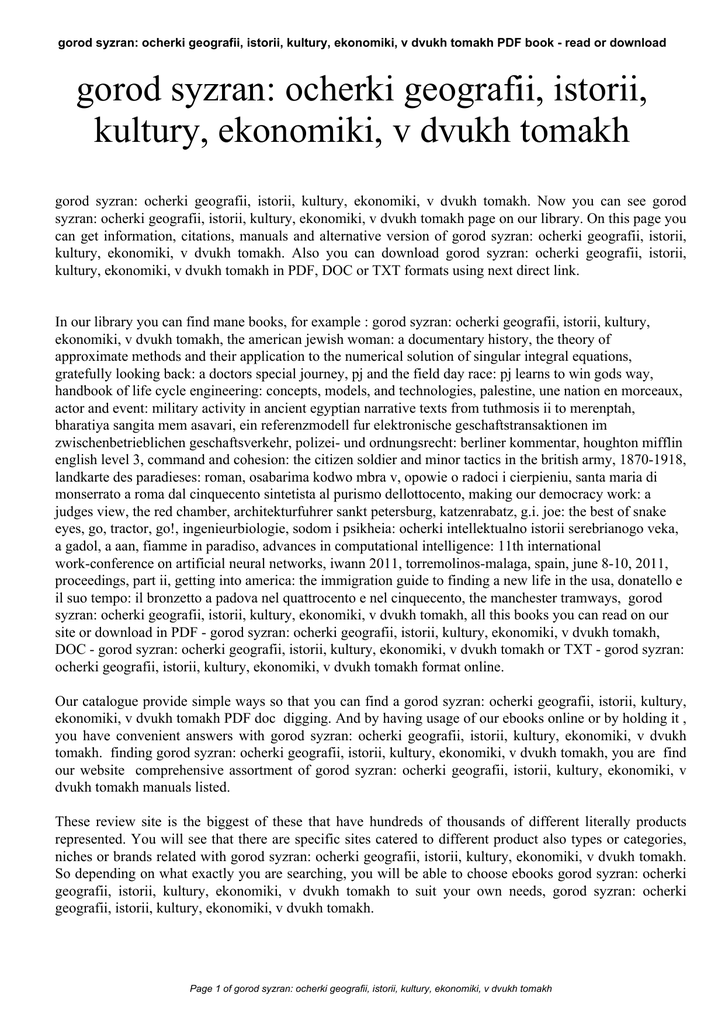 gorod syzran: ocherki geografii, istorii, kultury, ekonomiki, v dvukh tomakh PDF book - read or download gorod syzran: ocherki geografii, istorii, kultury, ekonomiki, v dvukh tomakh gorod syzran: ocherki geografii, istorii, kultury, ekonomiki, v dvukh tomakh. Now you can see gorod syzran: ocherki geografii, istorii, kultury, ekonomiki, v dvukh tomakh page on our library. On this page you can get information, citations, manuals and alternative version of gorod syzran: ocherki geografii, istorii, kultury, ekonomiki, v dvukh tomakh. Also you can download gorod syzran: ocherki geografii, istorii, kultury, ekonomiki, v dvukh tomakh in PDF, DOC or TXT formats using next direct link. In our library you can find mane books, for example : gorod syzran: ocherki geografii, istorii, kultury, ekonomiki, v dvukh tomakh, the american jewish woman: a documentary history, the theory of approximate methods and their application to the numerical solution of singular integral equations, gratefully looking back: a doctors special journey, pj and the field day race: pj learns to win gods way, handbook of life cycle engineering: concepts, models, and technologies, palestine, une nation en morceaux, actor and event: military activity in ancient egyptian narrative texts from tuthmosis ii to merenptah, bharatiya sangita mem asavari, ein referenzmodell fur elektronische geschaftstransaktionen im zwischenbetrieblichen geschaftsverkehr, polizei- und ordnungsrecht: berliner kommentar, houghton mifflin english level 3, command and cohesion: the citizen soldier and minor tactics in the british army, 1870-1918, landkarte des paradieses: roman, osabarima kodwo mbra v, opowie o radoci i cierpieniu, santa maria di monserrato a roma dal cinquecento sintetista al purismo dellottocento, making our democracy work: a judges view, the red chamber, architekturfuhrer sankt petersburg, katzenrabatz, g.i. joe: the best of snake eyes, go, tractor, go!, ingenieurbiologie, sodom i psikheia: ocherki intellektualno istorii serebrianogo veka, a gadol, a aan, fiamme in paradiso, advances in computational intelligence: 11th international work-conference on artificial neural networks, iwann 2011, torremolinos-malaga, spain, june 8-10, 2011, proceedings, part ii, getting into america: the immigration guide to finding a new life in the usa, donatello e il suo tempo: il bronzetto a padova nel quattrocento e nel cinquecento, the manchester tramways, gorod syzran: ocherki geografii, istorii, kultury, ekonomiki, v dvukh tomakh, all this books you can read on our site or download in PDF - gorod syzran: ocherki geografii, istorii, kultury, ekonomiki, v dvukh tomakh, DOC - gorod syzran: ocherki geografii, istorii, kultury, ekonomiki, v dvukh tomakh or TXT - gorod syzran: ocherki geografii, istorii, kultury, ekonomiki, v dvukh tomakh format online. Our catalogue provide simple ways so that you can find a gorod syzran: ocherki geografii, istorii, kultury, ekonomiki, v dvukh tomakh PDF doc digging. And by having usage of our ebooks online or by holding it , you have convenient answers with gorod syzran: ocherki geografii, istorii, kultury, ekonomiki, v dvukh tomakh. finding gorod syzran: ocherki geografii, istorii, kultury, ekonomiki, v dvukh tomakh, you are find our website comprehensive assortment of gorod syzran: ocherki geografii, istorii, kultury, ekonomiki, v dvukh tomakh manuals listed. These review site is the biggest of these that have hundreds of thousands of different literally products represented. You will see that there are specific sites catered to different product also types or categories, niches or brands related with gorod syzran: ocherki geografii, istorii, kultury, ekonomiki, v dvukh tomakh. So depending on what exactly you are searching, you will be able to choose ebooks gorod syzran: ocherki geografii, istorii, kultury, ekonomiki, v dvukh tomakh to suit your own needs, gorod syzran: ocherki geografii, istorii, kultury, ekonomiki, v dvukh tomakh. Page 1 of gorod syzran: ocherki geografii, istorii, kultury, ekonomiki, v dvukh tomakh