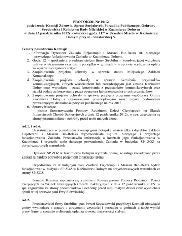 PROTOKOŁ Nr 20/12 posiedzenia Komisji Zdrowia, Spraw Socjalnych, Porządku Publicznego, Ochrony Środowiska i Rolnictwa Rady Miejskiej w Kazimierzu Dolnym w dniu 23 października 2012r. (wtorek) o godz. 11oo w Urzędzie Miasta w Kazimierzu Dolnym przy ul. Senatorskiej 5. Tematy posiedzenia Komisji: 1. Informacja Dyrektora Zakładu Fizjoterapii i Masażu Bio-Relax nt. bieżącego i przyszłego funkcjonowania Zakładu w Kazimierzu Dolnym. 2. Godz. 12 – spotkanie z przedstawicielem firmy Strobilus – koordynującej wdrożenie ustawy o utrzymaniu czystości i porządku w gminach – w sprawie wyliczenia opłaty za wywóz nieczystości stałych. 3. Zaopiniowanie projektu uchwały w sprawie statutu Miejskiego Zakładu Komunalnego. 4. Zaopiniowanie projektu uchwały w sprawie określenia przystanków komunikacyjnych, których właścicielem lub zarządzającym jest Gmina Kazimierz Dolny oraz warunków i zasad korzystania z przystanków komunikacyjnych oraz stawki opłaty za korzystanie przez operatora lub przewoźnika z tych przystanków. 5. Zaopiniowanie projektu uchwały w sprawie przyjęcia programu współpracy Gminy Kazimierz Dolny z organizacjami pozarządowymi oraz innymi podmiotami prowadzącymi działalność pożytku publicznego na rok 2013. 6. Sprawy bieżące. – pismo Stowarzyszenia Pomocy Rodzinom Dzieci Cierpiących na Skutek Inwazyjnych Chorób Bakteryjnych z dnia 12 października 2012r. w spr. zagrożenia ze strony pneumokoków i ochrony przed nimi małych dzieci. Ad.1. i Ad.6. Uczestnicząca w posiedzeniu Komisji pani Potapska właścicielka i dyrektor Zakładu Fizjoterapii i Masażu Bio-Relaks wypowiedziała się nt. bieżącego i przyszłego funkcjonowania Zakładu. Przedstawiła informację o kosztach jego funkcjonowania w Kazimierzu i wyraziła wolę dalszego prowadzenia Zakładu w budynku SP ZOZ na dotychczasowych warunkach. Dyrektor SP ZOZ w Kazimierzu Dolnym wyraziła opinię, że usługi świadczone przez Zakład są bardzo potrzebne pacjentom z naszego terenu. Uzgodniono, że w kolejnym roku Zakładu Fizjoterapii i Masażu Bio-Relax będzie funkcjonował w budynku SP ZOZ w Kazimierzu Dolnym na dotychczasowych warunkach ze strony SP ZOZ. Ponadto Komisja zapoznała się z pismem Stowarzyszenia Pomocy Rodzinom Dzieci Cierpiących na Skutek Inwazyjnych Chorób Bakteryjnych z dnia 12 października 2012r. w spr. zagrożenia ze strony pneumokoków i ochrony przed nimi małych dzieci oraz wysłuchała opinii w tej sprawie pani Ewy Słotwińskiej. Ad.2. Przedstawiciel firmy Strobilus pan Paweł Szyszkowski przybliżył Komisji obowiązki gminy wynikające z ustawy o utrzymaniu czystości i porządku w gminach a także wyniki pracy firmy w sprawie wyliczenia opłat za wywóz nieczystości stałych. Komisja wyraziła opinię, że w gminie Kazimierz Dolny powinien funkcjonować jednolity system odbioru nieczystości – wynik głosowania: 7 gł. „za”, 0 gł. „przeciw”, 0 „wstrzymało się od głosu”. Ad.3. Komisja zaopiniowała pozytywnie projektu uchwały w sprawie statutu Miejskiego Zakładu Komunalnego wynik głosowania: 6 gł. „za”, 0 gł. „przeciw”, 1 „wstrzymał się od głosu”. Ad.4. Komisja zaopiniowała pozytywnie projekt uchwały w sprawie określenia przystanków komunikacyjnych, których właścicielem lub zarządzającym jest Gmina Kazimierz Dolny oraz warunków i zasad korzystania z przystanków komunikacyjnych oraz stawki opłaty za korzystanie przez operatora lub przewoźnika z tych przystanków, z sugestią dopisania do wykazu przystanków, przystanku przy koszarce. Wynik głosowania: 7 gł. „za”, 0 gł. „przeciw”, 0 „wstrzymało się od głosu”. Ad.5. Komisja zaopiniowała pozytywnie projekt uchwały w sprawie przyjęcia programu współpracy Gminy Kazimierz Dolny z organizacjami pozarządowymi oraz innymi podmiotami prowadzącymi działalność pożytku publicznego na rok 2013. – wynik głosowania: 7 gł. „za”, 0 gł. „przeciw”, 0 „wstrzymało się od głosu”. Przewodniczący Komisji Mirosław Opoka