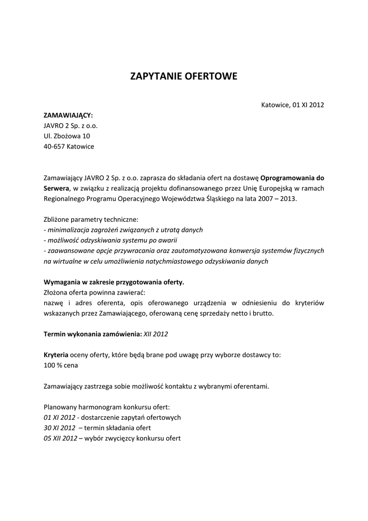 ZAPYTANIE OFERTOWE Katowice, 01 XI 2012 ZAMAWIAJĄCY: JAVRO 2 Sp. z o.o. Ul. Zbożowa 10 40-657 Katowice Zamawiający JAVRO 2 Sp. z o.o. zaprasza do składania ofert na dostawę Oprogramowania do Serwera, w związku z realizacją projektu dofinansowanego przez Unię Europejską w ramach Regionalnego Programu Operacyjnego Województwa Śląskiego na lata 2007 – 2013. Zbliżone parametry techniczne: - minimalizacja zagrożeń związanych z utratą danych - możliwość odzyskiwania systemu po awarii - zaawansowane opcje przywracania oraz zautomatyzowana konwersja systemów fizycznych na wirtualne w celu umożliwienia natychmiastowego odzyskiwania danych Wymagania w zakresie przygotowania oferty. Złożona oferta powinna zawierać: nazwę i adres oferenta, opis oferowanego urządzenia w odniesieniu do kryteriów wskazanych przez Zamawiającego, oferowaną cenę sprzedaży netto i brutto. Termin wykonania zamówienia: XII 2012 Kryteria oceny oferty, które będą brane pod uwagę przy wyborze dostawcy to: 100 % cena Zamawiający zastrzega sobie możliwość kontaktu z wybranymi oferentami. Planowany harmonogram konkursu ofert: 01 XI 2012 - dostarczenie zapytań ofertowych 30 XI 2012 – termin składania ofert 05 XII 2012 – wybór zwycięzcy konkursu ofert Termin składania ofert. Odpowiedzi na zapytanie ofertowe będą przyjmowane do dnia 30 XI 2012 do godziny 12:00 Pod uwagę będą brane oferty, które wpłyną do biura zamawiającego w w/w terminie. Odpowiedź na zapytanie ofertowe można przesłać następująco: a) na adres e-mail: [email protected] lub [email protected] osobiście w siedzibie spółki b) Dodatkowe wymagania. Zamawiający zastrzega sobie prawo do odmowy przyjęcia dostarczonej oferty, do zmiany warunków konkursu oraz do unieważnienia opublikowanego zaproszenia do składania ofert w dowolnej chwili procedury konkursowej. Zamawiający: Jacek Wrodarczyk Prezes Zarządu