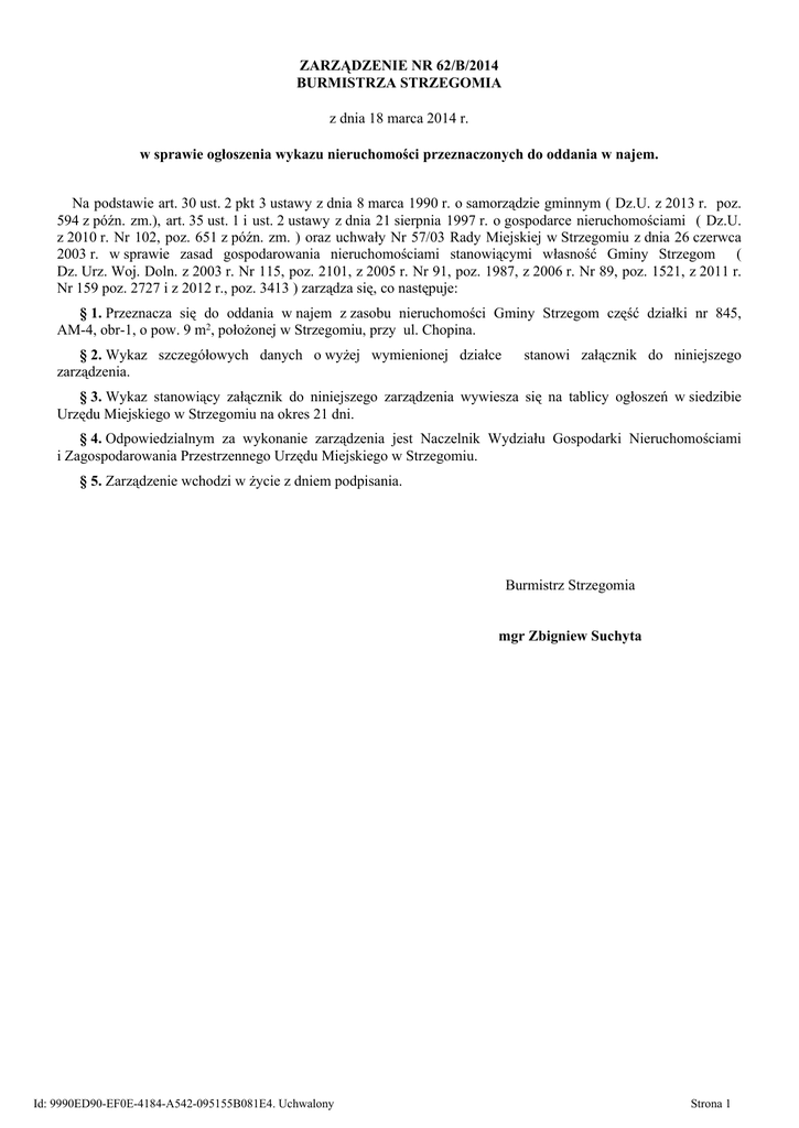 ZARZĄDZENIE NR 62/B/2014 BURMISTRZA STRZEGOMIA z dnia 18 marca 2014 r. w sprawie ogłoszenia wykazu nieruchomości przeznaczonych do oddania w najem. Na podstawie art. 30 ust. 2 pkt 3 ustawy z dnia 8 marca 1990 r. o samorządzie gminnym ( Dz.U. z 2013 r. poz. 594 z późn. zm.), art. 35 ust. 1 i ust. 2 ustawy z dnia 21 sierpnia 1997 r. o gospodarce nieruchomościami ( Dz.U. z 2010 r. Nr 102, poz. 651 z późn. zm. ) oraz uchwały Nr 57/03 Rady Miejskiej w Strzegomiu z dnia 26 czerwca 2003 r. w sprawie zasad gospodarowania nieruchomościami stanowiącymi własność Gminy Strzegom ( Dz. Urz. Woj. Doln. z 2003 r. Nr 115, poz. 2101, z 2005 r. Nr 91, poz. 1987, z 2006 r. Nr 89, poz. 1521, z 2011 r. Nr 159 poz. 2727 i z 2012 r., poz. 3413 ) zarządza się, co następuje: § 1. Przeznacza się do oddania w najem z zasobu nieruchomości Gminy Strzegom część działki nr 845, AM-4, obr-1, o pow. 9 m2, położonej w Strzegomiu, przy ul. Chopina. § 2. Wykaz szczegółowych danych o wyżej wymienionej działce zarządzenia. stanowi załącznik do niniejszego § 3. Wykaz stanowiący załącznik do niniejszego zarządzenia wywiesza się na tablicy ogłoszeń w siedzibie Urzędu Miejskiego w Strzegomiu na okres 21 dni. § 4. Odpowiedzialnym za wykonanie zarządzenia jest Naczelnik Wydziału Gospodarki Nieruchomościami i Zagospodarowania Przestrzennego Urzędu Miejskiego w Strzegomiu. § 5. Zarządzenie wchodzi w życie z dniem podpisania. Burmistrz Strzegomia mgr Zbigniew Suchyta Id: 9990ED90-EF0E-4184-A542-095155B081E4. Uchwalony Strona 1 Załącznik do Zarządzenia Nr 62/B/2014 Burmistrza Strzegomia z dnia 18 marca 2014 r. Wykaz nieruchomości przeznaczonych do oddania w najem L.p. Oznaczenie nieruchomości 1. Działka nr 845, AM-4, obr-1, w Strzegomiu przy ul. Chopina. Pow. 9 m2 Id: 9990ED90-EF0E-4184-A542-095155B081E4. Uchwalony Opis nieruchomości Forma oddania nieruchomości Grunty pod komórką. Najem na czas nie oznaczony. Wysokość opłat Warunki zmiany i termin ich wysokości czynszu wnoszenia Czynsz 1,05 zł./m2 + Czynsz regulowany na 23 % VAT podstawie Zarządzenia w skali miesiąca. Burmistrza Strzegomia. Miesięczny czynsz płatny do 20 dnia każdego miesiąca. Rozwiązanie umowy Na podstawie wypowiedzenia, zachowując jednomiesięczny okres wypowiedzenia. Strona 1 UZASADNIENIE do ZARZĄZENIA Nr 62/B/2014 BURMISTRZA STRZEGOMIA z dnia 18 marca 2014 r. w sprawie ogłoszenia wykazu nieruchomościprzeznaczonychdo oddania w najem. Zgodnie z art. 35 ust. 1 i ust. 2 ustawy z dnia 21 sierpnia 1997 r. o gospodarce nieruchomościami ( Dz.U. z 2010 r. Nr 102, poz. 651 z późn. zm. ) Burmistrz Strzegomia jest zobowiązany do sporządzania i podania do publicznej wiadomości wykazu nieruchomości przeznaczonych do oddania w najem. W związku z powyższym wydanie niniejszegozarządzenia jest uzasadnione. Id: 9990ED90-EF0E-4184-A542-095155B081E4. Uchwalony Strona 1