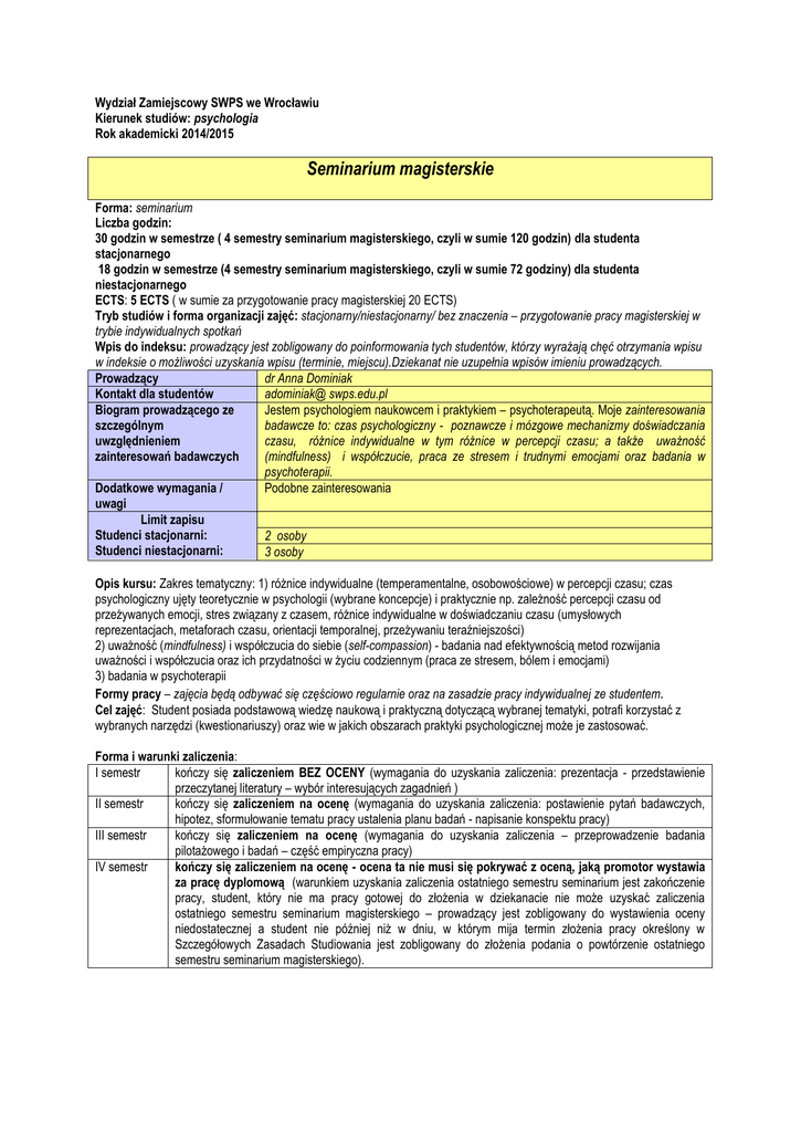 Wydział Zamiejscowy SWPS we Wrocławiu Kierunek studiów: psychologia Rok akademicki 2014/2015 Seminarium magisterskie Forma: seminarium Liczba godzin: 30 godzin w semestrze ( 4 semestry seminarium magisterskiego, czyli w sumie 120 godzin) dla studenta stacjonarnego 18 godzin w semestrze (4 semestry seminarium magisterskiego, czyli w sumie 72 godziny) dla studenta niestacjonarnego ECTS: 5 ECTS ( w sumie za przygotowanie pracy magisterskiej 20 ECTS) Tryb studiów i forma organizacji zajęć: stacjonarny/niestacjonarny/ bez znaczenia – przygotowanie pracy magisterskiej w trybie indywidualnych spotkań Wpis do indeksu: prowadzący jest zobligowany do poinformowania tych studentów, którzy wyrażają chęć otrzymania wpisu w indeksie o możliwości uzyskania wpisu (terminie, miejscu).Dziekanat nie uzupełnia wpisów imieniu prowadzących. Prowadzący dr Anna Dominiak Kontakt dla studentów adominiak@ swps.edu.pl Biogram prowadzącego ze Jestem psychologiem naukowcem i praktykiem – psychoterapeutą. Moje zainteresowania szczególnym badawcze to: czas psychologiczny - poznawcze i mózgowe mechanizmy doświadczania uwzględnieniem czasu, różnice indywidualne w tym różnice w percepcji czasu; a także uważność zainteresowań badawczych (mindfulness) i współczucie, praca ze stresem i trudnymi emocjami oraz badania w psychoterapii. Dodatkowe wymagania / Podobne zainteresowania uwagi Limit zapisu Studenci stacjonarni: 2 osoby Studenci niestacjonarni: 3 osoby Opis kursu: Zakres tematyczny: 1) różnice indywidualne (temperamentalne, osobowościowe) w percepcji czasu; czas psychologiczny ujęty teoretycznie w psychologii (wybrane koncepcje) i praktycznie np. zależność percepcji czasu od przeżywanych emocji, stres związany z czasem, różnice indywidualne w doświadczaniu czasu (umysłowych reprezentacjach, metaforach czasu, orientacji temporalnej, przeżywaniu teraźniejszości) 2) uważność (mindfulness) i współczucia do siebie (self-compassion) - badania nad efektywnością metod rozwijania uważności i współczucia oraz ich przydatności w życiu codziennym (praca ze stresem, bólem i emocjami) 3) badania w psychoterapii Formy pracy – zajęcia będą odbywać się częściowo regularnie oraz na zasadzie pracy indywidualnej ze studentem. Cel zajęć: Student posiada podstawową wiedzę naukową i praktyczną dotyczącą wybranej tematyki, potrafi korzystać z wybranych narzędzi (kwestionariuszy) oraz wie w jakich obszarach praktyki psychologicznej może je zastosować. Forma i warunki zaliczenia: I semestr kończy się zaliczeniem BEZ OCENY (wymagania do uzyskania zaliczenia: prezentacja - przedstawienie przeczytanej literatury – wybór interesujących zagadnień ) II semestr kończy się zaliczeniem na ocenę (wymagania do uzyskania zaliczenia: postawienie pytań badawczych, hipotez, sformułowanie tematu pracy ustalenia planu badań - napisanie konspektu pracy) III semestr kończy się zaliczeniem na ocenę (wymagania do uzyskania zaliczenia – przeprowadzenie badania pilotażowego i badań – część empiryczna pracy) IV semestr kończy się zaliczeniem na ocenę - ocena ta nie musi się pokrywać z oceną, jaką promotor wystawia za pracę dyplomową (warunkiem uzyskania zaliczenia ostatniego semestru seminarium jest zakończenie pracy, student, który nie ma pracy gotowej do złożenia w dziekanacie nie może uzyskać zaliczenia ostatniego semestru seminarium magisterskiego – prowadzący jest zobligowany do wystawienia oceny niedostatecznej a student nie później niż w dniu, w którym mija termin złożenia pracy określony w Szczegółowych Zasadach Studiowania jest zobligowany do złożenia podania o powtórzenie ostatniego semestru seminarium magisterskiego). LITERATURA Nosal C. S., Bajcar B. (2004). Czas psychologiczny: wymiary, struktura, konsekwencje. Warszawa: Wydawnictwo Instytutu Psychologii PAN. Pöppel E. (1989). Granice świadomości: O rzeczywistości i doznawaniu świata. Warszawa: PIW. Sędek i S. Bedyńska (red.) Życie na czas. Perspektywy badawcze postrzegania czasu . Warszawa: Wyd. PWN. Zimbardo, P. ,G. i Boyd, J., N. (2009). Paradoks czasu. Warszawa: Wyd. Naukowe PWN Aveni A. (2001). Imperia czasu: Kalendarze, zegary i kultury. Poznań: Zysk i S-ka. Block R. A. (1990). Models of psychological time. [w:] R.A. Block (red.), Cognitive models of psychological time (37- 58). Hilldale, NJ: Erlbaum. Block R.A., Zakay D. (1996). Models of psychological time revisited. [w:] H. Helfrich (red.). Time & Mind (171 195). Boski P. (2010). Kulturowe ramy zachowań społecznych. Warszawa: Wyd. PWN. Clayton M. (2011). Zarządzanie czasem jak efektywnie planować i realizować zadania. Warszawa: samo sedno Damasio A.R. (2002a). Pamięć czasu. Świat Nauki, 135, 48 – 55. Damasio A.R. (2002b). Błąd Kartezjusza. Emocje, rozum i ludzki mózg. Poznań: Rebis. Fraisse, P. (1991). Percepcja i ocean czasu. W: P. Fraisse i J. Piaget (red.). Zarys psychologii eksperymentalnej (s.243 – 283). Warszawa: PWN. Dominiak, A. i Nosal, C. ,S. (2008). Rola mechanizmy temporalnej integracji poznawczej, afektu i wyobraźni w procesie przewidywania zdarzeń przyszłych. Przegląd Psychologiczny, 51, 2, 215- 233. Dominiak, A. i Nosal, S., C. (2010). Rola mechanizmu temporalnej integracji w konstruowaniu czasu przyszłego. W: G. Sędek i S. Bedyńska (red.) Życie na czas. Perspektywy badawcze postrzegania czasu (s. 231 – 249). Warszawa: Wyd. Naukowe PWN. Eriksen, T. H. (2004). Tyrania chwili: Szybko i wolno płynący czas w erze informacji. Warszawa: PIW Fontana D. (1999). Zarządzanie czasem. Warszawa: PWN Gleick J. (2003). Szybciej. Przyspieszenie niemal wszystkiego. Poznań: Zysk i S-ka. Kanabus, M., Kołodziejczyk, I., Kowalska, J., Szeląg, E. i Szuchnik, J. (2004). Individual differences in temporal information processing in human. Acta Neurobiologiae Experimentalis, 64, 349-366. Kabat-Zinn J.; Siegal Z. Teasdale J. i Williams M. (2009). Świadomą drogą przez de