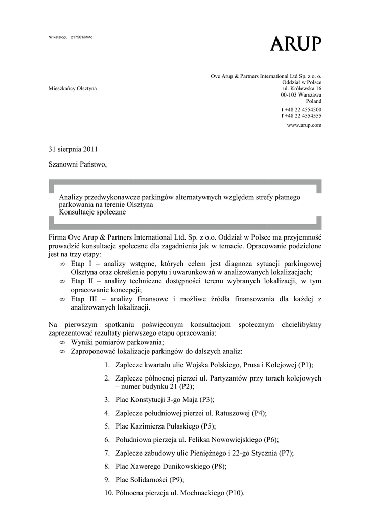 Nr katalogu 217561/MMo Ove Arup & Partners International Ltd Sp. z o. o. Oddział w Polsce ul. Królewska 16 00-103 Warszawa Poland Mieszkańcy Olsztyna t +48 22 4554500 f +48 22 4554555 www.arup.com 31 sierpnia 2011 Szanowni Państwo, Analizy przedwykonawcze parkingów alternatywnych względem względem strefy płatnego parkowania na terenie Olsztyna Konsultacje społeczne Firma Ove Arup & Partners International Ltd. Sp. z o.o. Oddział w Polsce ma przyjemność prowadzić konsultacje społeczne dla zagadnienia zagadn jak w temacie. Opracowanie podzielone jest na trzy etapy: • Etap I – analizy wstępne, wstę których celem jest diagnoza sytuacji parkingowej Olsztyna oraz określenie ślenie popytu i uwarunkowań uwarunkowa w analizowanych lokalizacjach; • Etap II – analizy techniczne dostępności dost terenu wybranych lokalizacji, lokalizacji w tym opracowanie koncepcji; koncepcji • Etap III – analizy finansowe i możliwe źródła ródła finansowania dla każdej z analizowanych lokalizacji. lokalizacji Na pierwszym spotkaniu poświęconym po conym konsultacjom społecznym zaprezentować rezultaty pierwszego etapu opracowania: • Wyniki pomiarów parkowania; • Zaproponowaćć lokalizacje parkingów do dalszych analiz: chcielibyśmy 1. Zaplecze kwartału ulic Wojska Polskiego, Prusa i Kolejowej (P1); 2. Zaplecze północnej pierzei ul. Partyzantów przy torach kolejowych – numer budynku budy 21 (P2); 3. Plac Konstytucji 3-go 3 Maja (P3); 4. Zaplecze południowej pierzei ul. Ratuszowej (P4); 5. Plac Kazimierza Pułaskiego (P5); 6. Południowa pierzeja ul. Feliksa Nowowiejskiego (P6); 7. Zaplecze zabudowy ulic Pieniężnego Pieni i 22-go go Stycznia (P7); 8. Plac Xawerego Dunikowskiego Du (P8); 9. Plac Solidarności Solidarno (P9); 10. Północna pierzeja ul. Mochnackiego (P10). 217561/MMo Strona 2 z 3 31 sierpnia 2011 W załączeniu przekazujemy materiały graficzne: • Konsultacje Plansza 01 – analiza stanu istniejącego wraz z wskazaniem miejsc, gdzie występują problemy związane z parkowaniem; o Punkt nr 1 – plac K. Pułaskiego ul. M. Kopernika Duży popyt na parkowanie spowodowany znaczną liczbą usług w okolicy oraz brakiem odpowiedniej liczby miejsc postojowych dla mieszkańców. o Punkt nr 2 – ul. Dąbrowszczaków Brak miejsc postojowych dla mieszkańców. o Punkty nr 3 i 4 – ul. M. Kopernika i plac X. Dunikowskiego Parkingi dla pracowników i interesantów pobliskich urzędów. Brak opłat w za parkowanie na pl. Dunikowskiego powoduje, że lokalizacja ta charakteryzuje się bardzo dużym popytem. o Punkt nr 5 – ul. Dąbrowszczaków Parking wykorzystywany przez mieszkańców, a także pracowników i klientów CH Alfa. Brak opłat w tej lokalizacji powoduje, że jest bardziej atrakcyjna niż parking kryty w centrum handlowym. o Punkt nr 6 – ul. Nowowiejskiego W lokalizacji tej miejsca postojowego szukają wszyscy, którzy chcą udać się na Stare Miasto lub w jego okolice. o Punkt nr 7 – ul. Mochnackiego Parking wykorzystywany przez turystów oraz pracowników i klientów pobliskich usług. Również jako drugi strategiczny parking dla Starego Miasta. W roku akademickim zdarzają się pracownicy i studenci pobliskiego wydziału Uniwersytetu. • Konsultacje Plansza 02 – proponowane lokalizacje parkingów 1. Zaplecze kwartału ulic Wojska Polskiego, Prusa i Kolejowej (P1) Parking dla mieszkańców i klientów pobliskich usług. Również w ramach bilansowania liczby miejsc utraconych w wyniku przebudowy Al. Wojska Polskiego. 2. Zaplecze północnej pierzei ul. Partyzantów przy torach kolejowych – numer budynku 21 (P2) Parking dla mieszkańców i jako rekompensata za miejsca utracone w wyniku przebudowy ul. Partyzantów. 3. Plac Konstytucji 3-go Maja (P3) Precyzyjna funkcja parkingu będzie możliwa do ocenienia po poznaniu planów PKP i PKS dotyczących zagospodarowania terenów przy dworcach. Wstępne założenia wskazują na parking dla osób podwożących/odbierających podróżnych z dworca. 4. Zaplecze południowej pierzei ul. Ratuszowej (P4) 217561/MMo Strona 3 z 3 31 sierpnia 2011 Parking dla pracowników Ratusza Miejskiego i mieszkańców. 5. Plac Kazimierza Pułaskiego (P5) Parking dla klientów CH Manhattan i okolicznych usług jak również dla mieszkańców ul. M. Kopernika oraz bilansujący liczbę miejsc parkingowych likwidowanych podczas budowy linii tramwajowej na ul. Kościuszki. 6. Południowa pierzeja ul. Feliksa Nowowiejskiego (P6) Parking dla pracowników, mieszkańców Starego Miasta i turystów. 7. Zaplecze zabudowy ulic Pieniężnego i 22-go Stycznia (P7) Parking dla mieszkańców okolicznej zabudowy wielorodzinnej. 8. Plac Xawerego Dunikowskiego (P8) Parking dla interesantów Urzędu Marszałkowskiego i Wyższego Sądu Administracyjnego. 9. Plac Solidarności (P9) Parking dla pracowników Urzędu Marszałkowskiego i Wyższego Sądu Administracyjnego, a także dla mieszkańców i klientów okolicznych banków. 10. Północna pierzeja ul. Mochnackiego (P10) Parking dla mieszkańców Starego Miasta i turystów.