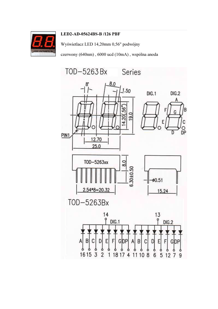 LED2-AD-05624BS-B /126 PBF Wyświetlacz LED 14,20mm 0,56" podwójny czerwony (640nm) , 6000 ucd (10mA) , wspólna anoda