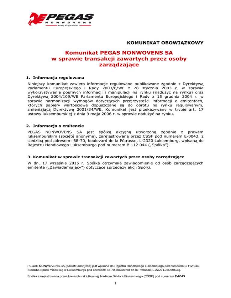 KOMUNIKAT OBOWIĄZKOWY Komunikat PEGAS NONWOVENS SA w sprawie transakcji zawartych przez osoby zarządzające 1. Informacja regulowana Niniejszy komunikat zawiera informacje regulowane publikowane zgodnie z Dyrektywą Parlamentu Europejskiego i Rady 2003/6/WE z 28 stycznia 2003 r. w sprawie wykorzystywania poufnych informacji i manipulacji na rynku (nadużyć na rynku) oraz Dyrektywą 2004/109/WE Parlamentu Europejskiego i Rady z 15 grudnia 2004 r. w sprawie harmonizacji wymogów dotyczących przejrzystości informacji o emitentach, których papiery wartościowe dopuszczane są do obrotu na rynku regulowanym, zmieniającą Dyrektywę 2001/34/WE. Komunikat jest przekazywany w trybie art. 17 ustawy luksemburskiej z dnia 9 maja 2006 r. w sprawie nadużyć na rynku. 2. Informacja o emitencie PEGAS NONWOVENS SA jest spółką akcyjną utworzoną zgodnie z prawem luksemburskim (société anonyme), zarejestrowaną przez CSSF pod numerem E-0043, z siedzibą pod adresem: 68-70, boulevard de la Pétrusse, L-2320 Luksemburg, wpisaną do Rejestru Handlowego Luksemburga pod numerem B 112 044 („Spółka”). 3. Komunikat w sprawie transakcji zawartych przez osoby zarządzające W dn. 17 września 2015 r. Spółka otrzymała zawiadomienie od osób zarządzających emitenta („Zawiadamiający”) dotyczące sprzedaży akcji Spółki. PEGAS NONWOVENS SA (société anonyme) jest wpisana do Rejestru Handlowego Luksemburga pod numerem B 112.044. Siedziba Spółki mieści się w Luksemburgu pod adresem: 68-70, boulevard de la Pétrusse, L-2320 Luksemburg. Spółka zarejestrowana przez luksemburską Komisję Nadzoru Sektora Finansowego (CSSF) pod numerem E-0043 1 4. Szczegółowe zarządzające informacje dotyczące Imię i nazwisko Zawiadamiającego Funkcja/charakter powiązania z emitentem Nazwa emitenta papierów wartościowych Instrument bazowy / ISIN Opis instrumentu finansowego Charakter transakcji Miejsce transakcji Data transakcji Średnia cena transakcyjna w CZK: Wolumen transakcji (liczba akcji) Imię i nazwisko Zawiadamiającego Funkcja/charakter powiązania z emitentem Nazwa emitenta papierów wartościowych Instrument bazowy / ISIN Opis instrumentu finansowego Charakter transakcji Miejsce transakcji Data transakcji Średnia cena transakcyjna w CZK: Wolumen transakcji (liczba akcji) Imię i nazwisko Zawiadamiającego Funkcja/charakter powiązania z emitentem Nazwa emitenta papierów wartościowych Instrument bazowy / ISIN Opis instrumentu finansowego Charakter transakcji Miejsce transakcji Data transakcji Średnia cena transakcyjna w CZK: Wolumen transakcji (liczba akcji) transakcji zawartych przez osoby František Řezáč Członek Rady Dyrektorów PEGAS NONWOVENS SA Akcja/LU0275164910 Akcja Zbycie Giełda Papierów Wartościowych w Pradze 14/09/15 15/09/15 16/09/15 887,55 884,66 887,99 7 490 7 490 9 859 František Klaška Członek Rady Dyrektorów PEGAS NONWOVENS SA Akcja/LU0275164910 Akcja Zbycie Giełda Papierów Wartościowych w Pradze 14/09/15 15/09/15 16/09/15 887,55 884,66 887,99 9 485 9 485 12 482 Rostislav Vrbácký Osoba zarządzająca emitenta PEGAS NONWOVENS SA Akcja/LU0275164910 Akcja Zbycie Giełda Papierów Wartościowych w Pradze 14/09/15 15/09/15 16/09/15 887,55 884,66 887,99 3 025 3 025 3 982 PEGAS NONWOVENS SA (société anonyme) jest wpisana do Rejestru Handlowego Luksemburga pod numerem B 112.044. Siedziba Spółki mieści się w Luksemburgu pod adresem: 68-70, boulevard de la Pétrusse, L-2320 Luksemburg. Spółka zarejestrowana przez luksemburską Komisję Nadzoru Sektora Finansowego (CSSF) pod numerem E-0043 2 18 września 2015 r. Jan Židek Kierownik sprawozdawczości zewnętrznej PEGAS NONWOVENS Nr tel.: +420 515 262 408 Nr tel. kom.: +420 727 964 218 [email protected] PEGAS NONWOVENS SA, société anonyme, jest spółką holdingową z siedzibą w Luksemburgu, posiadającą spółki operacyjne w miastach Znojmo i Bučovice w Czechach oraz w Mieście 6 Października w Egipcie. PEGAS NONWOVENS jest producentem włóknin polipropylenowych i polietylenowych dla sektora higienicznego, przemysłowego, budowlanego, rolniczego, medycznego i innych wyspecjalizowanych sektorów. Włókniny te wykorzystywane są przede wszystkim do produkcji pieluch dziecięcych, artykułów higienicznych dla kobiet i artykułów higienicznych dla osób dorosłych cierpiących na inkontynencję. Spółka aktywnie opracowuje nowe produkty, na które istnieje popyt na rynku, dzięki czemu utrzymuje pozycję technologicznego lidera na europejskim rynku włóknin. Obecnie PEGAS NONWOVENS zatrudnia około 570 pracowników. Akcje PEGAS NONWOVENS SA notowane są na giełdach papierów wartościowych w Pradze i Warszawie. PEGAS NONWOVENS SA (société anonyme) jest wpisana do Rejestru Handlowego Luksemburga pod numerem B 112.044. Siedziba Spółki mieści się w Luksemburgu pod adresem: 68-70, boulevard de la Pétrusse, L-2320 Luksemburg. Spółka zarejestrowana przez luksemburską Komisję Nadzoru Sektora Finansowego (CSSF) pod numerem E-0043 3