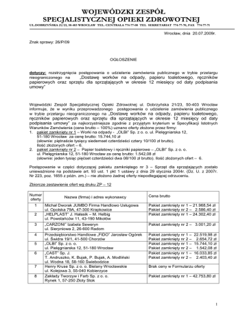 WOJEWÓDZKI ZESPÓŁ SPECJALISTYCZNEJ OPIEKI ZDROWOTNEJ UL.DOBRZYŃSKA 21/23, 50-403 WROCŁAW TEL. CENTRALA 774-77-00 TEL SEKRETARIAT 774-77-70, FAX 774-77-71 Wrocław, dnia 20.07.2009r. Znak sprawy: 26/P/09 OGŁOSZENIE dotyczy: rozstrzygnięcia postępowania o udzielenie zamówienia publicznego w trybie przetargu nieograniczonego na „Dostawę worków na odpady, papieru toaletowego, ręczników papierowych oraz sprzętu dla sprzątających w okresie 12 miesięcy od daty podpisania umowy” Wojewódzki Zespół Specjalistycznej Opieki Zdrowotnej ul. Dobrzyńska 21/23, 50-403 Wrocław informuje, Ŝe w wyniku przeprowadzonego postępowania o udzielenie zamówienia publicznego w trybie przetargu nieograniczonego na „Dostawę worków na odpady, papieru toaletowego, ręczników papierowych oraz sprzętu dla sprzątających w okresie 12 miesięcy od daty podpisania umowy” za najkorzystniejsze zgodnie z przyjętym kryterium w Specyfikacji Istotnych Warunków Zamówienia (cena brutto – 100%) uznano oferty złoŜone przez firmy: 1. pakiet zamknięty nr 1 – Worki na odpady - „OLBI” Sp. z o. o. ul. Pielęgniarska 12, 51-180 Wrocław za cenę brutto: 15.744,10 zł (słownie: piętnaście tysięcy siedemset czterdzieści cztery 10/100 zł brutto). Ilość złoŜonych ofert – 6. 2. pakiet zamknięty nr 2 – Papier toaletowy i ręczniki papierowe – „OLBI” Sp. z o. o. ul. Pielęgniarska 12, 51-180 Wrocław za cenę brutto: 1.542,08 zł (słownie: jeden tysiąc pięćset czterdzieści dwa 08/100 zł brutto). Ilość złoŜonych ofert – 6. Postępowanie w części dotyczącej pakietu zamkniętego nr 3 – Sprzęt dla sprzątających zostało uniewaŜnione na podstawie art. 93 ust. 1 pkt 1 ustawy z dnia 29 stycznia 2004r. (Dz. U. z 2007r. Nr 223, poz. 1655 z późn. zm.) – nie złoŜono Ŝadnej oferty niepodlegającej odrzuceniu. Zbiorcze zestawienie ofert wg druku ZP – 12 Numer oferty 1 Nazwa (firma) i adres wykonawcy Cena brutto Michał Dworak JUMBO Firma Handlowo Usługowa ul. Opolska 79A, 47-300 Krapkowice „HELPLAST” J. Hałasik – M. Helbig ul. Powstańców 11, 43-190 Mikołów Pakiet zamknięty nr 1 – 21.968,54 zł Pakiet zamknięty nr 2 – 2.586,40 zł Pakiet zamknięty nr 1 – 24.302,40 zł 3 „CARZONI” Izabela Seweryn ul. Sierpniowa 2, 26-600 Radom Pakiet zamknięty nr 2 – 3.001,20 zł 4 Przedsiębiorstwo Handlowe „FIDO” Jarosław Ogórek ul. Świdra 19/1, 41-500 Chorzów „OLBI” Sp. z o. o. ul. Pielęgniarska 12, 51-180 Wrocław „CAST” Sp. J. T. Andruszko, K. Bujak, P. Bujak, A. Modliński ul. Wodna 18, 58-160 Świebodzice Henry Kruse Sp. z o. o. Bielany Wrocławskie ul. Kolejowa 3, 55-040 Kobierzyce Zakłady Tworzyw i Farb Sp. z o. o. Rynek 1, 57-250 Złoty Stok Pakiet zamknięty nr 1 – 22.519,98 zł Pakiet zamknięty nr 2 – 2.654,72 zł Pakiet zamknięty nr 1 – 15.744,10 zł Pakiet zamknięty nr 2 – 1.542,08 zł Pakiet zamknięty nr 1 – 16.033,85 zł Pakiet zamknięty nr 2 – 2.403,40 zł 2 5 6 7 8 Brak ceny w Formularzu oferty Pakiet zamknięty nr 1 – 42.753,80 zł 1 WOJEWÓDZKI ZESPÓŁ SPECJALISTYCZNEJ OPIEKI ZDROWOTNEJ UL.DOBRZYŃSKA 21/23, 50-403 WROCŁAW TEL. CENTRALA 774-77-00 TEL SEKRETARIAT 774-77-70, FAX 774-77-71 Streszczenie oceny i porównania złoŜonych ofert wg druku ZP-21 Numer oferty Liczba pkt w kryterium Cena brutto – 100% Pakiet zamknięty nr 1 1. JUMBO 2. HELPLAST 4. FIDO 5. OLBI 6. CAST 8. Zakłady Tworzyw i Farb Sp. z o. o. 1. 3. 4. 5. 6. Pakiet zamknięty nr 2 JUMBO CARZONI FIDO OLBI CAST Razem 71,67 pkt 64,78 pkt 69,91 pkt 100,00 pkt 98,19 pkt 36,83 pkt 4 os. x 71,67 pkt = 4 os. x 64,78 pkt = 4 os. x 69,91 pkt = 4 os. x 100,00 pkt = 4 os. x 98,19 pkt = 4 os. x 36,83 pkt = 286,68 pkt 259,12 pkt 279,64 pkt 400,00 pkt 392,76 pkt 147,32 pkt 59,62 pkt 51,38 pkt 58,09 pkt 100,00 pkt 64,16 pkt 4 os. x 59,62 pkt = 4 os. x 51,38 pkt = 4 os. x 58,09 pkt = 4 os. x 100,00 pkt = 4 os. x 64,16 pkt = 238,42 pkt 205,52 pkt 232,36 pkt 400,00 pkt 256,64 pkt Informacja o Wykonawcach wykluczonych i ofertach odrzuconych: Lp. 1 Numer oferty Oferta nr 7 Nazwa (firma) wykonawcy Henry Kruse Sp. z o. o. Adres wykonawcy Bielany Wrocławskie ul. Kolejowa 3, 55-040 Kobierzyce Uzasadnienie prawne: Na podstawie art. 24 ust. 2 pkt 3 ustawy z dnia 29 stycznia 2004r – Prawo zamówień publicznych (Dz. U. z 2007 r., Nr 223, poz. 1655 z późn. zm.) z postępowania o udzielenie zamówienia wyklucza się wykonawców, którzy nie złoŜyli oświadczenia o spełnieniu warunków udziału w postępowaniu lub dokumentów potwierdzających spełnienie tych warunków lub złoŜone dokumenty zawierają błędy, z zastrzeŜeniem art. 26 ust. 3. Zgodnie z art. 24 ust. 4 cytowanej ustawy – ofertę wykonawcy wykluczonego uznaje się za odrzuconą, w związku z powyŜszym oferta została odrzucona na podstawie art. 89 ust. 1 pkt 5 ustawy z dnia 29 stycznia 2004r – Prawo zamówień publicznych (Dz. U. z 2007 r., Nr 223, poz. 1655 z późn. zm.). Uzasadnienie faktyczne: Zamawiający w Rozdziale V: INFORMACJE O DOKUMENTACH I OŚWIADCZENIACH JAKIE MA DOSTARCZYĆ WYKONAWCA zawarł zapis: „NaleŜy dołączyć następujące dokumenty, potwierdzające spełnienie przez Wykonawcę wymaganych warunków: 1) Wypełnioną i podpisaną OFERTĘ stanowiącą załącznik nr 2 do s.i.w.z wraz z wypełnionym i podpisanym załącznikiem nr 1 do niniejszej s.i.w.z. (…)” Wykonawca w złoŜonym formularzu oferty stanowiącym załącznik nr 2 do s. i. w. z, nie podał ceny, za jaką oferuje wykonanie dostawy przedmiotu zamówienia. Formularz oferty nie podlega uzupełnieniu na podstawie art. 26 ust. 3 ustawy Prawo zamówień publicznych. Jednocześnie informujemy, Ŝe umowę według wzoru stanowiącego załącznik do Specyfikacji Istotnych Warunków Zamówienia podpiszemy z wybranymi Wykonawcami w terminie nie krótszym niŜ 7 dni od dnia przekazania zawiadomienia o wyborze. 2