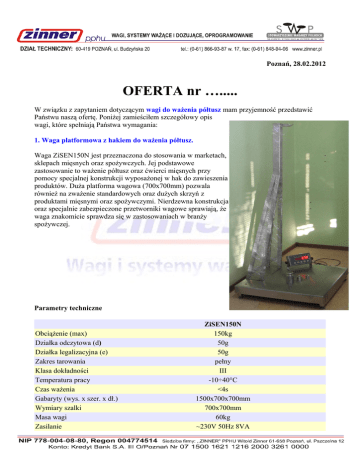 Poznań, 28.02.2012 OFERTA nr …..... W związku z zapytaniem dotyczącym wagi do ważenia półtusz mam przyjemność przedstawić Państwu naszą ofertę. Poniżej zamieściłem szczegółowy opis wagi, które spełniają Państwa wymagania: 1. Waga platformowa z hakiem do ważenia półtusz. Waga ZiSEN150N jest przeznaczona do stosowania w marketach, sklepach mięsnych oraz spożywczych. Jej podstawowe zastosowanie to ważenie półtusz oraz ćwierci mięsnych przy pomocy specjalnej konstrukcji wyposażonej w hak do zawieszenia produktów. Duża platforma wagowa (700x700mm) pozwala również na zważenie standardowych oraz dużych skrzyń z produktami mięsnymi oraz spożywczymi. Nierdzewna konstrukcja oraz specjalnie zabezpieczone przetworniki wagowe sprawiają, że waga znakomicie sprawdza się w zastosowaniach w branży spożywczej. Parametry techniczne Obciążenie (max) Działka odczytowa (d) Działka legalizacyjna (e) Zakres tarowania Klasa dokładności Temperatura pracy Czas ważenia Gabaryty (wys. x szer. x dł.) Wymiary szalki Masa wagi Zasilanie ZiSEN150N 150kg 50g 50g pełny III -10÷40°C <4s 1500x700x700mm 700x700mm 60kg ~230V 50Hz 8VA CENY: • • Waga ZiSEN150N (z legalizacją do końca listopada 2015 roku): Transport: 4 400 zł;-/szt. 20 zł;-/szt. POZOSTAŁE WARUNKI: • • • • Do podanych wyżej cen należy doliczyć 23% VAT. Termin realizacji: do 14 dni. Płatność: przedpłata na podstawie faktury proforma przy złożeniu zamówienia. Ważność oferty 60 dni. Z poważaniem, Jakub Frątczak Doradca Techniczno-Handlowy 609 219 303 Zinner PPHU