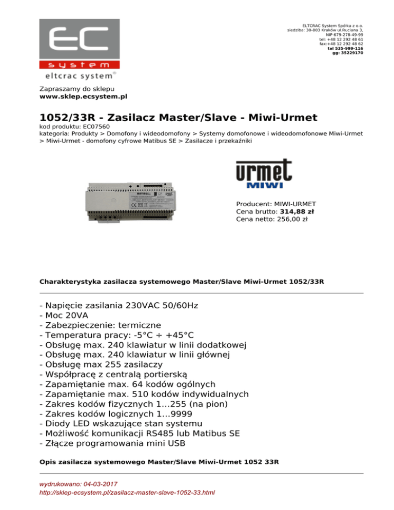 ELTCRAC System Spółka z o.o. siedziba: 30-803 Kraków ul.Ruciana 3, NIP 679-278-49-99 tel: +48 12 292 48 61 fax:+48 12 292 48 62 tel 535-999-116 gg: 35229170 Zapraszamy do sklepu www.sklep.ecsystem.pl 1052/33R - Zasilacz Master/Slave - Miwi-Urmet kod produktu: EC07560 kategoria: Produkty > Domofony i wideodomofony > Systemy domofonowe i wideodomofonowe Miwi-Urmet > Miwi-Urmet - domofony cyfrowe Matibus SE > Zasilacze i przekaźniki Producent: MIWI-URMET Cena brutto: 314,88 zł Cena netto: 256,00 zł Charakterystyka zasilacza systemowego Master/Slave Miwi-Urmet 1052/33R - Napięcie zasilania 230VAC 50/60Hz Moc 20VA Zabezpieczenie: termiczne Temperatura pracy: -5°C ÷ +45°C Obsługę max. 240 klawiatur w linii dodatkowej Obsługę max. 240 klawiatur w linii głównej Obsługę max 255 zasilaczy Współpracę z centralą portierską Zapamiętanie max. 64 kodów ogólnych Zapamiętanie max. 510 kodów indywidualnych Zakres kodów fizycznych 1…255 (na pion) Zakres kodów logicznych 1…9999 Diody LED wskazujące stan systemu Możliwość komunikacji RS485 lub Matibus SE Złącze programowania mini USB Opis zasilacza systemowego Master/Slave Miwi-Urmet 1052 33R wydrukowano: 04-03-2017 http://sklep-ecsystem.pl/zasilacz-master-slave-1052-33.html 1052/33R Zasilacz systemowy MASTER/SLAVE - Miwi-Urmet Zasilacz 1052/33R firmy Miwi-Urmet jest to zasilacz systemowy MASTER/SLAVE ze złączem USB. Wykorzystywany jest w systemach z wejściami głównymi oraz dodatkowymi. Zasilacz systemowy 1052/33R firmy Miwi-Urmet umożliwia podłączenie magistrali głównej oraz panela dodatkowego. Wymiary zasilacza systemowego Master/Slave Miwi-Urmet 105233R 180 x 97 x 75 mm (10 modułów DIN). Domofon cyfrowy Matibus SE Miwi-Urmet Zapraszamy do kontaktu: Polecamy: wydrukowano: 04-03-2017 http://sklep-ecsystem.pl/zasilacz-master-slave-1052-33.html