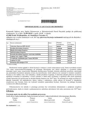 Komornik Sądowy przy Sądzie Rejonowym w Skierniewicach Paweł Pacyński Kancelaria Komornicza w Skierniewicach 96-100 Skierniewice ul. Reymonta 2A tel. /fax 46 8333176, 781 693 370 e-mail: [email protected] www.komornik-skierniewice.pl Km 1415/13 Skierniewice, dnia 10-08-2015 P.T. . #łm *0020001078837*/0419/ *0020001078837* OBWIESZCZENIE O LICYTACJI RUCHOMOŚCI Komornik Sądowy przy Sądzie Rejonowym w Skierniewicach Paweł Pacyński podaje do publicznej wiadomości, że w dniu 22-09-2015r. o godz. 13.15 w lokalu: 63-000 Środa Wielkopolska, ul. Stanisława Taczaka 13 odbędzie się w trybie ustalonym w art. 867 kpc pierwsza licytacja ruchomości należących do dłużnika i składających się z: Lp. Nazwa ruchomości Ilość Telewizor Daewoo DPP-42ASV 1 Kredens drewniany brązowy 2 Biurko drewniane brązowe 3 Stół drewniany brązowy 4 Krzesło drewniane brązowe- czerwone siedzisko 5 Laptop Acer Aspire 7720G 6 Urządzenie wielofunkcyjne Canon MF3220 7 Laptop LG E51 8 Drukarka HP Deskjet F735 9 *) cena za sztukę 1 [szt.] 1 [szt.] 1 [szt.] 1 [szt.] 6 [szt.] 1 [szt.] 1 [szt.] 1 [szt.] 1 [szt.] Wartość szacunkowa 300,00 1 200,00 700,00 500,00 70,00 *) 200,00 150,00 250,00 150,00 Cena wywołania 225,00 900,00 525,00 375,00 52,50 150,00 112,50 187,50 112,50 Ruchomości można oglądać w dzień licytacji w miejscu i czasie oznaczonym wyżej. Suma wywołania wynosi 75% sumy oszacowania.Przystępujący do przetargu obowiązany jest złożyć rękojmię w wysokości jednej dziesiątej części sumy oszacowania. Rękojmię złożoną przez licytanta, któremu udzielono przybicia, zatrzymuje się; pozostałym licytantom rękojmię zwraca się niezwłocznie. Jeżeli nabywca nie wykonał w terminie warunków licytacji co do zapłaty ceny, traci rękojmię, a skutki przybicia wygasają. Z utraconej rękojmi pokrywa się koszty egzekucji związanej ze sprzedażą, a reszta wchodzi w skład sumy uzyskanej w egzekucji albo jeżeli egzekucja została umorzona jest przelewana na dochód Skarbu Państwa (art. 8671 kpc). W przetargu nie mogą uczestniczyć: dłużnik, komornik, ich małżonkowie, dzieci, rodzice i rodzeństwo, osoby obecne na licytacji w charakterze urzędowym oraz licytant, który nie wykonał warunków poprzedniej licytacji. Stawienie się jednego licytanta wystarcza do odbycia przetargu. Pełnomocnictwo do udziału w przetargu powinno być stwierdzone dokumentem z podpisem urzędowo poświadczonym, chyba że chodzi o pełnomocnictwo udzielone adwokatowi lub radcy prawnemu (art. 8672 kpc) UWAGA: Licytacja może się nie odbyć bez podania przyczyny. Jeżeli drzwi będą zamknięte, będą otwierane na koszt i odpowiedzialność obowiązanego dłużnika. Tomasz Tomasz Anna Paweł Tutka Lesiak Bartczak-Lisik Pacyński aplikant komorniczy Do wiadomości: 1. a/a asesor komorniczy asesor komorniczy komornik sądowy