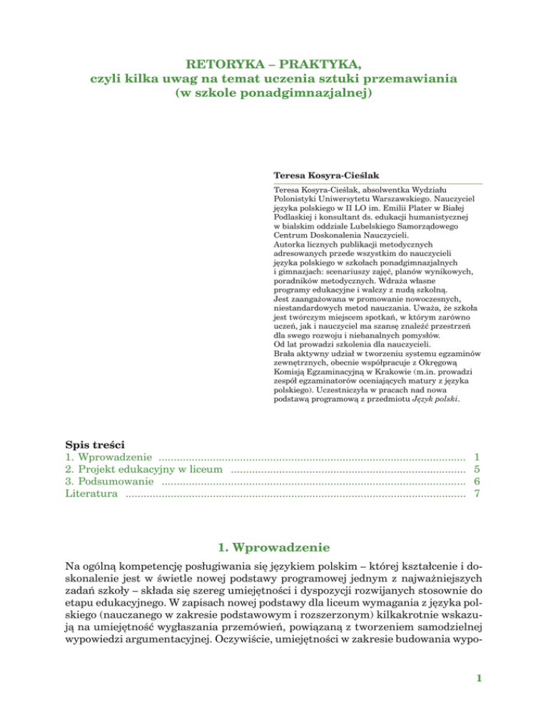 RETORYKA – PRAKTYKA, czyli kilka uwag na temat uczenia sztuki przemawiania (w szkole ponadgimnazjalnej) Teresa Kosyra-Cieślak Teresa Kosyra-Cieślak, absolwentka Wydziału Polonistyki Uniwersytetu Warszawskiego. Nauczyciel języka polskiego w II LO im. Emilii Plater w Białej Podlaskiej i konsultant ds. edukacji humanistycznej w bialskim oddziale Lubelskiego Samorządowego Centrum Doskonalenia Nauczycieli. Autorka licznych publikacji metodycznych adresowanych przede wszystkim do nauczycieli języka polskiego w szkołach ponadgimnazjalnych i gimnazjach: scenariuszy zajęć, planów wynikowych, poradników metodycznych. Wdraża własne programy edukacyjne i walczy z nudą szkolną. Jest zaangażowana w promowanie nowoczesnych, niestandardowych metod nauczania. Uważa, że szkoła jest twórczym miejscem spotkań, w którym zarówno uczeń, jak i nauczyciel ma szansę znaleźć przestrzeń dla swego rozwoju i niebanalnych pomysłów. Od lat prowadzi szkolenia dla nauczycieli. Brała aktywny udział w tworzeniu systemu egzaminów zewnętrznych, obecnie współpracuje z Okręgową Komisją Egzaminacyjną w Krakowie (m.in. prowadzi zespół egzaminatorów oceniających matury z języka polskiego). Uczestniczyła w pracach nad nowa podstawą programową z przedmiotu Język polski. Spis treści 1. Wprowadzenie . ..................................................................................................... 1 2. Projekt edukacyjny w liceum ............................................................................... 5 3. Podsumowanie ...................................................................................................... 6 Literatura .................................................................................................................. 7 1. Wprowadzenie Na ogólną kompetencję posługiwania się językiem polskim – której kształcenie i doskonalenie jest w świetle nowej podstawy programowej jednym z najważniejszych zadań szkoły – składa się szereg umiejętności i dyspozycji rozwijanych stosownie do etapu edukacyjnego. W zapisach nowej podstawy dla liceum wymagania z języka polskiego (nauczanego w zakresie podstawowym i rozszerzonym) kilkakrotnie wskazują na umiejętność wygłaszania przemówień, powiązaną z tworzeniem samodzielnej wypowiedzi argumentacyjnej. Oczywiście, umiejętności w zakresie budowania wypo- 1 RETORYKA – PRAKTYKA wiedzi własnej są zawsze powiązane z implikowanymi przez nie umiejętnościami odbierania wypowiedzi cudzej – zgodnie z zasadą nowej podstawy, której porządkujące zapisy rozdzielają umiejętności odbioru i tworzenia wypowiedzi, nakazując jednak w praktyce dydaktycznej wiązać je ze sobą. Tak więc uczeń szkoły ponadgimnazjalnej, realizujący program języka polskiego w zakresie podstawowym m.in.: – wyróżnia argumenty, kluczowe pojęcia i twierdzenia w tekście argumentacyjnym, dokonuje jego logicznego streszczenia [I.1.5]1 oraz – tworzy samodzielną wypowiedź argumentacyjną według podstawowych zasad logiki i retoryki itp. [III.1.3], a także – publicznie wygłasza przygotowaną przez siebie wypowiedź, dbając o dźwiękową wyrazistość przekazu (w tym także tempo mowy i donośność głosu) [III.1.4]. W zakres szeroko rozumianej sztuki przemawiania wchodzi także szereg innych kompetencji, do których odnoszą się wymagania podstawy programowej: – odczytywanie zawartych w odbieranych tekstach informacji, zarówno jawnych, jak i ukrytych [I.1.2]; – rozpoznawanie charakterystycznych cech stylu danego tekstu, w tym rozpoznawanie środków stylistycznych i określanie ich funkcji [I.1.4]; – rozpoznawanie ironii [I.1.7], pytań podchwytliwych i sugerujących odpowiedź [I.1.8] i manipulacji językowej [I.1.9]; – rozpoznawanie i nazywanie funkcji tekstu, zwłaszcza funkcji impresywnej i perswazyjnej [II.3.4]; – przygotowywanie wypowiedzi w odpowiednim układzie kompozycyjnym i z zastosowaniem odpowiednich środków językowych, poprzedzone gruntowną analizą tematu [III.1.3]; – stosowanie uczciwych zabiegów perswazyjnych i wystrzeganie się nieuczciwych chwytów erystycznych [III.1.5]. Wymagania odnoszące się do zakresu rozszerzonego wskazują dodatkowo rozpoznawanie retorycznej organizacji wypowiedzi [I.1.4]. Ponadto, należy podkreślić, że retoryka ogarnia wielkie pole kształcenia językowego, gdyż stanowi umiejętność praktycznego zastosowania wiedzy o środkach językowych oraz wchodzi w przestrzeń analizy literackiej, ponieważ – uczymy się od mistrzów, studiując przykłady wybitnych tekstów, będących arcydziełami sztuki oratorskiej i publicystyki. Analiza powyższych wymagań (czyli – celów szczegółowych nauki języka polskiego w szkole ponadgimnazjalnej, nabudowanych na odpowiednich wymaganiach wskazanych w etapach wcześniejszych) pozwala stworzyć z nich całkiem obszerny i spójny program retoryki stosowanej (której cele w oczywisty sposób korespondują z różnorodnymi sprawnościami językowo-komunikacyjnymi uczniów). Na podkreślenie zasługuje także fakt, iż większość wyżej wymienionych wymagań przewidziaNumeracja odnosi się do wymagań zapisanych w podstawie programowej języka polskiego dla liceum. Cyfra rzymska wskazuje I, II lub III wymaganie ogólne. 1 2 1. Wprowadzenie nych jest dla młodzieży uczącej się języka polskiego w zakresie podstawowym, tzn. – dla przeważającej większości uczniów, także tych, zainteresowanych kierunkami technicznymi czy przyrodniczymi, a nie formowaniem humanistycznym. I słusznie, bo przecież umiejętność publicznego zabierania głosu potrzebna jest wszystkim! Każdy człowiek, w różnych sytuacjach – zawodowych, towarzyskich i rodzinnych – nieraz jest zmuszony zabrać głos przed szerszym audytorium. Realizację tych treści, poza godzinami wynikającymi z obowiązkowego wymiaru godzin przeznaczonych na język polski, realizowanymi w tradycyjnym systemie klasowo-lekcyjn