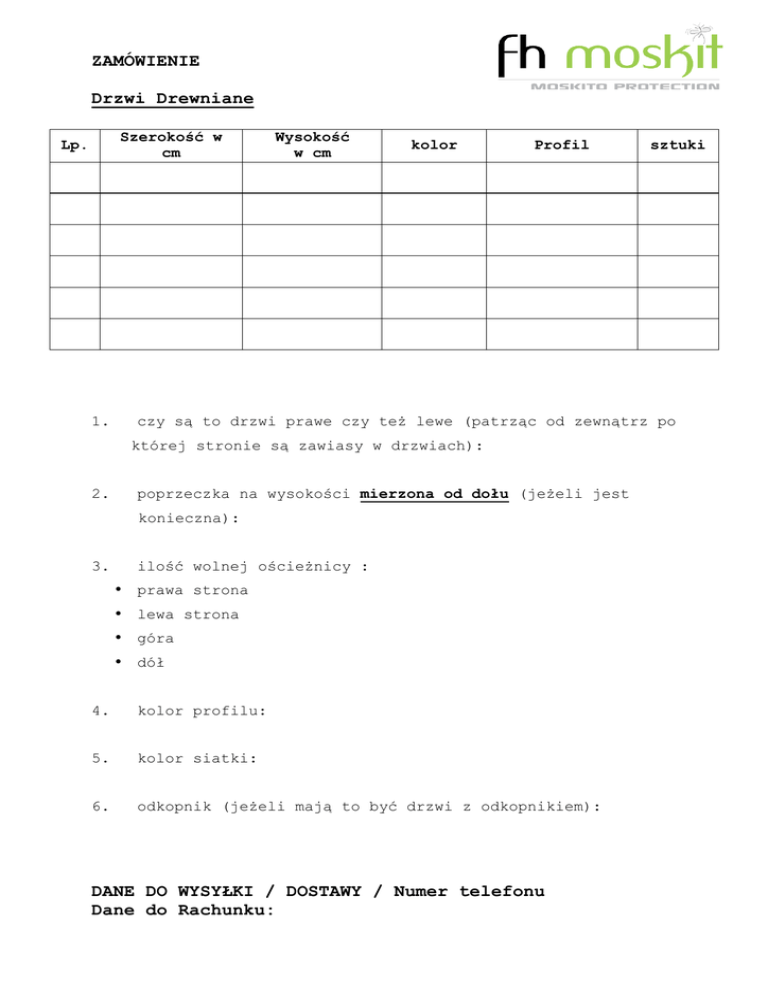 ZAMÓWIENIE Drzwi Drewniane Szerokość w cm Lp. 1. Wysokość w cm kolor Profil czy są to drzwi prawe czy też lewe (patrząc od zewnątrz po której stronie są zawiasy w drzwiach): 2. poprzeczka na wysokości mierzona od dołu (jeżeli jest konieczna): 3. sztuki ilość wolnej ościeżnicy : • prawa strona • lewa strona • góra • dół 4. kolor profilu: 5. kolor siatki: 6. odkopnik (jeżeli mają to być drzwi z odkopnikiem): DANE DO WYSYŁKI / DOSTAWY / Numer telefonu Dane do Rachunku: