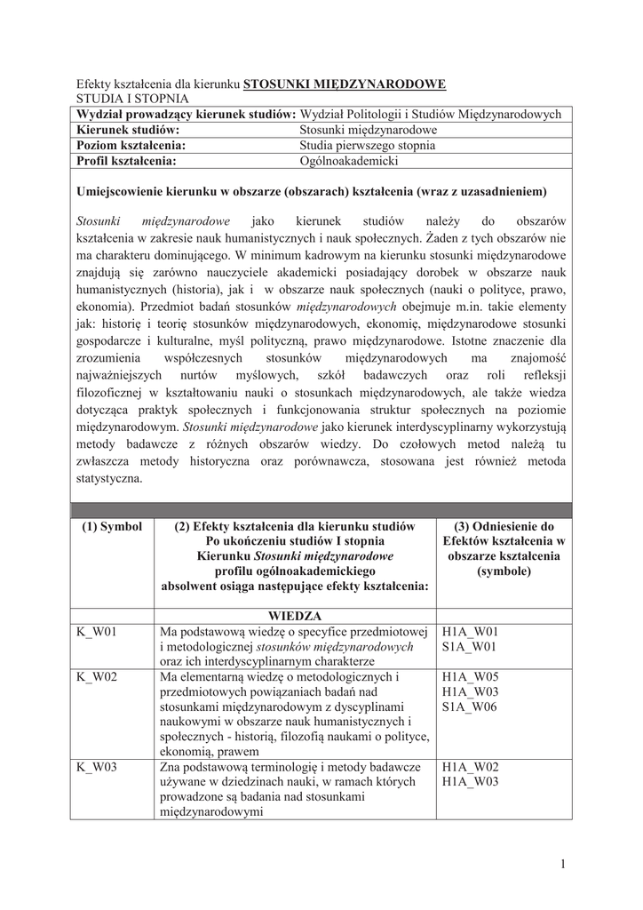 Efekty kształcenia dla kierunku STOSUNKI MIĘDZYNARODOWE STUDIA I STOPNIA Wydział prowadzący kierunek studiów: Wydział Politologii i Studiów Międzynarodowych Kierunek studiów: Stosunki międzynarodowe Poziom kształcenia: Studia pierwszego stopnia Profil kształcenia: Ogólnoakademicki Umiejscowienie kierunku w obszarze (obszarach) kształcenia (wraz z uzasadnieniem) Stosunki międzynarodowe jako kierunek studiów należy do obszarów kształcenia w zakresie nauk humanistycznych i nauk społecznych. Żaden z tych obszarów nie ma charakteru dominującego. W minimum kadrowym na kierunku stosunki międzynarodowe znajdują się zarówno nauczyciele akademicki posiadający dorobek w obszarze nauk humanistycznych (historia), jak i w obszarze nauk społecznych (nauki o polityce, prawo, ekonomia). Przedmiot badań stosunków międzynarodowych obejmuje m.in. takie elementy jak: historię i teorię stosunków międzynarodowych, ekonomię, międzynarodowe stosunki gospodarcze i kulturalne, myśl polityczną, prawo międzynarodowe. Istotne znaczenie dla zrozumienia współczesnych stosunków międzynarodowych ma znajomość najważniejszych nurtów myślowych, szkół badawczych oraz roli refleksji filozoficznej w kształtowaniu nauki o stosunkach międzynarodowych, ale także wiedza dotycząca praktyk społecznych i funkcjonowania struktur społecznych na poziomie międzynarodowym. Stosunki międzynarodowe jako kierunek interdyscyplinarny wykorzystują metody badawcze z różnych obszarów wiedzy. Do czołowych metod należą tu zwłaszcza metody historyczna oraz porównawcza, stosowana jest również metoda statystyczna. (1) Symbol K_W01 K_W02 K_W03 (2) Efekty kształcenia dla kierunku studiów Po ukończeniu studiów I stopnia Kierunku Stosunki międzynarodowe profilu ogólnoakademickiego absolwent osiąga następujące efekty kształcenia: WIEDZA Ma podstawową wiedzę o specyfice przedmiotowej i metodologicznej stosunków międzynarodowych oraz ich interdyscyplinarnym charakterze Ma elementarną wiedzę o metodologicznych i przedmiotowych powiązaniach badań nad stosunkami międzynarodowym z dyscyplinami naukowymi w obszarze nauk humanistycznych i społecznych - historią, filozofią naukami o polityce, ekonomią, prawem Zna podstawową terminologię i metody badawcze używane w dziedzinach nauki, w ramach których prowadzone są badania nad stosunkami międzynarodowymi (3) Odniesienie do Efektów kształcenia w obszarze kształcenia (symbole) H1A_W01 S1A_W01 H1A_W05 H1A_W03 S1A_W06 H1A_W02 H1A_W03 1 K_W04 K_W05 K_W06 K_W07 K_W08 K_W09 K_W10 K_W11 K_W12 K_W13 K_W14 K_W15 K_W16 K_W17 K_W18 K_U01 K_U02 Zna najważniejsze wydarzenia historyczne, które wpłynęły na kształt współczesnych stosunków międzynarodowych Ma uporządkowaną wiedzę o zjawiskach ekonomicznych i procesach gospodarczych, na poziomie krajowym i międzynarodowym Zna główne koncepcje filozoficzne i ogólne zależności między kształtowaniem się idei filozoficznych a zmianami w relacjach międzynarodowych Ma podstawową wiedzę na temat rozwoju myśli politycznej, zna współczesne doktryny polityczne i systemy polityczne Ma elementarną wiedzę o uczestnikach stosunków międzynarodowych Zna międzynarodowe powiązania polityczne, gospodarcze, kulturalne i wojskowe Ma podstawową wiedzę o państwie i prawie oraz o ich historycznej ewolucji, zna główne kierunki rozwoju nauk prawnych Zna normy i zasady prawa międzynarodowego publicznego Zna instytucje społeczne funkcjonujące na poziomie międzynarodowym – ogólnoświatowym i regionalnym (zwłaszcza europejskim) oraz zachodzące między nimi relacje Ma uporządkowaną wiedzę na temat przyczyn, przebiegu i rezultatów integracji europejskiej Dysponuje wiedzą dotyczącą struktur wewnętrznych, mechanizmów działania , trybu stanowienia prawa i zasad prawnych w Unii Europejskiej Zna kluczowe zasady tworzenia i rozwijania własnego przedsiębiorstwa, w tym pozyskiwania środków z Unii Europejskiej i funkcjonowania w środowisku międzynarodowym Ma wiedzę dotyczącą struktur, instytucji i polityk mających zapewniać bezpieczeństwo wewnętrzne i zewnętrzne państwom i człowiekowi Rozumie istotę działania samorządu terytorialnego i regionalnej/lokalnej administracji publicznej Zna i rozumie podstawowe pojęcia z zakresu ochrony własności intelektualnej UMIEJĘTNOŚCI Czyta i interpretuje teksty z zakresu historii stosunków międzynarodowych i myśli politycznej oraz teksty prawne Wyszukuje, selekcjonuje, ocenia i wykorzystuje informacje ze źródeł pisanych i elektronicznych H1A_W04 H1A_W05 H1A_W04 H1A_W05 H1A_W04 H1A_W05 H1A_W04 H1A_W06 S1A_W04 S1A_W04 H1A_W04 S1A_W07 S1A_W09 S1A_W07 S1A_W03 S1A_W08 S1A_W08 S1A_W09 S1A_W02 S1A_W11 S1A_W09 S1A_W09 H1A_W08 S1A_W10 H1A_U03 H1A_U05 H1A_U01 2 K_U03 K_U04 K_U05 K_U06 K_U07 K_U08 K_U09 K_U10 K_U11 K_U12 K_U13 K_U14 K_U15 K_U16 K_U17 Poprawnie stosuje poznaną terminologię z zakresu dyscyplin naukowych, w ramach których prowadzone są badania nad stosunkami międzynarodowymi Prowadzi na poziomie podstawowym pracę badawczą pod kierunkiem opiekuna naukowego Przygotowuje, w oparciu o źródła pisane i elektroniczne, krótkie wypowiedzi ustne w języku polskim i w języku obcym, dotyczące zagadnień stanowiących przedmiot zainteresowania stosunków międzynarodowych Przygotowuje, w oparciu o źródła pisane i elektroniczne, proste prace pisemne, w języku polskim i w języku obcym, dotyczące zagadnień stanowiących przedmiot zainteresowania stosunków międzynarodowych Wykrywa i analizuje proste zależności między kształtowaniem się myśli politycznej i refleksji filozoficznej a procesami zachodzącymi w stosunkach międzynarodowych Wykrywa i analizuje związki przyczynowoskutkowe między wydarzeniami międzynarodowymi, ze szczególnym uwzględnieniem kwestii europejskich i bezpieczeństwa Prawidłowo stosuje normy prawa krajowego, europejskiego (unijnego) i międzynarodowego dla oceny pr