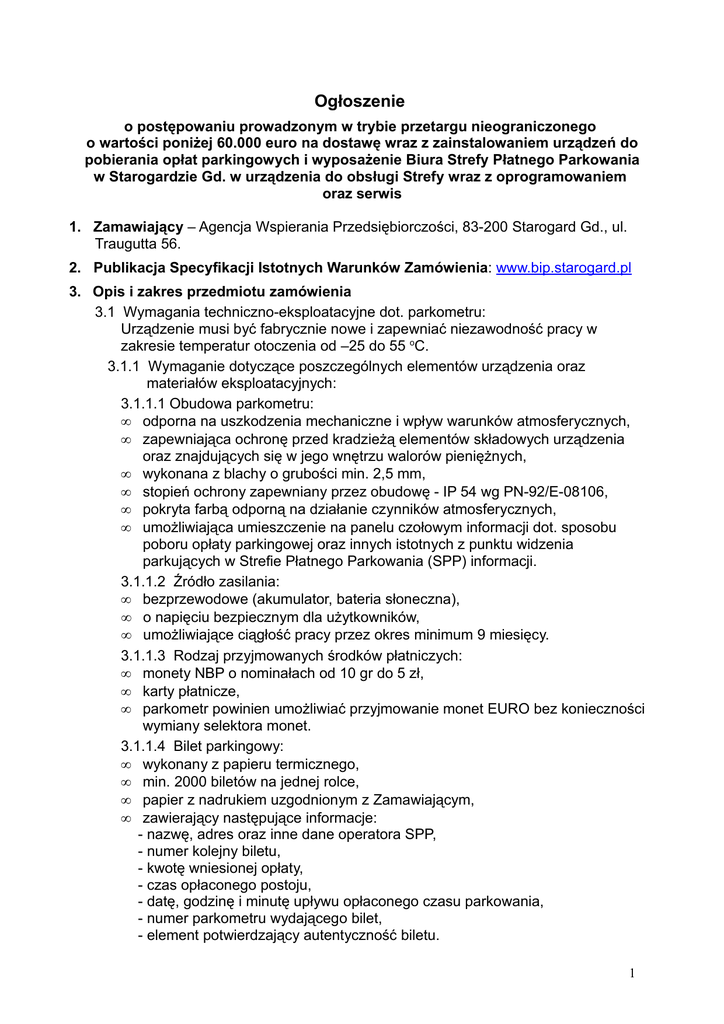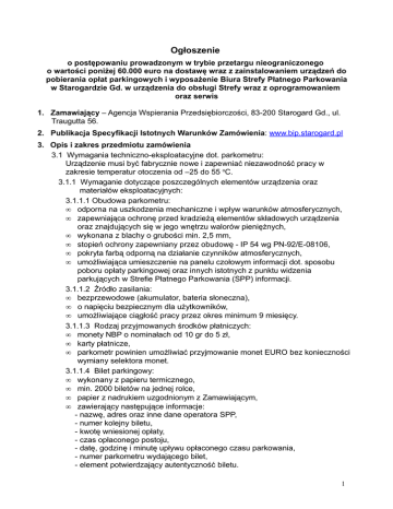 Ogłoszenie o postępowaniu prowadzonym w trybie przetargu nieograniczonego o wartości poniżej 60.000 euro na dostawę wraz z zainstalowaniem urządzeń do pobierania opłat parkingowych i wyposażenie Biura Strefy Płatnego Parkowania w Starogardzie Gd. w urządzenia do obsługi Strefy wraz z oprogramowaniem oraz serwis 1. Zamawiający – Agencja Wspierania Przedsiębiorczości, 83-200 Starogard Gd., ul. Traugutta 56. 2. Publikacja Specyfikacji Istotnych Warunków Zamówienia: www.bip.starogard.pl 3. Opis i zakres przedmiotu zamówienia 3.1 Wymagania techniczno-eksploatacyjne dot. parkometru: Urządzenie musi być fabrycznie nowe i zapewniać niezawodność pracy w zakresie temperatur otoczenia od –25 do 55 oC. 3.1.1 Wymaganie dotyczące poszczególnych elementów urządzenia oraz materiałów eksploatacyjnych: 3.1.1.1 Obudowa parkometru: • odporna na uszkodzenia mechaniczne i wpływ warunków atmosferycznych, • zapewniająca ochronę przed kradzieżą elementów składowych urządzenia oraz znajdujących się w jego wnętrzu walorów pieniężnych, • wykonana z blachy o grubości min. 2,5 mm, • stopień ochrony zapewniany przez obudowę - IP 54 wg PN-92/E-08106, • pokryta farbą odporną na działanie czynników atmosferycznych, • umożliwiająca umieszczenie na panelu czołowym informacji dot. sposobu poboru opłaty parkingowej oraz innych istotnych z punktu widzenia parkujących w Strefie Płatnego Parkowania (SPP) informacji. 3.1.1.2 Źródło zasilania: • bezprzewodowe (akumulator, bateria słoneczna), • o napięciu bezpiecznym dla użytkowników, • umożliwiające ciągłość pracy przez okres minimum 9 miesięcy. 3.1.1.3 Rodzaj przyjmowanych środków płatniczych: • monety NBP o nominałach od 10 gr do 5 zł, • karty płatnicze, • parkometr powinien umożliwiać przyjmowanie monet EURO bez konieczności wymiany selektora monet. 3.1.1.4 Bilet parkingowy: • wykonany z papieru termicznego, • min. 2000 biletów na jednej rolce, • papier z nadrukiem uzgodnionym z Zamawiającym, • zawierający następujące informacje: - nazwę, adres oraz inne dane operatora SPP, - numer kolejny biletu, - kwotę wniesionej opłaty, - czas opłaconego postoju, - datę, godzinę i minutę upływu opłaconego czasu parkowania, - numer parkometru wydającego bilet, - element potwierdzający autentyczność biletu. 1 3.1.2 Wymogi dot. oprogramowania parkometru: • możliwość programowania ręcznego oraz przy pomocy przenośnego terminala, • oprogramowanie powinno umożliwiać: - identyfikację urządzenia (nadanie numeru, oznaczenie lokalizacji) - określenie obowiązującej taryfy opłat (z możliwością programowania nieliniowych stawek opłat dla określonych przedziałów czasowych), - identyfikację przez urządzenie niedziel, świąt oraz innych dni, w których nie pobiera się opłat parkingowych, - automatyczną zmianę czasu letniego na zimowy i odwrotnie. 3.1.3 Pozostałe warunki, które powinien spełniać parkometr: • komunikaty powinny być wyświetlane w jednym z trzech języków (zgodnie z wyborem klienta): polskim, angielskim i niemieckim, • powinien być wyposażony w system monitorujący jego pracę, informujący w czytelny sposób o ewentualnej niesprawności, • powinien monitorować stan skarbca oraz istotne parametry pracy i informować obsługę o przekroczeniu wartości dopuszczalnych, • powinien automatycznie drukować potwierdzenie stanu skarbca w przypadku jego opróżnienia, • powinien rejestrować i zapisywać w pamięci wszystkie informacje natury finansowej, statystycznej i technicznej, w celu dalszej ich obróbki przy pomocy odpowiednich programów komputerowych; w szczególności: - wartość opłat wniesionych w okresie od poprzedniego odczytu danych, - wartość opłat wniesionych monetami i kartami płatniczymi, - wartość monet znajdujących się w skarbcu (w rozbiciu na nominały), - liczbę biletów opłaconych gotówką i kartami, - datę i godzinę awarii oraz datę i godzinę jej usunięcia, - informacje nt. transakcji dokonanych przy użyciu kart elektronicznych (numer karty, kwota oraz data i godzina transakcji). • powinien umożliwiać odczytywanie i transport danych przy pomocy przenośnych terminali komputerowych. 3.2. Instalacja urządzeń do pobierania opłat parkingowych Dostawca powinien zainstalować dostarczone Zamawiającemu parkometry, przez co należy rozumieć dokonanie wyboru miejsca ich ustawienia, montaż do podłoża oraz doprowadzenie wszystkich urządzeń do stanu pełnej gotowości do pracy. 3.3. Wyposażenie Biura Strefy Płatnego Parkowania w Starogardzie Gdańskim w urządzenia do obsługi strefy wraz z oprogramowaniem Zamawiający rozumie przez to dostarczenie przez Dostawcę: • czterech parkometrów o parametrach eksploatacyjnych zgodnych z wymogami zawartymi w pkt 1. Opisu przedmiotu zamówienia, • dwóch przenośnych terminali, umożliwiających odczytywanie i transport danych, programowanie oraz diagnostykę parkometrów. • zestawu komputerowego składającego się z jednostki centralnej zapewniającej sprawne działanie systemu informatycznego obsługującego SPP, monitora LCD o przekątnej ekranu min. 17” oraz drukarki laserowej, • systemu informatycznego umożliwiającego gromadzenie i przetwarzanie danych dot. funkcjonowania SPP, w szczególności: - wpływów z tytułu pobranych opłat parkingowych - wykorzystania miejsc parkingowych w funkcji czasu (dzień tygodnia, pora dnia) 2 - ewidencji pojazdów, których właściciele uchylają się od obowiązku wykupienia opłaty parkingowej. 3.4 Serwis urządzeń do obsługi SPP. Zamawiający rozumie przez to: • udzielenie przez Dostawcę 24-miesięcznej gwarancji na działanie parkometrów, terminali przenośnych i systemu informatycznego obsługującego SPP, • przeszkolenie na koszt Dostawcy kontrolerów SPP (dwie osoby) w zakresie obsługi parkometrów, terminali przenośnych oraz systemu informatycznego obsługuj