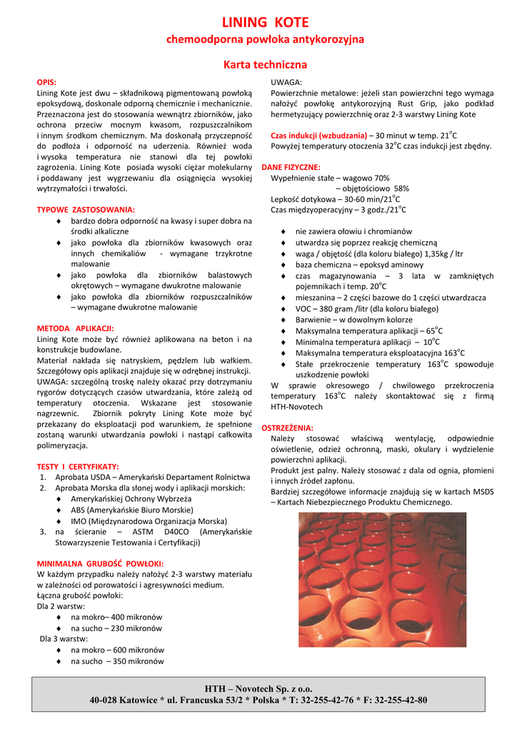 LINING KOTE chemoodporna powłoka antykorozyjna Karta techniczna UWAGA: OPIS: Powierzchnie metalowe: jeżeli stan powierzchni tego wymaga Lining Kote jest dwu – składnikową pigmentowaną powłoką nałożyć powłokę antykorozyjną Rust Grip, jako podkład epoksydową, doskonale odporną chemicznie i mechanicznie. hermetyzujący powierzchnię oraz 2‐3 warstwy Lining Kote Przeznaczona jest do stosowania wewnątrz zbiorników, jako ochrona przeciw mocnym kwasom, rozpuszczalnikom Czas indukcji (wzbudzania) – 30 minut w temp. 21oC i innym środkom chemicznym. Ma doskonałą przyczepność Powyżej temperatury otoczenia 32oC czas indukcji jest zbędny. do podłoża i odporność na uderzenia. Również woda i wysoka temperatura nie stanowi dla tej powłoki zagrożenia. Lining Kote posiada wysoki ciężar molekularny DANE FIZYCZNE: i poddawany jest wygrzewaniu dla osiągnięcia wysokiej Wypełnienie stałe – wagowo 70% wytrzymałości i trwałości. – objętościowo 58% Lepkość dotykowa – 30‐60 min/21oC Czas międzyoperacyjny – 3 godz./21oC TYPOWE ZASTOSOWANIA: ♦ bardzo dobra odporność na kwasy i super dobra na ♦ nie zawiera ołowiu i chromianów środki alkaliczne ♦ utwardza się poprzez reakcję chemiczną ♦ jako powłoka dla zbiorników kwasowych oraz innych chemikaliów ‐ wymagane trzykrotne ♦ waga / objętość (dla koloru białego) 1,35kg / ltr malowanie ♦ baza chemiczna – epoksyd aminowy ♦ jako powłoka dla zbiorników balastowych ♦ czas magazynowania – 3 lata w zamkniętych okrętowych – wymagane dwukrotne malowanie pojemnikach i temp. 20oC ♦ jako powłoka dla zbiorników rozpuszczalników ♦ mieszanina – 2 części bazowe do 1 części utwardzacza – wymagane dwukrotne malowanie ♦ VOC – 380 gram /litr (dla koloru białego) ♦ Barwienie – w dowolnym kolorze METODA APLIKACJI: ♦ Maksymalna temperatura aplikacji – 65oC Lining Kote może być również aplikowana na beton i na ♦ Minimalna temperatura aplikacji – 10oC konstrukcje budowlane. ♦ Maksymalna temperatura eksploatacyjna 163oC Materiał nakłada się natryskiem, pędzlem lub wałkiem. ♦ Stałe przekroczenie temperatury 163oC spowoduje Szczegółowy opis aplikacji znajduje się w odrębnej instrukcji. uszkodzenie powłoki UWAGA: szczególną troskę należy okazać przy dotrzymaniu W sprawie okresowego / chwilowego przekroczenia rygorów dotyczących czasów utwardzania, które zależą od temperatury 163oC należy skontaktować się z firmą temperatury otoczenia. Wskazane jest stosowanie HTH‐Novotech nagrzewnic. Zbiornik pokryty Lining Kote może być przekazany do eksploatacji pod warunkiem, że spełnione OSTRZEŻENIA: zostaną warunki utwardzania powłoki i nastąpi całkowita Należy stosować właściwą wentylację, odpowiednie polimeryzacja. oświetlenie, odzież ochronną, maski, okulary i wydzielenie powierzchni aplikacji. TESTY I CERTYFIKATY: Produkt jest palny. Należy stosować z dala od ognia, płomieni 1. Aprobata USDA – Amerykański Departament Rolnictwa i innych źródeł zapłonu. 2. Aprobata Morska dla słonej wody i aplikacji morskich: Bardziej szczegółowe informacje znajdują się w kartach MSDS ♦ Amerykańskiej Ochrony Wybrzeża – Kartach Niebezpiecznego Produktu Chemicznego. ♦ ABS (Amerykańskie Biuro Morskie) ♦ IMO (Międzynarodowa Organizacja Morska) 3. na ścieranie – ASTM D40CO (Amerykańskie Stowarzyszenie Testowania i Certyfikacji) MINIMALNA GRUBOŚĆ POWŁOKI: W każdym przypadku należy nałożyć 2‐3 warstwy materiału w zależności od porowatości i agresywności medium. Łączna grubość powłoki: Dla 2 warstw: ♦ na mokro– 400 mikronów ♦ na sucho – 230 mikronów Dla 3 warstw: ♦ na mokro – 600 mikronów ♦ na sucho – 350 mikronów HTH – Novotech Sp. z o.o. 40-028 Katowice * ul. Francuska 53/2 * Polska * T: 32-255-42-76 * F: 32-255-42-80
