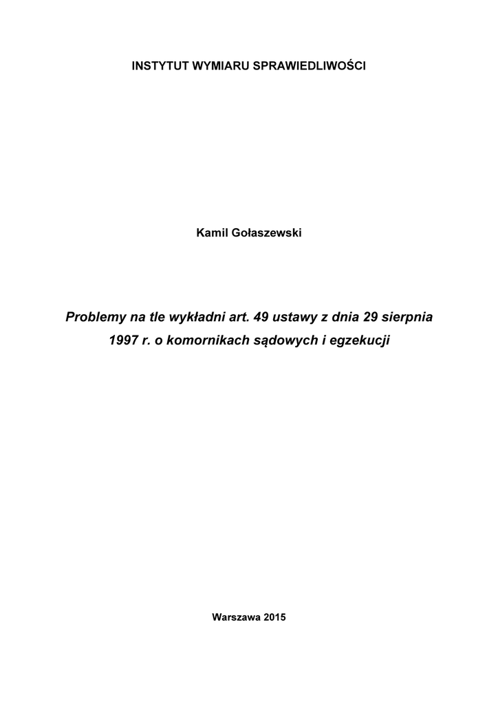 INSTYTUT WYMIARU SPRAWIEDLIWOŚCI Kamil Gołaszewski Problemy na tle wykładni art. 49 ustawy z dnia 29 sierpnia 1997 r. o komornikach sądowych i egzekucji Warszawa 2015 Spis treści 1. Wstęp ............................................................................................................................. 1 2. System opłat egzekucyjnych .......................................................................................... 2 3. Opłata pobrana na podstawie art. 49 ust. 1 ustawy o komornikach sądowych i egzekucji ....................................................................................................................................... 3 3.1. Opłata w wysokości 15% ......................................................................................... 4 3.1.1. Opłata od wpłat dokonywanych bezpośrednio komornikowi ............................. 4 3.1.2. Wpłata dokonana komornikowi jako podstawa miarkowania wysokości opłaty . 6 3.2. Zakres pobrania opłaty w wysokości 8% ................................................................. 6 3.3. Opłata od środków złożonych w postępowaniu zabezpieczającym na rachunek depozytowy ........................................................................................................................ 7 4. Opłata pobierana na podstawie art. 49 ust. 2 ustawy o komornikach sądowych i egzekucji ............................................................................................................................... 8 4.1. Wysokość opłaty od kwot uiszczonych przez dłużnika bezpośrednio wierzycielowi . 9 4.2. Podstawa ustalenia wysokości opłaty po zawarciu ugody między wierzycielem i dłużnikiem.........................................................................................................................11 5. Zakres stosowania art. 49 ust. 4 ustawy o komornikach sądowych i egzekucji ..............12 5.1. Zakres badania celowości wszczęcia egzekucji przez komornika i w postępowaniu ze skargi na czynność komornika .....................................................................................12 5.2. Pojęcie niecelowo wszczętej egzekucji...................................................................14 5.2.1. Spełnienie przez dłużnika świadczenia przed wszczęciem postępowania egzekucyjnego ..............................................................................................................15 5.2.2. Utrata mocy przez tytuł wykonawczy w toku postępowania egzekucyjnego ....15 5.2.3. Brak zdolności sądowej dłużnika w chwili wszczęcia egzekucji .......................17 6. Zastosowanie art. 49 ustawy o komornikach sądowych i egzekucji w postępowaniu zabezpieczającym ................................................................................................................18 7. Ustalenie wysokości opłaty we wcześniejszych czynnościach komornika (zajęcia, zawiadomienia o wszczęciu egzekucji) .................................................................................19 8. Miarkowanie wysokości opłaty (art. 49 ust. 7–10 ustawy o komornikach sądowych i egzekucji) .............................................................................................................................19 8.1. Opłata od wniosku ..................................................................................................20 8.2. Termin i dopuszczalność złożenia wniosku ............................................................21 8.3. Przesłanki miarkowania opłaty (katalog otwarty czy zamknięty) .............................21 8.4. Sytuacje uzasadniające miarkowanie .....................................................................22 8.5. Zakres i sposób miarkowania .................................................................................23 8.6. Przypadki oddalenia wniosków ...............................................................................25 8.7. Dopuszczalność wniesienia przez komornika zażalenia na postanowienie sądu obniżające opłatę egzekucyjną .........................................................................................26 9. Kierunki zmian wysokości opłat .....................................................................................27 9.1. Projekty ..................................................................................................................27 9.2. Ocena propozycji ...................................................................................................28 10. Podsumowanie ..........................................................................................................33 Lista spraw wykorzystanych na potrzeby opracowania: ........................................................35 ii 1. Wstęp Przedmiotem opracowania jest analiza problemów wykładni art. 49 ustawy z dnia 29 sierpnia 1997 r. o komornikach sądowych i egzekucji1, jakie ujawniły się w orzecznictwie sądowym. Ograniczono się przy tym do zasygnalizowania dostrzeżonych problemów i rozbieżności, bez analizowania poprawności przyjętej przez sądy wykładni. Podstawą opracowania jest analiza orzecznictwa sądów rejonowych, którą objęto sprawy ze skargi na czynności komornika (symbol 106)2 oraz sprawy o obniżenie opłaty egzekucyjnej (symbol 106a) zakończone prawomocnie w latach 2014–2015. Z danych statystycznych nadesłanych przez Ministerstwo Sprawiedliwości wynika, że w 2014 r. w sądach rejonowych rozpoznano 69 313 spraw ze skargi na czynności komornika, przy czym dane statystyczne nie różnicują przedmiotu zaskarżonej czynności komornika. Na potrzeby opracowania przebadano 305 spraw rozstrzygniętych prawomocnie w latach 2014–2015 z 30 losowo wybranych sądów rejonowych (w Białogardzie, Bochni, Brodnicy, Grudziądzu, Gdańsk-Południe w Gdańsku, Kartuzach, Katowice-Wschód w Katowicach, Kielcach, Kłodzku, Kutnie, Kwidzynie, Lubaniu, Łasku, dla 