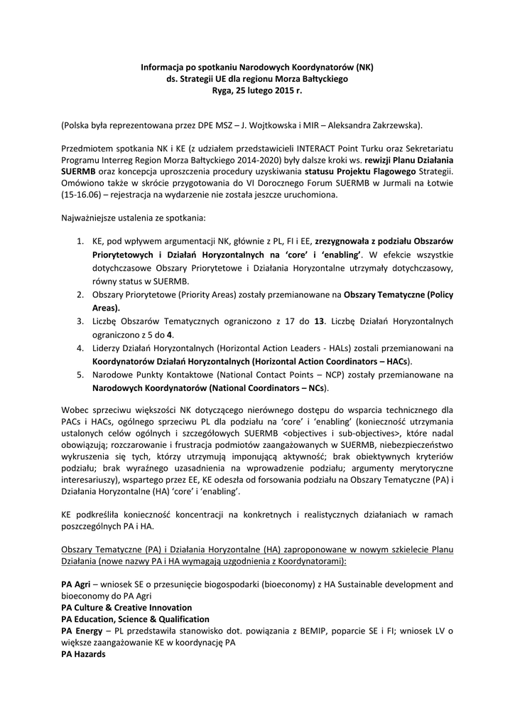 Informacja po spotkaniu Narodowych Koordynatorów (NK) ds. Strategii UE dla regionu Morza Bałtyckiego Ryga, 25 lutego 2015 r. (Polska była reprezentowana przez DPE MSZ – J. Wojtkowska i MIR – Aleksandra Zakrzewska). Przedmiotem spotkania NK i KE (z udziałem przedstawicieli INTERACT Point Turku oraz Sekretariatu Programu Interreg Region Morza Bałtyckiego 2014-2020) były dalsze kroki ws. rewizji Planu Działania SUERMB oraz koncepcja uproszczenia procedury uzyskiwania statusu Projektu Flagowego Strategii. Omówiono także w skrócie przygotowania do VI Dorocznego Forum SUERMB w Jurmali na Łotwie (15-16.06) – rejestracja na wydarzenie nie została jeszcze uruchomiona. Najważniejsze ustalenia ze spotkania: 1. KE, pod wpływem argumentacji NK, głównie z PL, FI i EE, zrezygnowała z podziału Obszarów Priorytetowych i Działań Horyzontalnych na ‘core’ i ‘enabling’. W efekcie wszystkie dotychczasowe Obszary Priorytetowe i Działania Horyzontalne utrzymały dotychczasowy, równy status w SUERMB. 2. Obszary Priorytetowe (Priority Areas) zostały przemianowane na Obszary Tematyczne (Policy Areas). 3. Liczbę Obszarów Tematycznych ograniczono z 17 do 13. Liczbę Działań Horyzontalnych ograniczono z 5 do 4. 4. Liderzy Działań Horyzontalnych (Horizontal Action Leaders - HALs) zostali przemianowani na Koordynatorów Działań Horyzontalnych (Horizontal Action Coordinators – HACs). 5. Narodowe Punkty Kontaktowe (National Contact Points – NCP) zostały przemianowane na Narodowych Koordynatorów (National Coordinators – NCs). Wobec sprzeciwu większości NK dotyczącego nierównego dostępu do wsparcia technicznego dla PACs i HACs, ogólnego sprzeciwu PL dla podziału na ‘core’ i ‘enabling’ (konieczność utrzymania ustalonych celów ogólnych i szczegółowych SUERMB <objectives i sub-objectives>, które nadal obowiązują; rozczarowanie i frustracja podmiotów zaangażowanych w SUERMB, niebezpieczeństwo wykruszenia się tych, którzy utrzymują imponującą aktywność; brak obiektywnych kryteriów podziału; brak wyraźnego uzasadnienia na wprowadzenie podziału; argumenty merytoryczne interesariuszy), wspartego przez EE, KE odeszła od forsowania podziału na Obszary Tematyczne (PA) i Działania Horyzontalne (HA) ‘core’ i ‘enabling’. KE podkreśliła konieczność koncentracji na konkretnych i realistycznych działaniach w ramach poszczególnych PA i HA. Obszary Tematyczne (PA) i Działania Horyzontalne (HA) zaproponowane w nowym szkielecie Planu Działania (nowe nazwy PA i HA wymagają uzgodnienia z Koordynatorami): PA Agri – wniosek SE o przesunięcie biogospodarki (bioeconomy) z HA Sustainable development and bioeconomy do PA Agri PA Culture & Creative Innovation PA Education, Science & Qualification PA Energy – PL przedstawiła stanowisko dot. powiązania z BEMIP, poparcie SE i FI; wniosek LV o większe zaangażowanie KE w koordynację PA PA Hazards PA Health PA Innovation, Competitiveness and SMEs – dawne PA Innovation, do którego dołączył PA SMEs i częściowo PA Internal Market; postulat dołączenia elementów HA Promo, które zostaje usunięte z Planu Działania PA Nutri PA Secure – propozycja FI dołączenia zagadnień związanych z zapobieganiem przestępczości PA Safe PA Ship PA Tourism PA Transport – wniosek DE, że obszarem działania PA Transport mogłoby być współpraca w zakresie infrastruktury dla alternatywnych paliw, podobnie FI, która zasugerowała także mobilność jako usługę, dla LT może to być platforma do wymiany dobrych praktyk HA Climate Adaptation (poprzednio: HA Sustainable development & bioeconomy) HA Involve – Związek Miast Bałtyckich (UBC) zgłosił zainteresowanie współkoordynowaniem tematu HA Neighbours HA Spatial Planning Tym samym ze Strategii zostałyby usunięte jako samodzielne obszary: PA Bio, PA Crime, PA Internal Market, HA Promo. KE zaproponowała umieszczenie w nowej wersji Planu Działania odrębnego rozdziału podkreślającego znaczenie współpracy w regionie z wykorzystaniem innych formatów regionalnych, takich jak m.in. Rada Państw Morza Bałtyckiego, Wymiar Północny, Nordycka Rada Ministrów. Kilka dni po spotkaniu NK i KE w Rydze, KE przekazała poniższy harmonogram w zakresie aktualizacji Planu Działania SUERMB: Request to PACs/HACs to submit updates 3 March Proposals for updates are submitted to DG REGIO by 7 April PACs/HACs Compilation of updates received from PACs/HACs By 10 April Consultations on the revised EUSBSR Action Plan with the 13-17 April Cabinet (5 working days) Launch of inter-service consultations (ISC) (at least 15 20 April – 12 May (N.B. 1 May is a working days due to size of the document) public holiday in BRU) Modifications of the text following the ISC (5 working 13-21 May (N.B. 14-15 May are days) public holidays in BRU) Final version sent out to the HLG (a week in advance) 22 May NCs meeting (Brussels, back-to-back to the HLG meeting) 28 May (date not yet confirmed) HLG meeting 29 May (date not yet confirmed) Formal adoption – Commission Staff Working Document June 2015 (Commission procedures) Zgodnie z wytycznymi KE PACs i HACs powinny przygotować nowe wkłady do Planu Działania, które zostaną skonsultowane z grupami/komitetami sterującymi poszczególnych PA i HA (Focal Points), a następnie Narodowymi Koordynatorami ds. SUERMB. W załączeniu przekazuję ostatnią wersję wytycznych KE (z 3 marca br.) dotyczących rewizji Planu Działania. Rewizja PD musi zostać zakończona przed VI Dorocznym Forum SUERMB w Jurmali na Łotwie 15-16.06.2015 r. Uproszczenie procedury dla Projektów Flagowych NK poparły wstępnie propozycję KE upraszczającą i przyspieszającą ścieżkę uzyskania statusu Projektu Flagowego SUERMB (Flagship). Decyzja o przyznaniu takiego statusu podejmowana byłaby na szczeblu Narodowych Koordynatorów ds. SUERMB zamiast dotychczasowej praktyki akceptowania Projektów Flagowych przez Grupę Wysokiego Szczebla