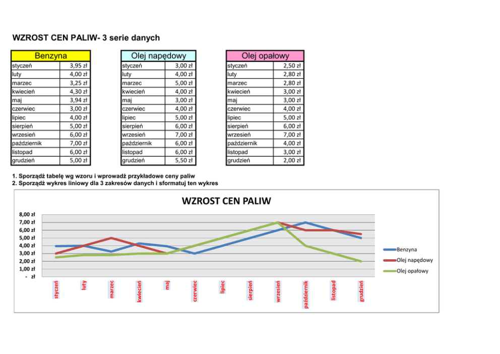 WZROST CEN PALIW- 3 serie danych Olej napędowy Benzyna styczeń luty marzec kwiecień maj czerwiec lipiec sierpień wrzesień październik listopad grudzień styczeń luty marzec kwiecień maj czerwiec lipiec sierpień wrzesień październik listopad grudzień 3,95 zł 4,00 zł 3,25 zł 4,30 zł 3,94 zł 3,00 zł 4,00 zł 5,00 zł 6,00 zł 7,00 zł 6,00 zł 5,00 zł Olej opałowy styczeń luty marzec kwiecień maj czerwiec lipiec sierpień wrzesień październik listopad grudzień 3,00 zł 4,00 zł 5,00 zł 4,00 zł 3,00 zł 4,00 zł 5,00 zł 6,00 zł 7,00 zł 6,00 zł 6,00 zł 5,50 zł 2,50 zł 2,80 zł 2,80 zł 3,00 zł 3,00 zł 4,00 zł 5,00 zł 6,00 zł 7,00 zł 4,00 zł 3,00 zł 2,00 zł 1. Sporządź tabelę wg wzoru i wprowadź przykładowe ceny paliw 2. Sporządź wykres liniowy dla 3 zakresów danych i sformatuj ten wykres WZROST CEN PALIW 8,00 zł 7,00 zł 6,00 zł 5,00 zł 4,00 zł 3,00 zł 2,00 zł 1,00 zł - zł Benzyna Olej napędowy grudzień listopad październik wrzesień sierpień lipiec czerwiec maj kwiecień marzec luty styczeń Olej opałowy