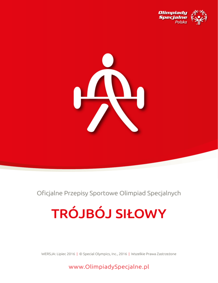 3 LA RA Oficjalne Przepisy Sportowe Olimpiad Specjalnych TRÓJBÓJ SIŁOWY WERSJA: Lipiec 2016 | © Special Olympics, Inc., 2016 | Wszelkie Prawa Zastrzeżone www.OlimpiadySpecjalne.pl 3 LA TRÓJBÓJ SIŁOWY RAZ TRÓJBÓJ SIŁOWY 1. PRZEPISY REGULUJĄCE Oficjalne Przepisy Sportowe Olimpiad Specjalnych obowiązują we wszystkich zawodach podnoszenia ciężarów rozgrywanych w ramach Olimpiad Specjalnych. Jako międzynarodowy program sportowy Olimpiady Specjalne stworzyły te przepisy w oparciu o przepisy International Powerlifting Federation (IPF) i Polskiego Związku Kulturystyki, Fitness i Trójboju Siłowego. Podczas rozgrywania zawodów powinno się stosować do przepisów IPF i Polskiego Związku Kulturystyki, Fitness i Trójboju Siłowego z wyjątkiem przypadków, kiedy ich przepisy kolidują z przepisami Olimpiad Specjalnych lub z Artykułem 1. W takich przypadkach należy stosować Oficjalne Przepisy Sportowe Olimpiad Specjalnych. 2. KONKURENCJE OFICJALNE Zakres rozgrywanych konkurencji został pomyślany tak, by dać możliwość startu zawodnikom z każdego poziomu sprawności. Program opisuje proponowane konkurencje i, jeśli to potrzebne, zawiera wskazówki do ich przeprowadzania. Trenerzy są zobowiązani do dobrania odpowiedniej konkurencji oraz programu treningowego adekwatnie do możliwości oraz zaangażowania swoich zawodników. Poniżej znajduje się lista oficjalnych konkurencji w trójboju siłowym rozgrywanych w ramach Olimpiad Specjalnych. 2.1. Przysiad 2.2. Wyciskanie w leżeniu na ławeczce 2.3. Martwy ciąg 2.4. Kombinacja dwubój (wyciskanie w leżeniu na ławeczce i martwy ciąg) 2.5. Kombinacja (wyciskanie w leżeniu na ławeczce, martwy ciąg i przysiad). 3. SPRZĘT 3.1. Specyfikacja gryfu sztangi i ciężarów (talerzy) 3.1.1. Odległość między kołnierzami: 1 m 31 cm 3.1.2. Całkowita długość na zewnątrz rękawów 2 m 20 cm maksimum 3.1.3. Średnica gryfu: minimum 28 mm; maksimum 29 mm 3.1.4. Średnica największego talerza: 45 cm 3.1.5. Waga największego talerza: 25 kg 3.1.6. Waga gryfu 20 kg z zaciskami 25 kg 3.1.7.Należy się posługiwać talerzami o następującej wadze: 25 kg, 20 kg, 15 kg, 10 kg, 5 kg, 2,5 kg, 1,25 kg 3.1.8. Talerze muszą mieć następujące oznaczenia kolorystyczne: 3.1.8.1. 10 kg i mniej – dowolny kolor, ale inny niż podany dalej dla cięższych talerzy; 3.1.8.2. 15 kg – żółty; 3.1.8.3. 20 kg – niebieski; 3.1.8.4. 25 kg – czerwony. 3.1.9.Wszystkie talerze muszą mieć wyraźne oznaczenie ciężaru i ich ciężar nie może być inny niż 0,25% nominalnego (podanego na oznaczeniu). 3.1.10. Jeżeli na sztangę założone są talerze, muszą zawsze być zabezpieczone zaciskami. 3.1.11.Każdy zawodnik może mieć możliwość skorzystania z 15 kg gryfu jedynie podczas wyciskania w leżeniu na ławeczce. Taki gryf można używać, aż do momentu kiedy sportowiec jest w stanie udźwignąć 20 kg gryf. Gryf posiada następujące wymiary: Waga: 15 kg Długość: 201 cm 2 Wszelkie Prawa Zastrzeżone WERSJA: Lipiec 2016 © Special Olympics, Inc., 2016 3 LA TRÓJBÓJ SIŁOWY RAZ Końce zewnętrzne (rękawy: 5 cm średnicy/32 cm długości i może się obracać Gryf: 2.5 cm średnicy/131 cm długości 2 (radełkowany) gryf 42 cm w tym 0.5 cm nie ponacinane i 19.5 cm z nacięciami od wewnętrznej tulei 3.2. Wymiary ławki 3.2.1. Standardowa ławeczka 3.2.1.1.Załączone standardy bezpieczeństwa muszą być zachowane dla każdej konkurencji Trójboju siłowego: Długość: nie mniej niż 1.22 3.2.1.2. Szerokość: 29cm do 32cm 3.2.1.3. Wysokość: 42 cm do 45cm 3.2.2. Ławeczka dla niepełnosprawnych ruchowo: 3.2.2.1. Długość: 2,1 m 3.2.2.2. Szerokość: część ławeczki pod głową: 30,5 cm 3.2.2.3. Wysokość: 45-50 cm 3.2.2.4. Szerokość: część ławeczki pod tułowiem: 61 cm 3.3. Ubiór i wyposażenie zawodnika 3.3.1. Ubiór 3.3.1.1.Jednoczęściowy kostium o pełnej długości, wykonany z jednowarstwowego, rozciągliwego materiału, bez dodatkowych wstawek lub wzmocnień, podszewek. 3.3.1.2.Dopuszczalne jest również używanie stroju do wrestlingu, zapasów (takiego, który nie ma elementów wzmacniających). 3.3.1.3. Ramiączka stroju muszą cały czas być założone na barki podczas boju. 3.3.1.4. Kolor\ kolory stroju są dowolne. 3.3.1.5. Szwy i obrębienia nie mogą przekraczać 3 cm szerokości i 0,5 cm grubości. 3.3.1.6.Jedynie kostiumy zapaśniczo-ciężarowe mogą mieć szwy i obrębienia (zakładki) przekraczające 3 cm szerokości. 3.3.1.7.Szwy mogą być osłaniane lub wzmacniane cienkim paskiem tkaniny, nie przekraczającym 2 cm szerokości i 0,5 cm grubości. 3.3.1.8.Kostium musi posiadać nogawki, ich długość nie może być mniejsza niż 3 cm, ani większa niż 15 cm mierząc od środka kroku. Pomiar powinien być prowadzony w linii prostej, od środkowego szwu ku dołowi, po wewnętrznej stronie nogawki. 3.3.1.9.Stroje do zapasów lub wrestlingu nieprzeznaczone do podnoszenia ciężarów mogą mieć nogawki dłuższe niż 15cm, ale muszą kończyć się powyżej kolan i nie mogą mieć żadnych wzmocnień na kolana ani żadnego połączenia z ewentualnymi opaskami. 3.3.1.10.Tylko stroje bez wzmocnień, nieprzeznaczone do podnoszenia ciężarów, mogą mieć podwójne krocze. 3.3.1.11.Noszenie długich spodni przez zawodników trójboju siłowego nie jest dozwolone. 3.3.1.12.W zawodach Olimpiad Specjalnych rangi światowej i kontynentalnej wszyscy zawodnicy muszą nosić strój, który spełnia wszystkie powyższe wymogi. Jedynym wyjątkiem może być strój do aerobiku z długimi nogawkami noszony w konkurencji wyciskania na ławeczce przez zawodników z niepełnosprawnością fizyczną (patrz: zmiany w punkcie 3.3.11). 3.3.2. Podkoszulek 3.3.2.1.Podkoszulka z krótkim rękawem (T-shirt), dowolnego koloru musi być noszona przez wszystkich zawodników pod kostiumem startowym podczas zawodów w konkurencji przysiad i wyciskanie w leżeniu. 3 Wszelkie Prawa Zastrzeżone WERSJA: Lipiec 2016 © 