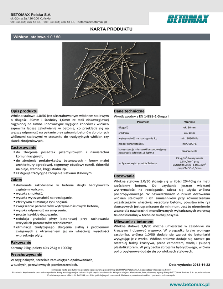 KARTA PRODUKTU Włókno stalowe 1.0 / 50 Opis produktu Dane techniczne Włókno stalowe 1.0/50 jest ukształtowanym włóknem stalowym o długości 50mm i średnicy 1,0mm ze stali niskowęglowej ciągnionej na zimno. Innowacyjne wygięcie końcówek włókien zapewnia lepsze zakotwienie w betonie, co przekłada się na wyższą odporność na pękanie przy zginaniu betonów zbrojonych włóknami stalowymi w stosunku do tradycyjnych włókien czy siatek zbrojeniowych. Wyrób zgodny z EN 14889-1 Grupa I Zastosowanie do zbrojenia posadzek przemysłowych i nawierzchni komunikacyjnych, do zbrojenia prefabrykatów betonowych - formy małej architektury ogrodowej, segmenty obudowy tuneli, zbiorniki na oleje, szamba, kręgi studni itp. zastępuje tradycyjne zbrojenie siatkami stalowymi. Zalety doskonałe zakotwienie w betonie dzięki haczykowato zagiętym końcom, wysoka smukłość, wysoka wytrzymałość na rozciąganie, efektywna eliminacja rys i spękań, zwiększenie parametrów wytrzymałościowych betonu, wysoka odporność na zmęczenie, proste i szybkie dozowanie, redukcja grubości płyty betonowej przy zachowaniu wszystkich parametrów technicznych, eliminacja tradycyjnego zbrojenia siatką i problemów związanych z utrzymaniem jej na właściwej wysokości w przekroju płyty. Pakowanie Kartony 25kg, palety 40 x 25kg = 1000kg Przechowywanie W oryginalnych, szczelnie zamkniętych opakowaniach, w suchych, przewiewnych pomieszczeniach. Parametr Wartość długość ok. 50mm średnica ok. 1mm wytrzymałość na rozciąganie Rm min. 1030MPa moduł sprężystości E min. 90GPa konsystencja mieszanki betonowej przy zawartości włókien 15 kg/m3 czas VeBe 8s wpływ na wytrzymałość betonu 25 kg/m3 do uzyskania 1,5 N/mm2 przy CMOD=0,5mm i 1,0 N/mm2 przy CMOD=3,5mm Dozowanie Włókna stalowe 1.0/50 stosuje się w ilości 20÷40kg na metr sześcienny betonu. Do uzyskania jeszcze większej wytrzymałości na rozciąganie, zaleca się użycia włókna polipropylenowego. W nawierzchniach o niskim dozowaniu włókien stalowych i ich zamienników przy równoczesnym przestrzeganiu właściwej receptury betonu, powstawanie rys skurczowych jest ograniczone do minimum. Jest to niezmiernie ważne dla nawierzchni monolitycznych wykańczanych warstwą trudnościeralną w technice suchej posypki. Mieszanie z betonem Włókna stalowe 1,0/50 można umieszczać w zasobniku na kruszywo i dozować wagowo. W przypadku braku wolnego zasobnika, włókna 1,0/50 dodaje się wprost do betoniarki wysypując je z worka. Włókna stalowe dodaje się zawsze po ostatniej frakcji kruszywa, przed cementem, wodą i (super) plastyfikatorem. W przypadku zbrojenia hybrydowego, włókna polipropylenowe dodaje się po włóknach stalowych. Data wydania: 2013-11-22 Niniejsza karta produktowa została opracowana przez firmę BETOMAX Polska S.A. i pozostaje własnością firmy. Przedruk, kopiowanie oraz udostępnianie karty katalogowej w całości bądź części osobom do których nie jest kierowana, bez pisemnej zgody firmy BETOMAX Polska S.A. są zabronione. Podstawa prawna –Dz.U.Nr 24/1994 poz 83 z późniejszymi zmianami. Ustawa o prawie autorskim i prawach pokrewnych.