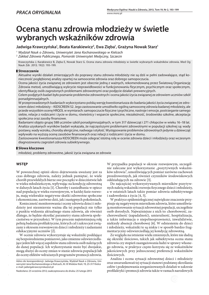 PRACA ORYGINALNA Medycyna Ogólna i Nauki o Zdrowiu, 2013, Tom 19, Nr 2, 193–199 www.monz.pl Ocena stanu zdrowia młodzieży w świetle wybranych wskaźników zdrowia Jadwiga Krawczyńska1, Beata Karakiewicz2, Ewa Zięba1, Grażyna Nowak Starz1 1 2 Wydział Nauk o Zdrowiu, Uniwersytet Jana Kochanowskiego w Kielcach Zakład Zdrowia Publicznego, Pomorski Uniwersytet Medyczny, Szczecin Krawczyńska J, Karakiewicz B, Zięba E, Nowak Starz G. Ocena stanu zdrowia młodzieży w świetle wybranych wskaźników zdrowia. Med Og Nauk Zdr. 2013; 19(2): 193–199. Streszczenie Aktualne wyniki działań zmierzających do poprawy stanu zdrowia młodzieży nie są dziś w pełni zadowalające, stąd konieczność pogłębionej analizy opartej na samoocenie zdrowia oraz dobrego samopoczucia. Ocena jakości życia związanej ze zdrowiem jest obecnie jedną z ważnych, rekomendowaną przez Światową Organizację Zdrowia metod, umożliwiającą wykrycie nieprawidłowości w funkcjonowaniu fizycznym, psychicznym oraz społecznym, identyfikację osób zagrożonych problemami zdrowotnymi oraz podjęcie działań prewencyjnych. Celem podjętych badań było poznanie problemów zdrowotnych i ocena jakości życia związanej ze zdrowiem uczniów szkół ponadgimnazjalnych. W przeprowadzonych badaniach wykorzystano polską wersję kwestionariusza do badania jakości życia związanej ze zdrowiem dzieci młodzieży – KIDSCREEN 52. Jego zastosowanie umożliwiło ogólną samoocenę zdrowia badanej młodzieży, ale przede wszystkim ocenę HRQOL w wymiarach: samopoczucie fizyczne i psychiczne, nastroje i emocje, postrzeganie samego siebie, relacje z rodzicami i życie w domu, rówieśnicy i wsparcie społeczne, niezależność, środowisko szkolne, akceptacja społeczna oraz zasoby finansowe. Badaniami objęto grupę 588 uczniów szkół ponadgimnazjalnych, w tym 317 dziewcząt i 271 chłopców w wieku 16–18 lat. Analiza uzyskanych wyników badań wykazała, że najczęstszymi problemami zdrowotnymi w populacji szkolnej są: wady postawy, wady wzroku, choroby alergiczne, nadwaga i otyłość. Występowanie problemów zdrowotnych jedynie u dziewcząt wpływało na wyższą ocenę zasobów finansowych oraz relacji z rodzicami i życia w domu. Zastosowanie kwestionariusza KIDSCREEN może odegrać istotną rolę w ocenie zdrowia dzieci i młodzieży oraz wczesnym diagnozowaniu zagrożeń zdrowia subiektywnego. Słowa kluczowe młodzież, problemy zdrowotne, jakość życia związana ze zdrowie - - - - Wstęp W powszechnej opinii okres dojrzewania uważany jest za czas dobrego zdrowia, należy jednak pamiętać, że wiele chorób przewlekłych bierze swe początki w dzieciństwie lub w wieku młodzieńczym, wpływając na kondycję zdrowotną w dalszych latach życia [1]. Choroby i zaniedbania w opiece nad populacją w wieku rozwojowym, w każdej fazie rozwoju, mają wielorakie negatywne skutki zdrowotne społeczne i ekonomiczne, zarówno dziś, jak i następnych pokoleniach. Konieczność monitorowania i oceny zdrowia dzieci i młodzieży jest niezmiernie ważna dla tej populacji nie tylko z punktu widzenia aktualnego stanu zdrowia, ale również dlatego, że będzie określać parametry stanu zdrowia społeczeństwa w przyszłości. W tym procesie najistotniejszą rolę pełnią badania profilaktyczne, których cel i zakres jest związany z okresem rozwojowym dzieci i młodzieży i zadaniami edukacyjnymi uczniów [2]. W ocenie zdrowia wykorzystuje się wskaźniki poddające się bezpośredniemu pomiarowi, jako zmienne odzwierciedlające jeden lub więcej aspektów stanu zdrowia osób należących do danej populacji. Ich wykorzystanie może być dwojakie, mogą służyć do oceny zmian w stanie zdrowia populacji lub do oceny efektów wdrażanych programów promocji zdrowia. Adres do korespondencji: Jadwiga Krawczyńska, Wydział Nauk o Zdrowiu, Uniwersytet Jana Kochanowskiego w Kielcach, Al. IX Wieków Kielc 19, 25-317 Kielce e-mail: [email protected] - Nadesłano: 25 września 2012; zaakceptowano do druku: 25 lutego 2013 W przypadku populacji w okresie rozwojowym, szczególnie zalecane jest wykorzystanie „pozytywnych wskaźników zdrowia”, umożliwiających pomiar zarówno zachowań prozdrowotnych, jak również czynników środowiskowych oddziałujących na zdrowie [3]. Do najczęściej wykorzystywanych mierników pozytywnych należą wskaźniki rozwoju fizycznego dzieci i młodzieży, a w ostatnich latach także pomiar zdrowia subiektywnego i zadowolenia z życia [4, 5]. W praktyce epidemiologicznej największe znaczenie przypisuje się negatywnym miernikom zdrowia, które umożliwiają monitorowanie sytuacji zdrowotnej populacji, szczególnie osób dorosłych. Najważniejsze z nich to: chorobowość, zachorowalność (zapadalność), umieralność, hospitalizacja, a także informacja o niepełnosprawności, inwalidztwie, niekiedy absencji chorobowej [6]. W odniesieniu do dzieci i młodzieży, wskaźniki te są niskie i w sposób bardzo fragmentaryczny odzwierciedlają jej kondycję zdrowotną. Ze względu na istnienie wielu zmiennych, które nie dadzą się określić ilościowo, takich jak subiektywna ocena stanu zdrowia czy stopień zaangażowania ludzi w sprawy własnego zdrowia, w praktyce często korzysta się ze wskaźników jakościowych przy jednoczesnej preferencji wskaźników ilościowych. Analiza i ocena sytuacji zdrowotnej dzieci i młodzieży oraz uwarunkowań tej sytuacji stanowi podstawę określania celów i podejmowania zorganizowanych działań w zakresie profilaktyki i promocji zdrowia także w ramach narodowych - - - - - 194 Medycyna Ogólna i Nauki o Zdrowiu, 2013, Tom 19, Nr 2 Jadwiga Krawczyńska, Beata Karakiewicz, Ewa Zięba, Grażyna Nowak Starz. Ocena stanu zdrowia młodzieży w świetle wybranych wskaźników zdrowia programów zdrowia, dlatego też w strategii ochrony i promocji zdrowia zawartej w Narodowym Programie Zdrowia na lata 2006–2015 jednym z priorytetów jest popraw