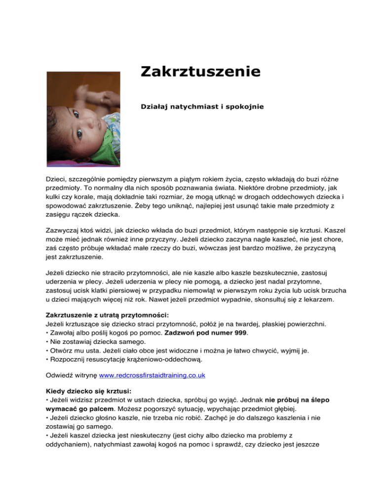 Zakrztuszenie Działaj natychmiast i spokojnie Dzieci, szczególnie pomiędzy pierwszym a piątym rokiem życia, często wkładają do buzi różne przedmioty. To normalny dla nich sposób poznawania świata. Niektóre drobne przedmioty, jak kulki czy korale, mają dokładnie taki rozmiar, że mogą utknąć w drogach oddechowych dziecka i spowodować zakrztuszenie. Żeby tego uniknąć, najlepiej jest usunąć takie małe przedmioty z zasięgu rączek dziecka. Zazwyczaj ktoś widzi, jak dziecko wkłada do buzi przedmiot, którym następnie się krztusi. Kaszel może mieć jednak również inne przyczyny. Jeżeli dziecko zaczyna nagle kaszleć, nie jest chore, zaś często próbuje wkładać małe rzeczy do buzi, wówczas jest bardzo możliwe, że przyczyną jest zakrztuszenie. Jeżeli dziecko nie straciło przytomności, ale nie kaszle albo kaszle bezskutecznie, zastosuj uderzenia w plecy. Jeżeli uderzenia w plecy nie pomogą, a dziecko jest nadal przytomne, zastosuj ucisk klatki piersiowej w przypadku niemowląt w pierwszym roku życia lub ucisk brzucha u dzieci mających więcej niż rok. Nawet jeżeli przedmiot wypadnie, skonsultuj się z lekarzem. Zakrztuszenie z utratą przytomności: Jeżeli krztuszące się dziecko straci przytomność, połóż je na twardej, płaskiej powierzchni. • Zawołaj albo poślij kogoś po pomoc. Zadzwoń pod numer 999. • Nie zostawiaj dziecka samego. • Otwórz mu usta. Jeżeli ciało obce jest widoczne i można je łatwo chwycić, wyjmij je. • Rozpocznij resuscytację krążeniowo-oddechową. Odwiedź witrynę www.redcrossfirstaidtraining.co.uk Kiedy dziecko się krztusi: • Jeżeli widzisz przedmiot w ustach dziecka, spróbuj go wyjąć. Jednak nie próbuj na ślepo wymacać go palcem. Możesz pogorszyć sytuację, wpychając przedmiot głębiej. • Jeżeli dziecko głośno kaszle, nie trzeba nic robić. Zachęć je do dalszego kaszlenia i nie zostawiaj go samego. • Jeżeli kaszel dziecka jest nieskuteczny (jest cichy albo dziecko ma problemy z oddychaniem), natychmiast zawołaj kogoś na pomoc i sprawdź, czy dziecko jest jeszcze przytomne. Zadzwoń pod numer 999. • Jeżeli dziecko nie straciło przytomności, ale nie kaszle albo kaszle bezskutecznie, zastosuj uderzenia w plecy. Pielęgniarka środowiskowa mówi Niemowlęta i małe dzieci często połykają, wdychają lub krztuszą się małymi przedmiotami takimi jak patyczki od lizaków, balony, orzeszki ziemne, guziki, torebki na pieluchy, kawałki plastikowych zabawek lub sznurka. Czy otoczenie dziecka jest bezpieczne? Dowiedz się, co zrobić w nagłym wypadku. Przygotuj się: odwiedź witrynę www.redcrossfirstaidtraining.co.uk.