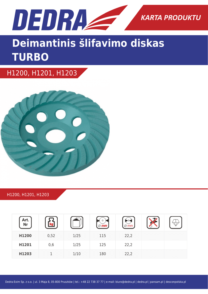 Deimantinis šlifavimo diskas TURBO H1200, H1201, H1203 H1200, H1201, H1203 H1200 0,52 1/25 115 22,2 H1201 0,6 1/25 125 22,2 H1203 1 1/10 180 22,2 Dedra-Exim Sp. z o.o. | ul. 3 Maja 8, 05-800 Pruszków | tel.: +48 22 738 37 77 | e-mail: [email protected] | dedra.pl | pansam.pl | desconpolska.pl