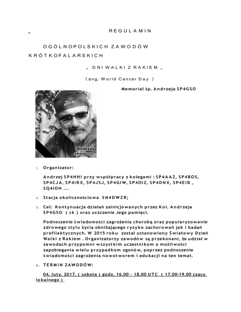 REGUL A MIN OGÓ L N OPO LS KIC H ZA W O D Ó W K R Ó T K OF A L A RS KIC H „ D NI W AL KI Z RA KIE M „ ( a n g. W o r l d C a n c e r D a y ) Me mo r iał śp. A n d rzeja S P 4 G S O 1 . O r ga nizato r: A n d rzej S P4 H H I p rzy w s p ół p racy z k o lega mi : S P 4 A A Z, S P 4 B O S, S P 4 C J A, S P 4 I R X, S P 4 J S J, S P 4 G I W, S P 4 O I Z, S P 4 D N X, S P 4 E I B , S Q4 I O H … . 2. S t acja o k olicznościo w a S N 4 D W Z R; 3. Cel: K o n t y n uacja działań zainicjo w a n ych p rzez K o l. A n d rzeja S P 4 G S O ( s k ) o raz uczczenie Jego pa mięci. Po d noszenie ś w ia do mości zagrożenia chorobą o raz pop u la r yzo w a nie zd ro wego sty l u życia obniżającego r yzy k o zacho ro w ań ja k i badań p rofila k t ycznych. W 2015 r o k u został u sta no w io n y Ś w i ato w y D zień Wa l k i z R a k ie m . O r ga nizato rzy za w odó w są p rze ko na ni, że u dział w za w o dach p rzy po m n i w szyst k i m uczestni k o m o m ożli w ości zapobiegania w iel u p rzy pad k o m zgonó w, pop rzez pod noszenie ś w iado mości zagrożenia no w o t w o rem i edu kacji na ten temat. A . T E R M I N Z A W O D Ó W: 04. lu t y. 2017. ( sobota ) godz. 16.00 – 18.00 U T C ( 17.00-19.00 czasu lo ka l nego ) B. Pa s m o i emisja: 3,5 M Hz podziałem pas ma ) emisja mi : S S B i CW C. R a po rt y: stacja or ga nizato ra - S N 4 D W Z R ( O r ga nizator ) ( zgod nie z RS(T) + O S tacje pozostałe - RS(T) + N R QSO od 001 4. P u n k t acja : Q S O ze stacją o rga nizato ra S N 4 D W Z R i 10 p k t. na S S B Q S O z pozostały m i stacja mi p k t. na S S B - - 20 p k t. na C W 4 p k t. na C W i 2 A . M n ożni ka n ie stosuje się. B . W y n i k k ońco w y : S u m a p u n k t ó w za Q S O 5. S W L ( s ) Obo w iązuje odeb ra nie zna kó w i ra po r tó w od ob u stacji . P u n k tacja ja k d la na da w có w. Z n a k stacji m oże poja w ić się w log u d w a razy - raz emisją C W i raz emisją S S B. 6. K l as yfi kacje: A – S tacje p racujące emisją ( S S B + C W ); B – S tacje p racujące emisją S S B; C – S tacje p racujące emisją C W; D – S t acje X Y L, Y L p racujące emisja mi ( S S B + C W ); E – S t acje S W L s S t acja or ga nizato ra nie będzie k l as yfi k o w a na. U w a gi: Z a w o d n i k ó w obo w iązuje 5 m i n. Q R T p rzed i po za w o dach. K o m i sja zast rzega sobie p ra w o do d ys k w a lifi kacji uczestni ka w p rzy pad k u p racy nie zgod nej z zasada mi H a m-S p i r it u. Łączności nie będą zaliczane O B U S TA C J O M w p rzy pad k u błędnego odeb ra nia ra po r t u lu b zna k u o raz, g d y r óżnica czasu zapisana w logu będzie w i ę k sza niż 5 m i n u t. W logach obo w iązuje czas U T C. L O G I E L E K T R O N I C Z N E W P O S TA C I P L I K U T E K S TO W E G O F O R M AT U C A B R I LLO N A L EŻ Y P R Z E SŁ AĆ W TE R M I N I E 7 D NI OD Z A K OŃCZE NI A Z A W O D Ó W. Pocztą ele kt roniczną : sp4h hi@ w p.pl Listo w n ie na ad res: A n d rzej W i k łacz S P 4 H H I m 18 10-294 O L S Z T Y N u l. A le k sa n d ra P u sz k i na 1 Z a w o d y zostaną rozliczone w ciągu 1 m iesiąca od za kończenia za w odó w. Decyzje K o m isji są ostateczne. V y 73 ! O R G A N I Z A TO R Z Y .