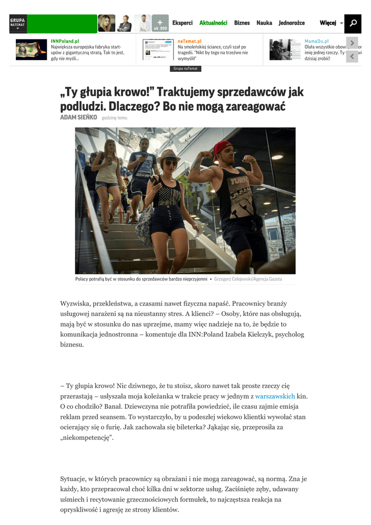Eksperci Aktualności Biznes Nauka Jednorożce Więcej ok 300 INNPoland.pl naTemat.pl MamaDu.pl Największa europejska fabryka startupów z gigantyczną stratą. Tak to jest, gdy nie myśli... Na smoleńskiej ściance, czyli szał po tragedii. "Nikt by tego na trzeźwo nie wymyślił" Olała wszystkie obowiązki domowe imię jednej rzeczy. Ty też powinnaś dzisiaj zrobić! Grupa naTemat „Ty głupia krowo!” Traktujemy sprzedawców jak podludzi. Dlaczego? Bo nie mogą zareagować ADAM SIEŃKO godzinę temu Polacy potrafią być w stosunku do sprzedawców bardzo nieprzyjemni • Grzegorz Celejewski/Agencja Gazeta Wyzwiska, przekleństwa, a czasami nawet fizyczna napaść. Pracownicy branży usługowej narażeni są na nieustanny stres. A klienci? – Osoby, które nas obsługują, mają być w stosunku do nas uprzejme, mamy więc nadzieje na to, że będzie to komunikacja jednostronna – komentuje dla INN:Poland Izabela Kielczyk, psycholog biznesu. – Ty głupia krowo! Nic dziwnego, że tu stoisz, skoro nawet tak proste rzeczy cię przerastają – usłyszała moja koleżanka w trakcie pracy w jednym z warszawskich kin. O co chodziło? Banał. Dziewczyna nie potrafiła powiedzieć, ile czasu zajmie emisja reklam przed seansem. To wystarczyło, by u podeszłej wiekowo klientki wywołać stan ocierający się o furię. Jak zachowała się bileterka? Jąkając się, przeprosiła za „niekompetencję”. Sytuacje, w których pracownicy są obrażani i nie mogą zareagować, są normą. Zna je każdy, kto przepracował choć kilka dni w sektorze usług. Zaciśnięte zęby, udawany uśmiech i recytowanie grzecznościowych formułek, to najczęstsza reakcja na opryskliwość i agresję ze strony klientów. Powiedzenie „klient nasz pan” traktowane przez roszczeniowych klientów zbyt serio przybiera postać: „sprzedawca nasz niewolnik”. Kasjerka w supermarkecie złajana za błędną cenę na półce sklepowej albo kelner pracujący w zatłoczonej restauracji, który zbiera cięgi za zbyt wolną obsługę, to w polskiej rzeczywistości smutny standard. "Za wszystko dostaje się za to oczywiście sprzedawcy, czyli osobie, która zazwyczaj jest za to najmniej odpowiedzialna" • pixabay.com Co kieruje ludźmi, którzy w obsługującym ich pracowniku zaczynają widzieć przedmiot, zamiast kogoś, kto stara się ich obsłużyć? – Czasami to kwestia złych emocji, które kumulują się w nas od dłuższego czasu. Wylewamy je na sprzedawcę, ponieważ jest pod ręką – tłumaczy Izabela Kielczyk, psycholog biznesu. – Osoby, które nas obsługują, mają być w stosunku do nas uprzejme, mamy więc nadzieje na to, że będzie to komunikacja jednostronna. W przypadku, gdy w grę wchodzi przełożony, to nie byłoby już tak oczywiste – wyjaśnia ekspertka. Zdaniem rzecznika WZZ Sierpień 80' Patryka Koseli w obustronnych relacjach widać jednak stopniowy progres. Dwa lata temu związek przeprowadził akcję pt. „Widzisz buca w sklepie, zareaguj". – Od tego czasu sytuacja zmieniła się na lepsze – opowiada INN:Poland Kosela. Rzecznik dowodzi jednak, że wciąż notuje zbyt wiele przypadków naruszenia godności pracowników. – Zdarzają się nawet akty fizycznej przemocy. W skrajnych sytuacjach sprzedawczyni potrafi dostać w twarz produktem z dostępnego w sklepie asortymentu – twierdzi. W przedstawionej na początku tekstu scenie klientka miała dużo szczęścia. Akurat w kinie, w którym pracuje, obrażanie pracowników nie jest tolerowane. Zdarzało się nawet, że menedżer już po dokonaniu transakcji, zwracał pieniądze klientowi i nakazywał mu opuszczenie budynku. Że to całkowicie normalne postępowanie? Być może, ale nieczęsto stosowane. Błędna cena umieszczona obok produktu, to jedna z częstszych przyczyn pretensji • pixabay.com W kulturalnym podejściu do klienta nie pomaga bowiem polityka korporacji, które w konflikcie wolą opowiadać się po stronie klienta. Zdaniem Patryka Koseli, praktyka łagodzenia konfliktów poprzez przytakiwanie, jest bardzo często stosowana przez sieci supermarketów. – Jeżeli kasjerka nie wytrzymuje fali wyzwisk i zalewa się łzami, jest zapraszana na zaplecze, by się uspokoić. W tym czasie kierownik sklepu zapewnia krewkiego klienta, że w całym sporze, to on miał rację – tłumaczy. Kosela twierdzi, że jedną z przyczyn napiętych relacji na linii pracodawca-pracownik są zbyt wyśrubowane wymagania. – W sporze o wolne niedziele często podnosi się argument, że sklepy zostaną zmuszane do zwalniania pracowników. Moim zdaniem to nieprawda. Grafiki są tak napięte, że sklepy nie mają już możliwości dalszej redukcji personelu – opowiada rzecznik Sierpnia 80'. Problemów jest oczywiście więcej. Pracodawcy, tnąc koszty, prowokują konfliktowe sytuacje na linii sprzedawca – klient. – Wystawiają na billboardach produkty, których potem nie można dostać w sklepach, zatrudniają zbyt mało osób do obsługi. Za wszystko dostaje się za to oczywiście ostatniemu ogniwu – sprzedawcy – czyli osobie, która zazwyczaj jest za to najmniej odpowiedzialna – kończy Kosela. Napisz do autora: [email protected] POLUB NAS NA FACEBOOKU ZOBACZ TAKŻE: Zobaczyliśmy technologiczne cuda, o których nie śnilismy w dziecinstwie Z iPhone'a korzystają częściej kobiety i butni aroganci. A z... Sony zaskakuje na targach IFA2016. "Smartfon powinien się uczyć naszych zachowań" Kierownik sklepu. Za PRL-u, to był gość i tak pozostało do... Największe targi technologiczne na świecie! Jak wygląda IFA2016 Konsument gorszego sortu. Polak jest dla wielkich firm podrzędnym... Polski gigant odzieżowy zajmie w Londynie miejsce czołowej... Transferowy rekord. Tego lata kluby piiłkarskie zapłaciły za... WIĘCEJ NA TEMAT: Biznes • Społeczeństwo Podziel się na Facebooku [7] Skomentuj Dodaj komentarz Reklama • Kontakt • O projekcie • Kariera w naTemat • Regulamin • Polityka prywatności • M