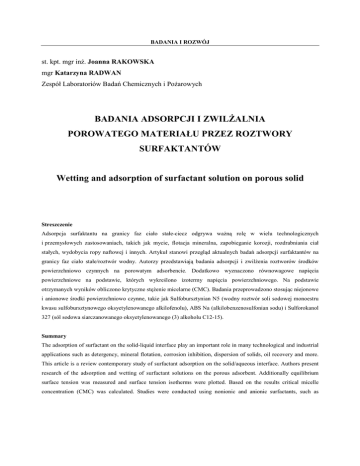 BADANIA I ROZWÓJ st. kpt. mgr inż. Joanna RAKOWSKA mgr Katarzyna RADWAN Zespół Laboratoriów Badań Chemicznych i Pożarowych BADANIA ADSORPCJI I ZWILŻALNIA POROWATEGO MATERIAŁU PRZEZ ROZTWORY SURFAKTANTÓW Wetting and adsorption of surfactant solution on porous solid Streszczenie Adsorpcja surfaktantu na granicy faz ciało stałe-ciecz odgrywa ważną rolę w wielu technologicznych i przemysłowych zastosowaniach, takich jak mycie, flotacja mineralna, zapobieganie korozji, rozdrabniania ciał stałych, wydobycia ropy naftowej i innych. Artykuł stanowi przegląd aktualnych badań adsorpcji surfaktantów na granicy faz ciało stałe/roztwór wodny. Autorzy przedstawiają badania adsorpcji i zwilżenia roztworów środków powierzchniowo czynnych na porowatym adsorbencie. Dodatkowo wyznaczono równowagowe napięcia powierzchniowe na podstawie, których wykreślono izotermy napięcia powierzchniowego. Na podstawie otrzymanych wyników obliczono krytyczne stężenie micelarne (CMC). Badania przeprowadzono stosując niejonowe i anionowe środki powierzchniowo czynne, takie jak Sulfobursztynian N5 (wodny roztwór soli sodowej monoestru kwasu sulfobursztynowego oksyetylenowanego alkilofenolu), ABS Na (alkilobenzenosulfonian sodu) i Sulforokanol 327 (sól sodowa siarczanowanego oksyetylenowanego (3) alkoholu C12-15). Summary The adsorption of surfactant on the solid-liquid interface play an important role in many technological and industrial applications such as detergency, mineral flotation, corrosion inhibition, dispersion of solids, oil recovery and more. This article is a review contemporary study of surfactant adsorption on the solid/aqueous interface. Authors present research of the adsorption and wetting of surfactant solutions on the porous adsorbent. Additionally equilibrium surface tension was measured and surface tension isotherms were plotted. Based on the results critical micelle concentration (CMC) was calculated. Studies were conducted using nonionic and anionic surfactants, such as BADANIA I ROZWÓJ Sulfobursztynian N-5 (Disodium Nonoxynol-5 Sulfosuccinate), ABS-Na (Sodium Dodecylbenzenesulfonate) and Sulforokanol L-327 (Sodium C12-15 Pareth-3 Sulfate). Słowa kluczowe: adsorpcja, zwilżanie, związek powierzchniowo czynny, napięcie powierzchniowe; Keywords: adsorption, wetting, surfactant, surface tension; Wstęp Procesy zachodzące na powierzchni kontaktujących się ze sobą faz, czyli na powierzchni międzyfazowej, odgrywają decydującą rolę w wielu zjawiskach fizycznych i chemicznych. Dynamiczne właściwości międzyfazowe roztworów związków powierzchniowo czynnych są istotne w licznych zastosowaniach technologicznych takich jak: pianotwórczość, trwałość piany, zdolności myjące, emulgujące i zwilżające [1]. Z tego powodu wiele badań poświęcono równowagowym i dynamicznym właściwościom adsorpcyjnym substancji powierzchniowo czynnych stosowanych w tych procesach. Wcześniejsze badania kinetyki adsorpcji skupiały się głównie na roztworach indywidualnych surfaktantów [2], [3], [4], [5] i [6]. Aktualnie badania koncentrują się na wieloskładnikowych układach związków powierzchniowo czynnych [7], [8], [9], [10], [11] i [12]. Wynika to z jednej strony trudności technologicznych otrzymania czystego indywidualnego surfaktantu, z drugiej zaś z faktu, że właściwości powierzchniowe mieszanin często są lepsze niż indywidualnych substancji powierzchniowo czynnych, czyli wykazują synergizm cech [13], [14] i [15]. Proces adsorpcji substancji rozpuszczonej na powierzchni swobodnej roztworu opisuje równanie Gibbsa (1), który wprowadził matematyczne równanie adsorpcji cząsteczek substancji rozpuszczonej (związków organicznych, alkoholi, kwasów tłuszczowych) na powierzchni cieczy[16]. W opisie tym zastosowano pojęcie nadmiaru powierzchniowego, oznaczone symbolem Γ, który wyraża różnicę między liczbą moli substancji nagromadzonej w fazie powierzchniowej o jednostkowej powierzchni, a ilością tejże substancji zawartej w równoważnej ilości fazy objętościowej. Równanie to zazwyczaj przedstawiane jest w postaci: BADANIA I ROZWÓJ Γ=− a ∂γ ( 1) RT ∂a T ,p w którym: Γ– nadmiar powierzchniowy, a – aktywność substancji rozpuszczonej w roztworze, γ – napięcie powierzchniowe, R – stała gazowa, T – temperatura. Równanie adsorpcji Gibbsa wiąże adsorpcję cząstek substancji rozpuszczonej na powierzchni rozpuszczalnika ze zmianą napięcia powierzchniowego. Gdy cząsteczki substancji rozpuszczonej gromadzą się na powierzchni swobodnej roztworu, powodują obniżenie napięcia powierzchniowego rozpuszczalnika natomiast cząsteczki substancji podwyższających napięcie powierzchniowe migrują z powierzchni do wnętrza cieczy. Adsorpcja cząsteczek surfaktantów na granicy faz jest zasadniczo kontrolowana przez dwa procesy: (1) dyfuzję cząsteczek surfaktantu do warstwy podpowierzchniowej z objętości roztworu i (2) adsorpcję cząsteczek surfaktantu z warstwy podpowierzchniowej na granicy faz. Model adsorpcji “kontrolowanej dyfuzją” zakłada miejscowa równowagę między warstwą podpowierzchniową i powierzchnią międzyfazową. Zatem szybkość adsorpcji jest determinowana przez transport masy z objętości roztworu do warstwy podpowierzchniowej, który jest opisany prawem dyfuzji Fick’a. Równanie dyfuzji może być rozwiązane przy zastosowaniu metod numerycznych przy założeniach warunków początkowych. Do ilościowego opisu procesu adsorpcji stosuje się równanie (2) Ward’a-Tordai [17]. Γ(t ) = 2 D cb t − ∫ c(τ )d π 0 t ( t − τ (2) ) w którym: t – czas od chwili powstania nowej powierzchni, D – współczynnik dyfuzji cząsteczkowej, τ – zmienna zależna od czasu, cb oraz c(τ) – odpowiednio stężenia roztworu w objętości i w warstwie podpowierzchniowej. BADANIA I ROZWÓJ W celu opisu danych eksperymentalnych stosuje się izotermy adsorpcji. Izoterma adsorpcji t