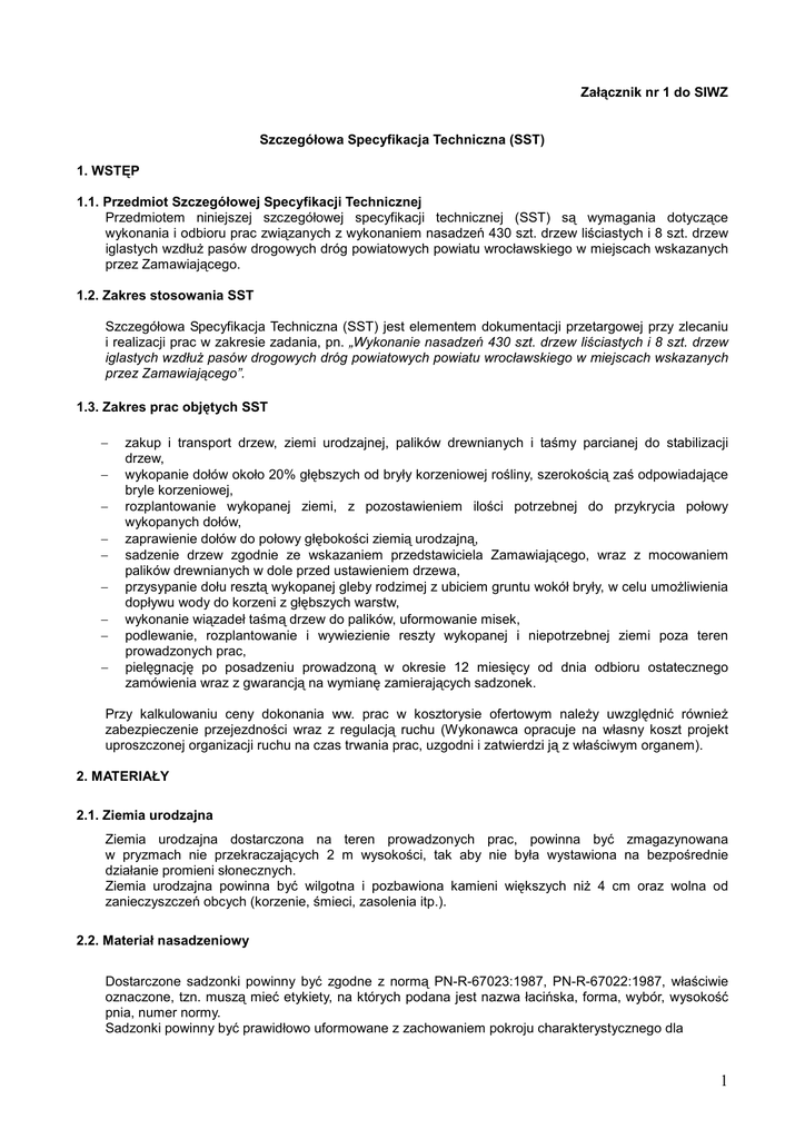 Załącznik nr 1 do SIWZ Szczegółowa Specyfikacja Techniczna (SST) 1. WSTĘP 1.1. Przedmiot Szczegółowej Specyfikacji Technicznej Przedmiotem niniejszej szczegółowej specyfikacji technicznej (SST) są wymagania dotyczące wykonania i odbioru prac związanych z wykonaniem nasadzeń 430 szt. drzew liściastych i 8 szt. drzew iglastych wzdłuż pasów drogowych dróg powiatowych powiatu wrocławskiego w miejscach wskazanych przez Zamawiającego. 1.2. Zakres stosowania SST Szczegółowa Specyfikacja Techniczna (SST) jest elementem dokumentacji przetargowej przy zlecaniu i realizacji prac w zakresie zadania, pn. „Wykonanie nasadzeń 430 szt. drzew liściastych i 8 szt. drzew iglastych wzdłuż pasów drogowych dróg powiatowych powiatu wrocławskiego w miejscach wskazanych przez Zamawiającego”. 1.3. Zakres prac objętych SST − − − − − − − − − zakup i transport drzew, ziemi urodzajnej, palików drewnianych i taśmy parcianej do stabilizacji drzew, wykopanie dołów około 20% głębszych od bryły korzeniowej rośliny, szerokością zaś odpowiadające bryle korzeniowej, rozplantowanie wykopanej ziemi, z pozostawieniem ilości potrzebnej do przykrycia połowy wykopanych dołów, zaprawienie dołów do połowy głębokości ziemią urodzajną, sadzenie drzew zgodnie ze wskazaniem przedstawiciela Zamawiającego, wraz z mocowaniem palików drewnianych w dole przed ustawieniem drzewa, przysypanie dołu resztą wykopanej gleby rodzimej z ubiciem gruntu wokół bryły, w celu umożliwienia dopływu wody do korzeni z głębszych warstw, wykonanie wiązadeł taśmą drzew do palików, uformowanie misek, podlewanie, rozplantowanie i wywiezienie reszty wykopanej i niepotrzebnej ziemi poza teren prowadzonych prac, pielęgnację po posadzeniu prowadzoną w okresie 12 miesięcy od dnia odbioru ostatecznego zamówienia wraz z gwarancją na wymianę zamierających sadzonek. Przy kalkulowaniu ceny dokonania ww. prac w kosztorysie ofertowym należy uwzględnić również zabezpieczenie przejezdności wraz z regulacją ruchu (Wykonawca opracuje na własny koszt projekt uproszczonej organizacji ruchu na czas trwania prac, uzgodni i zatwierdzi ją z właściwym organem). 2. MATERIAŁY 2.1. Ziemia urodzajna Ziemia urodzajna dostarczona na teren prowadzonych prac, powinna być zmagazynowana w pryzmach nie przekraczających 2 m wysokości, tak aby nie była wystawiona na bezpośrednie działanie promieni słonecznych. Ziemia urodzajna powinna być wilgotna i pozbawiona kamieni większych niż 4 cm oraz wolna od zanieczyszczeń obcych (korzenie, śmieci, zasolenia itp.). 2.2. Materiał nasadzeniowy Dostarczone sadzonki powinny być zgodne z normą PN-R-67023:1987, PN-R-67022:1987, właściwie oznaczone, tzn. muszą mieć etykiety, na których podana jest nazwa łacińska, forma, wybór, wysokość pnia, numer normy. Sadzonki powinny być prawidłowo uformowane z zachowaniem pokroju charakterystycznego dla 1 gatunku i odmiany. Bryła korzeniowa powinna być dobrze przerośnięta, odpowiednio duża i nie uszkodzona. W przypadku drzew z gruntu, bryła korzeniowa powinna być zabezpieczona tkaniną rozkładającą się najpóźniej w ciągu półtora roku po posadzeniu, a w przypadku drzew w pojemniku ( min C37), bryła korzeniowa powinna być silnie przerośnięta. Korzenie muszą być równomiernie rozłożone w pojemniku i widoczne po zewnętrznej stronie bryły korzeniowej. Korzenie nie mogą być zbite (sfilcowane). Wady niedopuszczalne: silne uszkodzenia mechaniczne drzew, ślady żerowania szkodników, oznaki chorobowe, zwiędnięcie i pomarszczenie kory na korzeniach i częściach naziemnych, martwice i pęknięcia kory z wyjątkiem typowych dla danego gatunku, uszkodzenie pąka szczytowego przewodnika bądź źle wykształcona korona, uszkodzenie lub przesuszenie bryły korzeniowej. Do czasu wysadzenia drzewa powinny być ocienione, osłonięte od wiatru i zabezpieczone przed wyschnięciem. − − − − − − − Do nasadzeń wytypowano drzewa liściaste i iglaste zestawione w tabeli: L.p. Gatunek (nazwa polska i łacińska) Rozstawa [m] Ilość szt. 1 Jarząb pospolity (Sorbus aucuparia) 10 50 2 Klon jawor (Acer pseudoplatanus) 10 50 3 Lipa drobnolistna (Tilia cordata) 10 100 4 Jesion wyniosły (Fraxinus excelsior) 10 70 5 Lipa drobnolistna (Tilia cordata) 10 80 6 Klon zwyczajny (Acer platanoides) 10 80 7 Świerk kłujący (Picea pungens) w określonych miejscach 8 Wielkość i wymagania jakościowe Cechy pojedyncze drzewa o wys. min. 3,0 m, forma pienna (Pa), obw. 8-12 cm, z bryłą korzeniową (B), zabezpieczone taśmą i palikami (2szt./drzewo) obwód pnia w tym przedziale mierzony na wysokości 1,0 m, korona ukształtowana na wys. min. 200 cm, całkowita wysokość drzewa min. 3,0 m. pojedyncze drzewa o wys. min. 1,5 m, forma pienna (Pa), obw. 6-8 cm, z bryłą korzeniową (B), zabezpieczone taśmą i palikiem (1szt./drzewo) - pojedyncze drzewa o wys. min. 1,8 cm, z bryłą korzeniową (B) - 2.3. Materiały dodatkowe 2.3.1 Paliki drewniane Konieczne do umocowania drzew sadzonych w ilości odpowiednio wg. wymagań w kosztorysie ofertowym po 2 lub po 1 na drzewo. Paliki powinny być o średnicy 8 cm i długości od 2,0 m do 2,5 m w zależności od wysokości danego drzewa. Wysokość palika wbitego w grunt powinna być równa co najmniej wysokości pnia posadzonego drzewa. 2.3.2. Wiązadła Taśma parciana elastyczna o szerokości min. 3 cm, zastosowana w celu zabezpieczenia i stablizacji nasadzonego materiału z palikiem, na działanie wiejących wiatrów. 3. SPRZĘT Wykonawca przystępujący do wykonania nasadzeń drzew powinien wykazać się możliwością korzystania z następującego sprzętu: − łopaty, grabie, taczki, sekatory do przycinania ewentualnych pędów korzeniowych, − sprzęt do podlewania roślin (np. beczkowozy, węże, wiadra), 2 − − − samochody do przewozu materiału roślinnego, ziemi urodzajnej, urobku i zanieczyszczeń, sprzęt do wykopania d