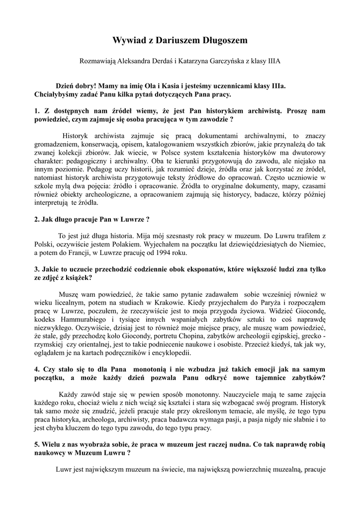 Wywiad z Dariuszem Długoszem Rozmawiają Aleksandra Derdaś i Katarzyna Garczyńska z klasy IIIA Dzień dobry! Mamy na imię Ola i Kasia i jesteśmy uczennicami klasy IIIa. Chciałybyśmy zadać Panu kilka pytań dotyczących Pana pracy. 1. Z dostępnych nam źródeł wiemy, że jest Pan historykiem archiwistą. Proszę nam powiedzieć, czym zajmuje się osoba pracująca w tym zawodzie ? Historyk archiwista zajmuje się pracą dokumentami archiwalnymi, to znaczy gromadzeniem, konserwacją, opisem, katalogowaniem wszystkich zbiorów, jakie przynależą do tak zwanej kolekcji zbiorów. Jak wiecie, w Polsce system kształcenia historyków ma dwutorowy charakter: pedagogiczny i archiwalny. Oba te kierunki przygotowują do zawodu, ale niejako na innym poziomie. Pedagog uczy historii, jak rozumieć dzieje, źródła oraz jak korzystać ze źródeł, natomiast historyk archiwista przygotowuje teksty źródłowe do opracowań. Często uczniowie w szkole mylą dwa pojęcia: źródło i opracowanie. Źródła to oryginalne dokumenty, mapy, czasami również obiekty archeologiczne, a opracowaniem zajmują się historycy, badacze, którzy później interpretują te źródła. 2. Jak długo pracuje Pan w Luwrze ? To jest już długa historia. Mija mój szesnasty rok pracy w muzeum. Do Luwru trafiłem z Polski, oczywiście jestem Polakiem. Wyjechałem na początku lat dziewięćdziesiątych do Niemiec, a potem do Francji, w Luwrze pracuję od 1994 roku. 3. Jakie to uczucie przechodzić codziennie obok eksponatów, które większość ludzi zna tylko ze zdjęć z książek? Muszę wam powiedzieć, że takie samo pytanie zadawałem sobie wcześniej również w wieku licealnym, potem na studiach w Krakowie. Kiedy przyjechałem do Paryża i rozpocząłem pracę w Luwrze, poczułem, że rzeczywiście jest to moja przygoda życiowa. Widzieć Giocondę, kodeks Hammurabiego i tysiące innych wspaniałych zabytków sztuki to coś naprawdę niezwykłego. Oczywiście, dzisiaj jest to również moje miejsce pracy, ale muszę wam powiedzieć, że stale, gdy przechodzę koło Giocondy, portretu Chopina, zabytków archeologii egipskiej, grecko rzymskiej czy orientalnej, jest to takie podniecenie naukowe i osobiste. Przecież kiedyś, tak jak wy, oglądałem je na kartach podręczników i encyklopedii. 4. Czy stało się to dla Pana monotonią i nie wzbudza już takich emocji jak na samym początku, a może każdy dzień pozwala Panu odkryć nowe tajemnice zabytków? Każdy zawód staje się w pewien sposób monotonny. Nauczyciele mają te same zajęcia każdego roku, chociaż wielu z nich wciąż się kształci i stara się wzbogacać swój program. Historyk tak samo może się znudzić, jeżeli pracuje stale przy określonym temacie, ale myślę, że tego typu praca historyka, archeologa, archiwisty, praca badawcza wymaga pasji, a pasja nigdy nie słabnie i to jest chyba kluczem do tego typu zawodu, do tego typu pracy. 5. Wielu z nas wyobraża sobie, że praca w muzeum jest raczej nudna. Co tak naprawdę robią naukowcy w Muzeum Luwru ? Luwr jest największym muzeum na świecie, ma największą powierzchnię muzealną, pracuje w nim kilka tysięcy ludzi - od kadry technicznej, sprzątającej, konserwatorów, mechaników, całe zaplecze techniczne, po kadrę archiwalną i naukową. Na przykład we wtorki, kiedy muzeum jest zamknięte dla zwiedzających (to jedyny taki dzień w tygodniu), te wszystkie zespoły ludzkie pracują nad konserwacją, czyszczeniem, przygotowywaniem kolejnych wystaw. Wszyscy dzielą się funkcjami. Gabloty muzealne trzeba otwierać, odświeżać, czyścić i odkurzać. Robią to specjalnie wyszkolone służby pracowników działu czyszczącego i zajmują się scenografią przyszłych wystaw. Oczywiście, są też konieczne naprawy, konserwacje techniczne, scenograficzne, a pracownicy muzeum, kustosze oraz archiwiści pracują nad zabytkami, jakie są im przydzielone. Na pewno wiecie, że każde muzeum posiada duży zasób magazynów, w których przechowuje się zbiory niepokazywane aktualnie albo stale gościom. To także są ogromne zbiory, które wymagają opracowania. 6. Skąd wzięło się pańskie zainteresowanie Biblią? Jak sobie zdajecie sprawę, Polska jest krajem katolickim, w którym się urodziłem. Nasza cywilizacja jest zbudowana na podstawach kultury judeochrześcijańskiej. Chrześcijaństwo, które narodziło się w Palestynie 2000 lat temu, wyrosło z religii żydowskiej i zrosło się w sposób bardzo naturalny z kulturą grecko - rzymską, potem z kulturami ludów Europy Środkowej i Wschodniej, czyli Słowianami. Dzisiaj to stanowi o podstawie kultury. Kiedy chodziłem do liceum nr 1 im. Marii Curie - Skłodowskiej w Szczecinie lata temu, mottem mojej klasy historii była wypowiedź historyka rzymskiego, prawnika bardzo znanego - Marka Tulliusza Cycerona, która brzmiała tak: „Nie wiedzieć, co działo się, nim przyszedłeś na świat, to znaczy na zawsze pozostać dzieckiem”. Każdy z nas pozostaje w jakimś sensie dzieckiem na całe życie i może to nawet jest dobre, ale chcemy przecież dorastać i poznawać świat. Wydaje mi się, że Biblia jest niewyczerpanym materiałem, źródłem historycznym, religijnym, filozoficznym, które ma ponadczasowy wymiar i jej poznawanie umożliwia nam to właśnie dojrzewanie, którego pragniemy i które jest nam potrzebne. 7. Czy był Pan w miejscu, gdzie odnaleziono Biblię. Jeżeli tak, to jakie wrażenia ma Pan z tej podróży? Tak. Jakiś czas temu byłem nad Morzem Martwym z wizytą w Ziemi Świętej. Okolo dwudziestu kilku kilometrów na południowy - wschód od Jerozolimy nad Morzem Martwym znajduje się tajemnicze miejsce. Ruiny zwane Hilbert Qumran, co po arabsku znaczy Ruiny Qumran. Tam właśnie w pobliskich grotach odnaleziono najstarsze rękopisy Starego Testamentu i teksty, które nazywamy parabiblijnymi, tzn. teksty, które maja charakter religijny, są inspirowane Biblią, ale których nie zaliczono oficjaln