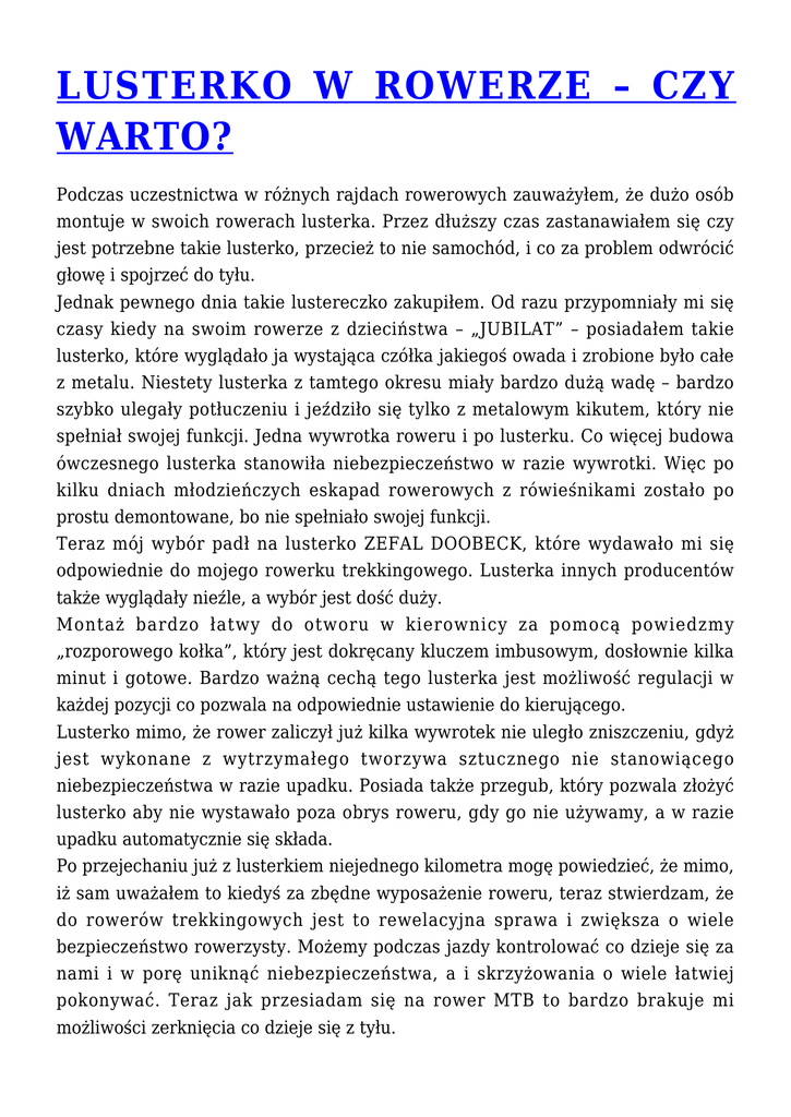 LUSTERKO W ROWERZE – CZY WARTO? Podczas uczestnictwa w różnych rajdach rowerowych zauważyłem, że dużo osób montuje w swoich rowerach lusterka. Przez dłuższy czas zastanawiałem się czy jest potrzebne takie lusterko, przecież to nie samochód, i co za problem odwrócić głowę i spojrzeć do tyłu. Jednak pewnego dnia takie lustereczko zakupiłem. Od razu przypomniały mi się czasy kiedy na swoim rowerze z dzieciństwa – „JUBILAT” – posiadałem takie lusterko, które wyglądało ja wystająca czółka jakiegoś owada i zrobione było całe z metalu. Niestety lusterka z tamtego okresu miały bardzo dużą wadę – bardzo szybko ulegały potłuczeniu i jeździło się tylko z metalowym kikutem, który nie spełniał swojej funkcji. Jedna wywrotka roweru i po lusterku. Co więcej budowa ówczesnego lusterka stanowiła niebezpieczeństwo w razie wywrotki. Więc po kilku dniach młodzieńczych eskapad rowerowych z rówieśnikami zostało po prostu demontowane, bo nie spełniało swojej funkcji. Teraz mój wybór padł na lusterko ZEFAL DOOBECK, które wydawało mi się odpowiednie do mojego rowerku trekkingowego. Lusterka innych producentów także wyglądały nieźle, a wybór jest dość duży. Montaż bardzo łatwy do otworu w kierownicy za pomocą powiedzmy „rozporowego kołka”, który jest dokręcany kluczem imbusowym, dosłownie kilka minut i gotowe. Bardzo ważną cechą tego lusterka jest możliwość regulacji w każdej pozycji co pozwala na odpowiednie ustawienie do kierującego. Lusterko mimo, że rower zaliczył już kilka wywrotek nie uległo zniszczeniu, gdyż jest wykonane z wytrzymałego tworzywa sztucznego nie stanowiącego niebezpieczeństwa w razie upadku. Posiada także przegub, który pozwala złożyć lusterko aby nie wystawało poza obrys roweru, gdy go nie używamy, a w razie upadku automatycznie się składa. Po przejechaniu już z lusterkiem niejednego kilometra mogę powiedzieć, że mimo, iż sam uważałem to kiedyś za zbędne wyposażenie roweru, teraz stwierdzam, że do rowerów trekkingowych jest to rewelacyjna sprawa i zwiększa o wiele bezpieczeństwo rowerzysty. Możemy podczas jazdy kontrolować co dzieje się za nami i w porę uniknąć niebezpieczeństwa, a i skrzyżowania o wiele łatwiej pokonywać. Teraz jak przesiadam się na rower MTB to bardzo brakuje mi możliwości zerknięcia co dzieje się z tyłu. Co Wy myślicie na ten temat?