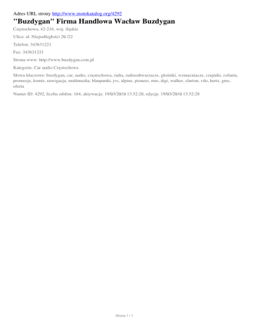 Adres URL strony http://www.motokatalog.org/4292 "Buzdygan" Firma Handlowa Wacław Buzdygan Częstochowa, 42-216, woj. śląskie Ulica: al. Niepodległości 20 /22 Telefon: 343631221 Fax: 343631221 Strona www: http://www.buzdygan.com.pl Kategorie: Car audio Częstochowa Słowa kluczowe: buzdygan, car, audio, częstochowa, radia, radioodtwarzacze, głośniki, wzmacniacze, czujniki, cofania, promocje, komis, nawigacja, multimedia, blaupunkt, jvc, alpine, pioneer, mio, digi, walker, clarion, vdo, hertz, gms, oferta Numer ID: 4292, liczba odsłon: 164, aktywacja: 19/03/2010 13:52:28, edycja: 19/03/2010 13:52:28 Strona 1 / 1