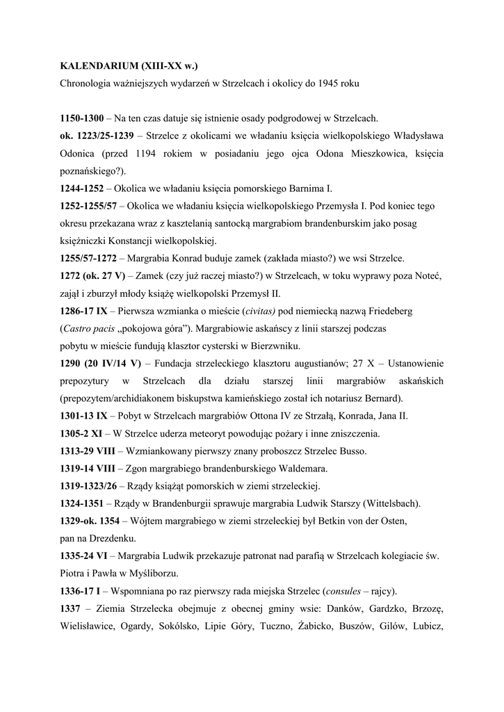 KALENDARIUM (XIII-XX w.) Chronologia ważniejszych wydarzeń w Strzelcach i okolicy do 1945 roku 1150-1300 – Na ten czas datuje się istnienie osady podgrodowej w Strzelcach. ok. 1223/25-1239 – Strzelce z okolicami we władaniu księcia wielkopolskiego Władysława Odonica (przed 1194 rokiem w posiadaniu jego ojca Odona Mieszkowica, księcia poznańskiego?). 1244-1252 – Okolica we władaniu księcia pomorskiego Barnima I. 1252-1255/57 – Okolica we władaniu księcia wielkopolskiego Przemysła I. Pod koniec tego okresu przekazana wraz z kasztelanią santocką margrabiom brandenburskim jako posag księżniczki Konstancji wielkopolskiej. 1255/57-1272 – Margrabia Konrad buduje zamek (zakłada miasto?) we wsi Strzelce. 1272 (ok. 27 V) – Zamek (czy już raczej miasto?) w Strzelcach, w toku wyprawy poza Noteć, zajął i zburzył młody książę wielkopolski Przemysł II. 1286-17 IX – Pierwsza wzmianka o mieście (civitas) pod niemiecką nazwą Friedeberg (Castro pacis „pokojowa góra”). Margrabiowie askańscy z linii starszej podczas pobytu w mieście fundują klasztor cysterski w Bierzwniku. 1290 (20 IV/14 V) – Fundacja strzeleckiego klasztoru augustianów; 27 X – Ustanowienie prepozytury w Strzelcach dla działu starszej linii margrabiów askańskich (prepozytem/archidiakonem biskupstwa kamieńskiego został ich notariusz Bernard). 1301-13 IX – Pobyt w Strzelcach margrabiów Ottona IV ze Strzałą, Konrada, Jana II. 1305-2 XI – W Strzelce uderza meteoryt powodując pożary i inne zniszczenia. 1313-29 VIII – Wzmiankowany pierwszy znany proboszcz Strzelec Busso. 1319-14 VIII – Zgon margrabiego brandenburskiego Waldemara. 1319-1323/26 – Rządy książąt pomorskich w ziemi strzeleckiej. 1324-1351 – Rządy w Brandenburgii sprawuje margrabia Ludwik Starszy (Wittelsbach). 1329-ok. 1354 – Wójtem margrabiego w ziemi strzeleckiej był Betkin von der Osten, pan na Drezdenku. 1335-24 VI – Margrabia Ludwik przekazuje patronat nad parafią w Strzelcach kolegiacie św. Piotra i Pawła w Myśliborzu. 1336-17 I – Wspomniana po raz pierwszy rada miejska Strzelec (consules – rajcy). 1337 – Ziemia Strzelecka obejmuje z obecnej gminy wsie: Danków, Gardzko, Brzozę, Wielisławice, Ogardy, Sokólsko, Lipie Góry, Tuczno, Żabicko, Buszów, Gilów, Lubicz, Przyłęg, Długie, Pielice, Sławno, a także Górki, Ługi, Kolsk, dobra cystersów z Bierzwnika, okolice Dobiegniewa. 1337-24 VIII – Strzelcom potwierdzono własność wsi Górki (Noteckie); -2 X – Wspomniany jest Młyn Dolny w Strzelcach. 1338 – Wspomniany jest sołtys (prefekt) – Strzelce siedzibą prowincjonalnego sądu lennego (iudicium vasallatus) dla rycerstwa i mieszczan – posesjonatów. 1344 -16 III – Mieszczanie otrzymują przywilej stawania tylko przed sądem miejscowym w obrębie murów miejskich. 1345-5 II – Strzelce otrzymują prawo swobodnej żeglugi z towarami po Polce: Noteci – Warcie – Odrze do Szczecina. 1348-5 II – Znana z dokumentu najstarsza pieczęć miejska sekretna o średnicy 40 mm (i herb). 1349-1 I – Przywilej bezcłowego handlu w całej Brandenburgii. 1350 – Wzmianka o strzeleckim archidiakonacie w ramach biskupstwa kamieńskiego. 1351-1365 – Rządy margrabiego Ludwika Rzymskiego (dynastia Wittelsbachów). 1354-7 X – Rajca Strzelec wchodzi w skład 8-osobowego zarządu Nowej Marchii. 1361-29 VI – Regionalne bractwo kalendowe przy kościele mariackim w Strzelcach otrzymuje nowy ołtarz św. Piotra i Pawła. 1363-2 X – Strzelce otrzymują przywilej urządzania cotygodniowego targu w soboty. 1365-1373 – Rządy margrabiego Ottona (Wittelsbach). 1366-13 VII – Margrabia Otton potwierdza prawa Miejskie. 1373-1402 – Rządy Luksemburgów (Karola IV, Jana Zgorzeleckiego do 1396 roku, Zygmunta do 1402 roku). 1373-28 VIII – Karol IV Luksemburski po przejęciu Brandenburgii z rąk Ottona Wittelsbacha potwierdza Strzelcom prawa i przywileje (w imieniu synów jako przyszłych margrabiów). ok. 1400 – Umiera w Strzelcach dr Jan Merkelin, doktor praw, teolog z miejscowego klasztoru augustianów. 1402-1454 – Strzelce jak Nowa Marchia pod panowaniem zakonu krzyżackiego. 1403-25 XII – Krzyżacy rewindykują miejskie młyny i miejsca po młynach. 1410 ok. 23 VI – Koncentracja w Strzelcach wojsk krzyżackich Nowej Marchii przed uderzeniem na Polskę. 1415 – Posiedzenie sądu inkwizycyjnego dla osądzenia heretyków. 1433-7 VI – Korpus husytów czeskich w toku wyprawy z Polakami do Nowej Marchii, po dwudniowym szturmie wdziera się do miasta, pali je i rabuje, okrutnie obchodzi się z duchowieństwem, w tym z augustianami; -30 XI – Strzelce otrzymują przywilej wyrębu drzewa budulcowego przez 5 lat w lasach zakonu. 1434 – Wspomniany archidiakon strzelecki Werner Griper. 1440 – Likwidacja archidiakonatu strzeleckiego. 1449 – Sławno wspomniane jako od dawna wieś Strzelec. 1450-18 VI – Z powodu pożaru zakon krzyżacki nadaje Strzelcom przywilej wyrębu drzewa w lasach państwowych. 1454-31 III – W kościele mariackim w Strzelcach odbywa się zjazd krajowy (Landtag) stanów Nowej Marchii, z udziałem delegacji polskiej w sprawie poddania się Polsce; -5 IV – miasto składa w Gorzowie hołd elektorowi brandenburskiemu, który 22 II t. r. nabył Nową Marchię od zakonu krzyżackiego. 1457 – Ziemia strzelecka zostaje częścią domeny w Drezdenku. 1465 – Burchard von Papstein dotąd na Chomętowie otrzymuje zamek i miasteczko Danków. 1467-23 IV – Rada miejska wykupuje od elektora sąd ziemski (iudicium provinciale) do osądzania lenników. 1481 – Ostatnia wzmianka o strzeleckim archidiakonacie przedreformacyjnym. 1498 – Pożar miasta. 1499-12-20 III – Elektor Joachim I i margrabia Albrecht odbierają hołd lenny od mieszczan; -20 III – Elektor potwierdza miastu prawo do urządzania jarmarków końskich i bydlęcych. 1510 – Strzelce otrzymują przywilej urządzania targów końskich w czwartki. 1512 – Potwierdzono miastu poło