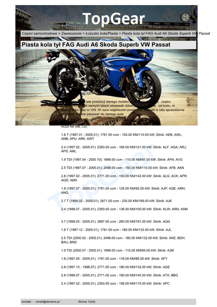 Utworzono : 04 marzec 2017 Części samochodowe > Zawieszenie > Łożysko koła/Piasta > Piasta kola tył FAG Audi A6 Skoda Superb VW Passat Piasta kola tył FAG Audi A6 Skoda Superb VW Passat Model : FAG713610500 Piasta kola tył FAG Audi A6 Skoda Superb VW Passat Producent : FAG No image Dane podstawowe: Srednica wewnetrzna [mm]: 39 Srednica zewnetrzna [mm]: 130 Szerokosc [mm]: 127 W nawiasach są lata produkcji danego modelu auta, a nie montażu części, producenci w tych samych latach stosowali różne części zależnie od kodu, nr silnika, roku oraz nr VIN. W razie wątpliwości prosimy o kontakt w celu sprawdzenia czy część będzie pasować do danego auta Stosowane: AUDI A6 (4B, C5) 1.8 T (1997.01 - 2005.01); 1781.00 ccm - 150.00 KM/110.00 kW; Silnik: AEB; AWL; ANB; APU; ARK; AWT r a 2.4 (1997.02 - 2005.01); 2393.00 ccm - 165.00 KM/121.00 kW; Silnik: ALF; AGA; ARJ; APS; AML e G 1.9 TDI (1997.04 - 2000.10); 1896.00 ccm - 110.00 KM/81.00 kW; Silnik: AFN; AVG 2.5 TDI (1997.07 - 2005.01); 2496.00 ccm - 150.00 KM/110.00 kW; Silnik: AFB; AKN p o T 2.8 (1997.02 - 2005.01); 2771.00 ccm - 193.00 KM/142.00 kW; Silnik: ALG; ACK; APR; AQD; AMX 1.8 (1997.07 - 2005.01); 1781.00 ccm - 125.00 KM/92.00 kW; Silnik: AJP; AQE; ARH; ANQ 2.7 T (1999.02 - 2005.01); 2671.00 ccm - 230.00 KM/169.00 kW; Silnik: AJK 2.4 (1998.07 - 2005.01); 2393.00 ccm - 136.00 KM/100.00 kW; Silnik: ALW; ARN; ASM 3.7 (1999.03 - 2005.01); 3697.00 ccm - 260.00 KM/191.00 kW; Silnik: AQG 1.8 T (1997.12 - 2005.01); 1781.00 ccm - 180.00 KM/132.00 kW; Silnik: AJL 2.5 TDI (2000.02 - 2005.01); 2496.00 ccm - 180.00 KM/132.00 kW; Silnik: AKE; BDH; BAU; BND 1.9 TDI (2000.07 - 2005.01); 1896.00 ccm - 115.00 KM/85.00 kW; Silnik: AJM 1.8 (1997.05 - 2005.01); 1781.00 ccm - 116.00 KM/85.00 kW; Silnik: AFY 2.8 (1997.10 - 1998.07); 2771.00 ccm - 180.00 KM/132.00 kW; Silnik: AGE 2.8 (1999.07 - 2005.01); 2771.00 ccm - 190.00 KM/140.00 kW; Silnik: ATX; BBG 2.4 (1997.02 - 2005.01); 2393.00 ccm - 156.00 KM/115.00 kW; Silnik: APC kontakt : - [email protected] Strona 1/{nb} Utworzono : 04 marzec 2017 Części samochodowe > Zawieszenie > Łożysko koła/Piasta > Piasta kola tył FAG Audi A6 Skoda Superb VW Passat Piasta kola tył FAG Audi A6 Skoda Superb VW Passat 2.0 (2001.08 - 2005.01); 1984.00 ccm - 130.00 KM/96.00 kW; Silnik: ALT 3.0 (2001.08 - 2005.01); 2976.00 ccm - 220.00 KM/162.00 kW; Silnik: ASN 2.4 (2001.08 - 2005.01); 2393.00 ccm - 170.00 KM/125.00 kW; Silnik: BDV 2.5 TDI (2001.08 - 2005.01); 2496.00 ccm - 155.00 KM/114.00 kW; Silnik: AYM 1.9 TDI (2001.08 - 2005.01); 1896.00 ccm - 130.00 KM/96.00 kW; Silnik: AVF; AWX 2.4 (1997.02 - 2005.01); 2393.00 ccm - 163.00 KM/120.00 kW; Silnik: AJG; APZ; AMM 2.5 TDI (2002.07 - 2005.01); 2496.00 ccm - 163.00 KM/120.00 kW; Silnik: BFC; BCZ; BDG AUDI A6 Avant (4B, C5) 1.9 TDI (1998.02 - 2001.04); 1896.00 ccm - 110.00 KM/81.00 kW; Silnik: AFN r a 1.8 (1997.12 - 2005.01); 1781.00 ccm - 125.00 KM/92.00 kW; Silnik: AJP; AQE; ARH 1.8 T (1997.12 - 2005.01); 1781.00 ccm - 150.00 KM/110.00 kW; Silnik: AEB; ANB; APU; ARK; AWT e G 2.4 (1997.12 - 2005.01); 2393.00 ccm - 165.00 KM/121.00 kW; Silnik: ALF; AGA; APS; ARJ; AML p o T 2.8 (1997.12 - 2005.01); 2771.00 ccm - 193.00 KM/142.00 kW; Silnik: ALG; ACK; APR; AQD; AMX 2.5 TDI (1997.12 - 2005.01); 2496.00 ccm - 150.00 KM/110.00 kW; Silnik: AFB; AKN 2.7 T (1999.02 - 2005.01); 2671.00 ccm - 230.00 KM/169.00 kW; Silnik: AJK 2.4 (1998.07 - 2005.01); 2393.00 ccm - 136.00 KM/100.00 kW; Silnik: ALW; ARN; ASM 3.7 (1999.03 - 2005.01); 3697.00 ccm - 260.00 KM/191.00 kW; Silnik: AQG 1.8 T (1999.04 - 2005.01); 1781.00 ccm - 180.00 KM/132.00 kW; Silnik: AJL 2.5 TDI (2000.02 - 2005.01); 2496.00 ccm - 180.00 KM/132.00 kW; Silnik: AKE; BAU; BDH 1.9 TDI (2000.07 - 2005.01); 1896.00 ccm - 115.00 KM/85.00 kW; Silnik: AJM 1.8 (1998.02 - 2005.01); 1781.00 ccm - 116.00 KM/85.00 kW; Silnik: AFY 2.8 (1997.12 - 1998.07); 2771.00 ccm - 180.00 KM/132.00 kW; Silnik: AGE 2.8 (1999.07 - 2005.01); 2771.00 ccm - 190.00 KM/140.00 kW; Silnik: ATX 2.4 (1997.12 - 2005.01); 2393.00 ccm - 156.00 KM/115.00 kW; Silnik: APC kontakt : - [email protected] Strona 2/{nb} Utworzono : 04 marzec 2017 Części samochodowe > Zawieszenie > Łożysko koła/Piasta > Piasta kola tył FAG Audi A6 Skoda Superb VW Passat Piasta kola tył FAG Audi A6 Skoda Superb VW Passat 2.0 (2001.08 - 2005.01); 1984.00 ccm - 130.00 KM/96.00 kW; Silnik: ALT 2.4 (2001.08 - 2005.01); 2393.00 ccm - 170.00 KM/125.00 kW; Silnik: BDV 2.5 TDI (2001.08 - 2005.01); 2496.00 ccm - 155.00 KM/114.00 kW; Silnik: AYM 3.0 (2001.08 - 2005.01); 2976.00 ccm - 220.00 KM/162.00 kW; Silnik: ASN 1.9 TDI (2001.08 - 2005.01); 1896.00 ccm - 130.00 KM/96.00 kW; Silnik: AVF; AWX 2.4 (1997.12 - 2005.01); 2393.00 ccm - 163.00 KM/120.00 kW; Silnik: AJG; APZ; AMM 2.5 TDI (2002.07 - 2005.01); 2496.00 ccm - 163.00 KM/120.00 kW; Silnik: BFC; BCZ; BDG SKODA SUPERB (3U4) 1.8 T (2002.02 - 2008.03); 1781.00 ccm - 150.00 KM/110.00 kW; Silnik: AWT r a 2.0 (2002.02 - 2008.03); 1984.00 ccm - 115.00 KM/85.00 kW; Silnik: AZM 2.8 V6 (2002.02 - 2008.03); 2771.00 ccm - 193.00 KM/142.00 kW; Silnik: AMX e G 1.9 TDI (2002.02 - 2008.03); 1896.00 ccm - 130.00 KM/96.00 kW; Silnik: AWX; AVF 2.5 TDI (2002.02 - 2003.08); 2496.00 ccm - 155.00 KM/114.00 kW; Silnik: AYM 1.9 TDI (2002.08 - 2005.10); 1896.00 ccm - 101.00 KM/74.00 kW; Silnik: AVB p o T 2.5 TDI (2003.06 - 2008.03); 2496.00 ccm - 163.00 KM/120.00 kW; Silnik: BDG 2.0 TDI (2005.10 - 2008.03); 1968.00 ccm - 140.00 KM/103.00 kW; Silnik: BSS 1.9 TDI (2007.01 - 2008.03); 1896.00 ccm - 115.00 KM/85.00 kW; Silnik: BPZ 1.9 TDI (2005.10 - 2007.05); 1896.00 ccm - 105.00 KM/77.00 kW; Silnik: BSV VW PASSAT (3B2) 1.6 (1996.10 - 2000.11); 1595.00 ccm - 101.00 KM/74.00 kW; Silnik: AHL; ANA; ARM; ADP 1.8 (1996.10 - 2000.11); 1781.00 ccm - 125.00 KM/92.00 kW; Silnik: ADR; APT; ARG 1.8 T (1996.10 - 2000.11); 1781.00 ccm - 150.00 KM/110.00 kW; Silnik: AEB; ANB; APU 2.3 VR5 (1996.10 - 2000.11); 2324.00 ccm - 150.00 KM/110.00 kW; Silnik: AGZ 1.9 TDI (1