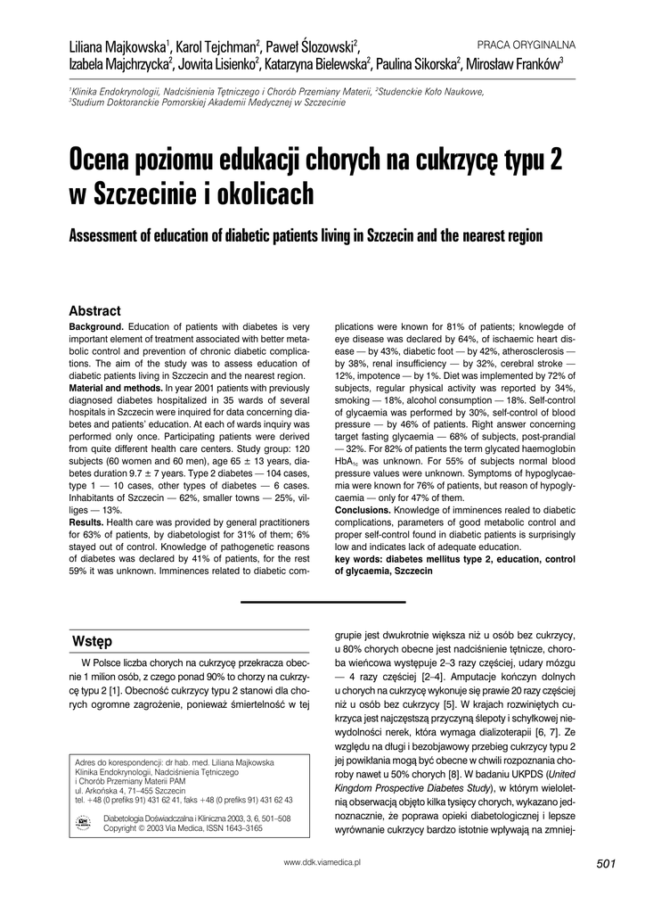 PRACA ORYGINALNA Liliana Majkowska1, Karol Tejchman2, Paweł Ślozowski2, 2 2 2 2 Izabela Majchrzycka , Jowita Lisienko , Katarzyna Bielewska , Paulina Sikorska , Mirosław Franków3 1 3 Klinika Endokrynologii, Nadciśnienia Tętniczego i Chorób Przemiany Materii, 2Studenckie Koło Naukowe, Studium Doktoranckie Pomorskiej Akademii Medycznej w Szczecinie Ocena poziomu edukacji chorych na cukrzycę typu 2 w Szczecinie i okolicach Assessment of education of diabetic patients living in Szczecin and the nearest region Abstract Background. Education of patients with diabetes is very important element of treatment associated with better metabolic control and prevention of chronic diabetic complications. The aim of the study was to assess education of diabetic patients living in Szczecin and the nearest region. Material and methods. In year 2001 patients with previously diagnosed diabetes hospitalized in 35 wards of several hospitals in Szczecin were inquired for data concerning diabetes and patients’ education. At each of wards inquiry was performed only once. Participating patients were derived from quite different health care centers. Study group: 120 subjects (60 women and 60 men), age 65 ± 13 years, diabetes duration 9.7 ± 7 years. Type 2 diabetes — 104 cases, type 1 — 10 cases, other types of diabetes — 6 cases. Inhabitants of Szczecin — 62%, smaller towns — 25%, villiges — 13%. Results. Health care was provided by general practitioners for 63% of patients, by diabetologist for 31% of them; 6% stayed out of control. Knowledge of pathogenetic reasons of diabetes was declared by 41% of patients, for the rest 59% it was unknown. Imminences related to diabetic com- Wstęp W Polsce liczba chorych na cukrzycę przekracza obecnie 1 milion osób, z czego ponad 90% to chorzy na cukrzycę typu 2 [1]. Obecność cukrzycy typu 2 stanowi dla chorych ogromne zagrożenie, ponieważ śmiertelność w tej Adres do korespondencji: dr hab. med. Liliana Majkowska Klinika Endokrynologii, Nadciśnienia Tętniczego i Chorób Przemiany Materii PAM ul. Arkońska 4, 71–455 Szczecin tel. +48 (0 prefiks 91) 431 62 41, faks +48 (0 prefiks 91) 431 62 43 Diabetologia Doświadczalna i Kliniczna 2003, 3, 6, 501–508 Copyright © 2003 Via Medica, ISSN 1643–3165 plications were known for 81% of patients; knowlegde of eye disease was declared by 64%, of ischaemic heart disease — by 43%, diabetic foot — by 42%, atherosclerosis — by 38%, renal insufficiency — by 32%, cerebral stroke — 12%, impotence — by 1%. Diet was implemented by 72% of subjects, regular physical activity was reported by 34%, smoking — 18%, alcohol consumption — 18%. Self-control of glycaemia was performed by 30%, self-control of blood pressure — by 46% of patients. Right answer concerning target fasting glycaemia — 68% of subjects, post-prandial — 32%. For 82% of patients the term glycated haemoglobin HbA1c was unknown. For 55% of subjects normal blood pressure values were unknown. Symptoms of hypoglycaemia were known for 76% of patients, but reason of hypoglycaemia — only for 47% of them. Conclusions. Knowledge of imminences realed to diabetic complications, parameters of good metabolic control and proper self-control found in diabetic patients is surprisingly low and indicates lack of adequate education. key words: diabetes mellitus type 2, education, control of glycaemia, Szczecin grupie jest dwukrotnie większa niż u osób bez cukrzycy, u 80% chorych obecne jest nadciśnienie tętnicze, choroba wieńcowa występuje 2–3 razy częściej, udary mózgu — 4 razy częściej [2–4]. Amputacje kończyn dolnych u chorych na cukrzycę wykonuje się prawie 20 razy częściej niż u osób bez cukrzycy [5]. W krajach rozwiniętych cukrzyca jest najczęstszą przyczyną ślepoty i schyłkowej niewydolności nerek, która wymaga dializoterapii [6, 7]. Ze względu na długi i bezobjawowy przebieg cukrzycy typu 2 jej powikłania mogą być obecne w chwili rozpoznania choroby nawet u 50% chorych [8]. W badaniu UKPDS (United Kingdom Prospective Diabetes Study), w którym wieloletnią obserwacją objęto kilka tysięcy chorych, wykazano jednoznacznie, że poprawa opieki diabetologicznej i lepsze wyrównanie cukrzycy bardzo istotnie wpływają na zmniej- www.ddk.viamedica.pl 501 Diabetologia Doświadczalna i Kliniczna rok 2003, tom 3, nr 6 szenie ryzyka rozwoju powikłań cukrzycowych [9]. Zgodnie z wynikami tego badania obniżenie stężenia hemoglobiny glikowanej (HbA1c) o 1% zmniejsza ryzyko zgonów o 14%, wszystkich powikłań naczyniowych o 21%, zawałów serca o 14%, udarów mózgu o 12%, mikroangiopatii o 37% i chorób naczyń obwodowych o 43%. Świadomość zagrożeń związanych z cukrzycą doprowadziła już w 1989 roku do wspólnej konferencji pacjentów, lekarzy oraz Międzynarodowej Federacji Cukrzycowej i Światowej Organizacji Zdrowia, która odbyła się w Saint Vincent we Włoszech [10]. Podczas konferencji wszystkie kraje europejskie, w tym także Polska, przyjęły Deklarację St Vincent, zgodnie z którą poprawa opieki diabetologicznej i wprowadzenie skutecznych metod zapobiegania kosztownym powikłaniom cukrzycy miało w ciągu 5 lat doprowadzić do zmniejszenia liczby: nowych przypadków ślepoty spowodowanej cukrzycą o co najmniej 1/3, chorych ze schyłkową niewydolnością nerek na tle nefropatii cukrzycowej także przynajmniej o 1/3, amputacji spowodowanych stopą cukrzycową o 1/2, a także do zmniejszenia chorobowości i umieralności chorych na cukrzycę z powodu choroby wieńcowej poprzez wprowadzenie programów zwalczania czynników ryzyka. Powyższe cele Deklaracji St. Vincent są na ogół dobrze znane, jednak ich realizacja, nawet w krajach wysoko rozwiniętych z dobrze funkcjonującym systemem opieki zdrowotnej, często pozostawia wiele do życzenia [11, 12]. Rzadko natomiast przytacza się inne wytyczne zawarte w deklaracji, które mówią, że celem działania powinno być między inn