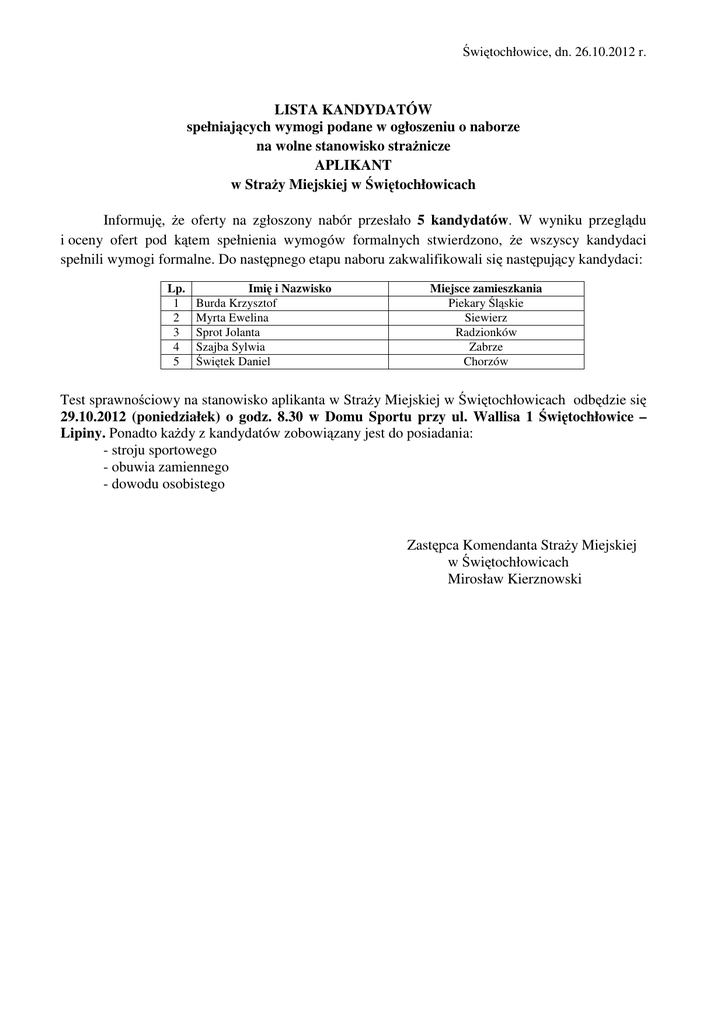 Świętochłowice, dn. 26.10.2012 r. LISTA KANDYDATÓW spełniających wymogi podane w ogłoszeniu o naborze na wolne stanowisko strażnicze APLIKANT w Straży Miejskiej w Świętochłowicach Informuję, że oferty na zgłoszony nabór przesłało 5 kandydatów. W wyniku przeglądu i oceny ofert pod kątem spełnienia wymogów formalnych stwierdzono, że wszyscy kandydaci spełnili wymogi formalne. Do następnego etapu naboru zakwalifikowali się następujący kandydaci: Lp. 1 2 3 4 5 Imię i Nazwisko Burda Krzysztof Myrta Ewelina Sprot Jolanta Szajba Sylwia Świętek Daniel Miejsce zamieszkania Piekary Śląskie Siewierz Radzionków Zabrze Chorzów Test sprawnościowy na stanowisko aplikanta w Straży Miejskiej w Świętochłowicach odbędzie się 29.10.2012 (poniedziałek) o godz. 8.30 w Domu Sportu przy ul. Wallisa 1 Świętochłowice – Lipiny. Ponadto każdy z kandydatów zobowiązany jest do posiadania: - stroju sportowego - obuwia zamiennego - dowodu osobistego Zastępca Komendanta Straży Miejskiej w Świętochłowicach Mirosław Kierznowski