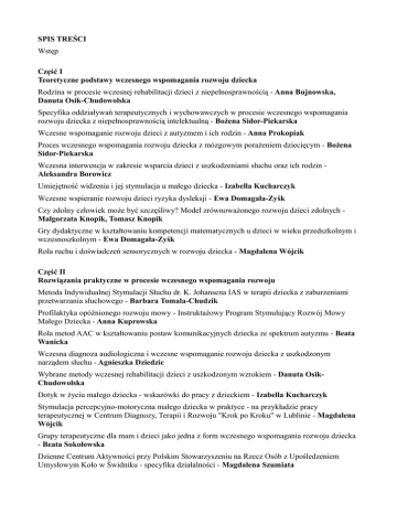 SPIS TREŚCI Wstęp Część I Teoretyczne podstawy wczesnego wspomagania rozwoju dziecka Rodzina w procesie wczesnej rehabilitacji dzieci z niepełnosprawnością - Anna Bujnowska, Danuta Osik-Chudowolska Specyfika oddziaływań terapeutycznych i wychowawczych w procesie wczesnego wspomagania rozwoju dziecka z niepełnosprawnością intelektualną - Bożena Sidor-Piekarska Wczesne wspomaganie rozwoju dzieci z autyzmem i ich rodzin - Anna Prokopiak Proces wczesnego wspomagania rozwoju dziecka z mózgowym porażeniem dziecięcym - Bożena Sidor-Piekarska Wczesna interwencja w zakresie wsparcia dzieci z uszkodzeniami słuchu oraz ich rodzin Aleksandra Borowicz Umiejętność widzenia i jej stymulacja u małego dziecka - Izabella Kucharczyk Wczesne wspieranie rozwoju dzieci ryzyka dysleksji - Ewa Domagała-Zyśk Czy zdolny człowiek może być szczęśliwy? Model zrównoważonego rozwoju dzieci zdolnych Małgorzata Knopik, Tomasz Knopik Gry dydaktyczne w kształtowaniu kompetencji matematycznych u dzieci w wieku przedszkolnym i wczesnoszkolnym - Ewa Domagała-Zyśk Rola ruchu i doświadczeń sensorycznych w rozwoju dziecka - Magdalena Wójcik Część II Rozwiązania praktyczne w procesie wczesnego wspomagania rozwoju Metoda Indywidualnej Stymulacji Słuchu dr. K. Johansena IAS w terapii dziecka z zaburzeniami przetwarzania słuchowego - Barbara Tomala-Chudzik Profilaktyka opóźnionego rozwoju mowy - Instruktażowy Program Stymulujący Rozwój Mowy Małego Dziecka - Anna Kuprowska Rola metod AAC w kształtowaniu postaw komunikacyjnych dziecka ze spektrum autyzmu - Beata Wanicka Wczesna diagnoza audiologiczna i wczesne wspomaganie rozwoju dziecka z uszkodzonym narządem słuchu - Agnieszka Dziedzic Wybrane metody wczesnej rehabilitacji dzieci z uszkodzonym wzrokiem - Danuta OsikChudowolska Dotyk w życiu małego dziecka - wskazówki do pracy z dzieckiem - Izabella Kucharczyk Stymulacja percepcyjno-motoryczna małego dziecka w praktyce - na przykładzie pracy terapeutycznej w Centrum Diagnozy, Terapii i Rozwoju "Krok po Kroku" w Lublinie - Magdalena Wójcik Grupy terapeutyczne dla mam i dzieci jako jedna z form wczesnego wspomagania rozwoju dziecka - Beata Sokołowska Dzienne Centrum Aktywności przy Polskim Stowarzyszeniu na Rzecz Osób z Upośledzeniem Umysłowym Koło w Świdniku - specyfika działalności - Magdalena Szumiata Fundacja Wcześniak Rodzice - Rodzicom - Magdalena Sadecka-Makaruk Część III Z doświadczeń rodziców z zakresu wczesnego wspomagania rozwoju ich dzieci Piotr - Agnieszka S. - mama Piotra Maciej - Natalia D. - mama Macieja Martyna - Dorota Ś. - mama Martyny Kamila - Elżbieta F. - mama Kamili Dominika - Agnieszka i Mirosław J. - rodzice Dominiki