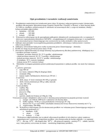 Załącznik nr 5 Opis przedmiotu i warunków realizacji zamówienia 1. Przedmiotem zamówienia jest świadczenie przez okres 36 miesięcy usług przygotowywania i dostarczania posiłków dla pacjentów Specjalistycznego Zespołu Chorób Płuc i Gruźlicy w Bystrej, w ilości łącznej około 615 000 tys. posiłków zróŜnicowanych w zaleŜności od stosowanych diet, z czego na śniadania, obiady i kolacje przypada odpowiednio: • śniadania - 205 000 • obiady - 205 000 • kolacje - 205 000 2. Wykonawca zobowiązuje się do sporządzania jadłospisów dekadowych i przekazaniem ich z co najmniej 3 dniowym wyprzedzeniem dietetykowi SZChPiG , uwzględniających wymagania dotyczące w szczególności diet stosowanych przez Zamawiającego oraz sezonowości na rynku artykułów rolno-spoŜywczych. 3. Jadłospis musi posiadać wyszczególnioną gramaturę produktów, informację o kaloryczności i wartości odŜywczej posiłków 4. Jadłospisy zatwierdzane będą przez osobę wyznaczoną przez Zamawiającego – dietetyka. 5. Posiłki nie mogą się powtarzać przez okres 10 dni . 7. Procentowe zapotrzebowanie na energii dziennej racji pokarmowej dla diety podstawowej składającej się z 3 posiłków powinno wynosić : - śniadanie powinno stanowić 20- 25 % posiłku całodziennego. - obiad powinien stanowić 50 -55 % posiłku całodziennego - kolacja powinna stanowić 20-25 % posiłku całodziennego - II śniadanie 50 % wartości śniadania - kolacja nocna 50 % wartości kolacji 8.. Minimalna wymagana gramatura potraw podawanych pacjentom w jednym posiłku nie moŜe być mniejsza niŜ : 1) potrawy gotowane: • zupa 400 ml • ryŜ, kasze, makaron 200g do drugiego dania • ziemniaki 200g. • napoje ciepłe ( herbata,kawa zboŜowa po 250 ml. ) 2) surowiec • drób, mięsa b/ kości minimum 80-100 g I gatunek • drób z kością minimum po 200 g ( udka, kurczak • ryby 100-120 g 3) inne produkty • wędliny 40g • podroby 60g • pieczywo 100g • masło 10g • surówki, sałatki do II dania od 100g do 130g 9.Zawartość energii i składników odŜywczych w dziennej porcji pokarmowej pacjenta powinna wynosić a. energia od 2100 do 2400 kcal w zaleŜności od zleconej diety b. białko ogółem 70-80 g w tym pochodzenia zwierzęcego 20- 25g c. tłuszcze 65-75 g w tym NNKT (niezbędne nienasycone kwasy tłuszczowe) niemniej niŜ 4-7 g d. węglowodany 300-400g 10. Wykonawca zobowiązany jest do dostarczania posiłków we wskazane przez Zamawiającego miejsce w określonych godzinach, tj.: • śniadanie - 8:00 • obiad - 13:00 • kolacja - 17:00. 11. Wykonawca odpowiedzialny jest za jakość oferowanych posiłków tj ich właściwe walory smakowe, organoleptyczne i estetyczne, temperaturę posiłków przy dostarczeniu do kuchni oddziału ( co najmniej 75° C – dla zup, 63°C – dla drugich dań, 80° C – dla gorących napojów, poniŜej 4° C – sałatki, surówki sosy i inne potrawy serwowane na zimno – monitoring temperatury posiłków. _______________________________________________________________________ Załącznik do SIWZ – postępowanie nr: 49/EZP/380//NPP/2/2011 12. Wykonawca zobowiązany jest do systematycznego dostarczenia posiłków na podstawie codziennych zamówień, składanych z jednodniowym wyprzedzeniem do godziny 10:00 przez dietetyka SZChPiG. na dobowym rozdzielniku porcji wraz z relewami 13. Wraz z posiłkami Wykonawca zobowiązany jest do dostarczania ilościowego wykazu przekazywanych posiłków z relewy. 14. W ciągu dnia mogą zachodzić zmiany ilości wydawanych posiłków oraz zmiany rodzaju diet, będą one zgłaszane przed wydaniem kaŜdego posiłku. 15. Dzienna ilość posiłków wg zaleconych diet będzie wynikała z liczby hospitalizowanych pacjentów oraz ze wskazań medyczno- dietetycznych a) trzy posiłki – śniadanie, obiad, kolacja: dieta podstawowa, lekkostrawna, wrzodowo - Ŝołądkowa , wątrobowa, niskokaloryczna, cukrzycowa, bezsolna, płynna wzbogacona, specjalna b) pięć posiłków – śniadanie, II śniadanie, obiad, kolacja, kolacja nocna : dieta cukrzycowa wg wskazań medycznych, wysokobiałkowa, specjalna. 16. Podana w pkt. 1 ilość posiłków moŜe ulec zmianie w zaleŜności od ilości pacjentów. 17. Wykonawca winien dostarczyć gotowe posiłki w opakowaniach szczelnie izotermicznych, opisanych rodzajem diet dla kaŜdego oddziału, własnym transportem do wyznaczonego celu tj na poszczególne oddziały szpitalne: • Oddział Pulmonologiczny I • Oddział Chorób Płuc i Gruźlicy • Oddział Pulmonologiczno-Alergologiczny • Oddział Chorób Wewnętrznych • Oddział Pulmonologiczny III • Oddział Chirurgii Klatki Piersiowej • Oddział Rehabilitacji Oddechowej w sposób gwarantujący przestrzeganie norm higienicznych oraz utrzymanie właściwej temperatury posiłków, skąd posiłki do sal roznosi personel Zamawiającego. Naczynia w których dostarczone będą posiłki muszą posiadać wszelkie niezbędne atesty i dopuszczenia 18. Wykonawca jest zobowiązany do odbioru brudnych pojemników i termosów z oddziału w celu ich umycia i przeprowadzeniu odpowiedniej dezynfekcji. - po śniadaniu do godz. 10:00 - po obiedzie do godz. 14:30 - po kolacji do godz. 18:00 19. Układ diet objętych systemem dietetycznym oraz szacowane ilości osobodni w ramach diet: 1) Dieta podstawowa - 130000 - dla chorych przebywających w szpitalu, a nie wymagających Ŝywienia dietetycznego. 2) Dieta z ograniczeniem substancji pobudzających wydzielanie soku Ŝołądkowego - 3400 - ma zastosowanie w chorobie wrzodowej Ŝołądka i dwunastnicy, nadkwaśności Ŝołądka – ograniczenie wydzielania soku Ŝołądkowego, oraz niedraŜnienie mechanicznie, chemicznie i termicznie błony śluzowej Ŝołądka. 3) Dieta z ograniczeniem tłuszczu i błonnika - 13500 - dieta stosowana jest przy zapaleniu pęcherzyka Ŝółciowego, zapaleniu trzustki, kamicy pęcherzyka Ŝółciowego i innych chorobach. 4) Dieta lekkostrawna– oszczędzająca pr