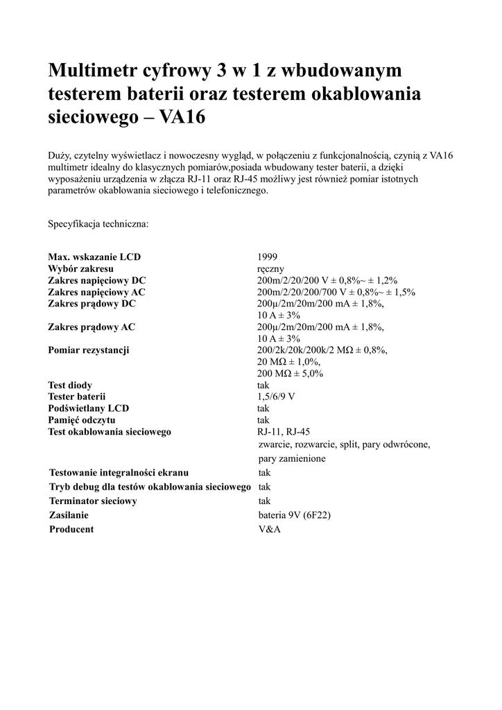 Multimetr cyfrowy 3 w 1 z wbudowanym testerem baterii oraz testerem okablowania sieciowego – VA16 Duży, czytelny wyświetlacz i nowoczesny wygląd, w połączeniu z funkcjonalnością, czynią z VA16 multimetr idealny do klasycznych pomiarów,posiada wbudowany tester baterii, a dzięki wyposażeniu urządzenia w złącza RJ-11 oraz RJ-45 możliwy jest również pomiar istotnych parametrów okablowania sieciowego i telefonicznego. Specyfikacja techniczna: Max. wskazanie LCD Wybór zakresu Zakres napięciowy DC Zakres napięciowy AC Zakres prądowy DC 1999 ręczny 200m/2/20/200 V ± 0,8%~ ± 1,2% 200m/2/20/200/700 V ± 0,8%~ ± 1,5% 200µ/2m/20m/200 mA ± 1,8%, 10 A ± 3% Zakres prądowy AC 200µ/2m/20m/200 mA ± 1,8%, 10 A ± 3% Pomiar rezystancji 200/2k/20k/200k/2 MΩ ± 0,8%, 20 MΩ ± 1,0%, 200 MΩ ± 5,0% Test diody tak Tester baterii 1,5/6/9 V Podświetlany LCD tak Pamięć odczytu tak Test okablowania sieciowego RJ-11, RJ-45 zwarcie, rozwarcie, split, pary odwrócone, pary zamienione Testowanie integralności ekranu tak Tryb debug dla testów okablowania sieciowego tak Terminator sieciowy tak Zasilanie bateria 9V (6F22) Producent V&A