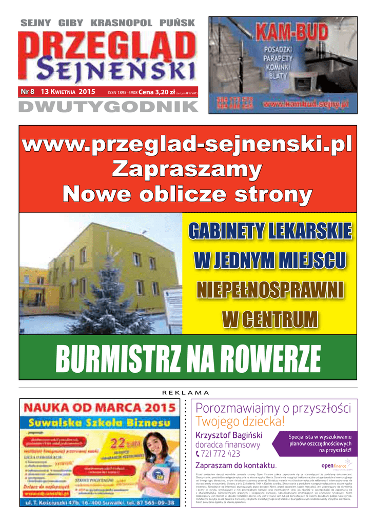 SEJNY GIBY KRASNOPOL PUŃSK Nr 8 13 Kwietnia 2015 ISSN 1895–5908 Cena 3,20 zł (w tym 8 % VAT) www.przeglad-sejnenski.pl Zapraszamy Nowe oblicze strony GABINETY LEKARSKIE W JEDNYM MIEJSCU NIEPEŁNOSPRAWNI W CENTRUM BURMISTRZ NA ROWERZE REKLAMA 2 reklama PRZEGLĄD SEJNEŃSKI PRZEGLĄD SEJNEŃSKI temat tygodnia 3 GABINETY LEKARSKIE W JEDNYM MIEJSCU NIEPEŁNOSPRAWNI W CENTRUM Gabinety lekarzy SP ZOZ na ul. Wojska Polskiego, niepełnosprawni – w budynku przy ul. 1-Maja? Taką zamianę rozpatrują wszyscy zainteresowani. Budynek przychodni przy ul. 1-Maja należy do miasta, które użycza go powiatowi, a ten – zakładowi opieki zdrowotnej. W obiekcie mieszczą się gabinety lekarzy rodzinnych i protetyka. Z kolei duży gmach przy ul. Wojska Polskiego jest powiatowy, użyczony SP ZOZ-owi, a ten część pomieszczeń udziela Regionalnemu Stowarzyszeniu na Rzecz Osób Niepełnosprawnych, prowadzącemu Warsztaty Terapii Zajęciowej. Znajdują się tam też gabinety rehabilitacji i lekarzy specjalistów. Oba budynki są więc formalnie w zarządzie SP ZOZ. Skomplikowane relacje właściciel-najemca mogą się jeszcze zmienić, o ile będzie to korzystne dla każdej ze stron. Z inicjatywą przeniesienia niepełnosprawnych do budynku na 1-Maja wystąpił dyrektor SP ZOZ Waldemar Kwaterski. Wszystkie „zozowskie” gabinety lekarskie byłyby wówczas zebrane w jednym miejscu – w ogrzewanej pompami głębinowymi przychodni na Wojska Polskiego. O wyjaśnienia w tej sprawie pytał na powiatowej sesji radny Józef Stankiewicz. Powiedział on w czasie obrad, że był współtwórcą stowarzyszenia niepełnosprawnych w Sejnach. Własnym samochodem jeździł z pracownicą WTZ po powiecie, aby namawiać chętnych. Zebrali grupę trzydziestu osób. - Te warsztaty funkcjonują dwanaście lat. Teraz mówi się coraz głośniej o przenoszeniu. Nikt nic nie wie – powiedział radny. - Z tej racji, że sam jestem osobą niepełnosprawną, znam potrzeby osób niepełnosprawnych. Nie szczędziłem ani czasu, ani pieniędzy, ani samochodu, żeby to zorganizować. Stankiewicz chciał wiedzieć, czy Warsztaty będą przeniesione do budynku przy ul. 1-Maja, czy też nie. Starosta Piotr Alszko wyjaśniał, że odbyło się już kilka spotkań z udziałem jego, burmistrza Sejn Arkadiusza Nowalskiego oraz dyrektora SP ZOZ i prezesa Regionalnego Stowarzyszenia na rzecz Osób Niepełnosprawnych, Krzysztofa Kozakiewicza. - Żadne decyzje nie zapadły, na dzień dzisiejszy jest to w fazie uzgadniania, czy jest to możliwe, czy jest realne – mówił starosta. - Lokalowo wszystko gra. Chodzi tylko o jedno, o windę – tłumaczył Stankiewicz. Argumentował on, że budowę windy w przychodni na Wojska Polskiego sfinansował PFRON. Drugiego dźwigu już nie zafunduje. Radny pytał, czy w razie przenosin powiat dołoży do budowy nowej windy. Starosta Alszko oświadczył, że nie jest to możliwe. Dyrektor Kwaterski wyjaśniał, że przeniesienie to nie jest kaprys. - Muszę dbać o koszt utrzymania tych obiektów – powiedział. Od kiedy w budynku na 1-Maja nie ma już gabinetów stomatologicznych, a służby sanitarne nie zezwolą na wynajęcie pomieszczeń na piętrze pod inną działalność, racjonalne ekonomicznie byłoby przeniesienie gabinetów lekarzy rodzinnych na Wojska Polskiego, gdzie jest rehabilitacja i lekarze specjaliści. - A w końcu Warsztaty Terapii Zajęciowej mogłyby mieć swoją stałą, pewną siedzibę – podsumował Kwaterski. Podkreślał on też, że zanim pomysł wyszedł na światło dzienne, najpierw był konsultowany z prezesem stowarzyszenia. Dyrektor powiedział, że budowa windy to cała inwestycja, rozwiązaniem wydaje się montaż windy poręczowej, takiej, jaką po zbiórce środków otrzymał mieszkający w bloku niepełnosprawny mieszkaniec Sejn. - Ten pomysł został już zaakceptowany podczas wizji lokalnej – powiedział Kwaterski. - Nie ma jakiegokolwiek parcia w tym kierunku, jeśli Warsztaty powiedzą: jednak nam będzie źle, nie chcemy. Trudno, wtedy wycofujemy się z pomysłu, ale problem pozostanie. Najlepszym terminem według Kwaterskiego byłby lipiec, kiedy uczestnicy WTZ mają wakacje. Ten czas byłby spożytkowany na adaptację pomieszczeń, najpierw w jednym budynku, potem w drugim. Ale najpierw strony muszą się porozumieć. Przewodniczący Ryszard Grzybowski był zdania, że wspólne wystosowanie prośby do PFRON o sfinansowanie windy mogłoby przynieść skutki, gdyby wnioskujący pokazali plusy nowej siedziby: to, że leży w centrum miasta, co daje możliwości integracji warsztatowiczów z mieszkańcami. Jak powiedział nam prezes RSNRON Krzysztof Kozakiewicz, w przypadku, gdy Warsztaty będą miały cały budynek, zamiana będzie jak najbardziej korzystna. Burmistrz Arkadiusz Nowalski stwierdza, że miasto nie będzie miało nic przeciwko zamianie przeznaczenia swojego budynku przy ul. 1-Maja i czeka na dalsze ruchy ze strony powiatu i dyrektora SP ZOZ. - Będziemy jedynie chronić nasze interesy - dodaje włodarz. (M) 4 reklama PRZEGLĄD SEJNEŃSKI BURMISTRZ NA ROWERZE salon aut używanych 16-400 Suwałki. ul.Sejneńska 91 kontakt 87-566 27 15 1. VW Golf 1,4 2003r+LPG 126000km 2. Opel Meriva 1,7D 2005r 138800km 3. Astra II 1,6 100KM 2007r 157000km 4. Opel Meriva 1,6 2005r 102000km 5. Skoda Fabia 1,4 2004r 163000km 6. Opel Corsa 1,0 2004r 137000km 7. Opel Corsa D 1,2 2006r 83000km 8. Chevrolet Aveo 1,2 2012r 57000km 13700zł 17300zł 15800zł 18100zł 13900zł 9800zł 18900zł 26800zł temat tygodnia PRZEGLĄD SEJNEŃSKI 449 BRAMA DWUSKRZYDŁOWA "EWA LUX" • wysokość: 1,20 x 1,50 m • szerokość 4 m 6799 PRZĘSŁO METALOWE "EWA LUX" 159 FURTKA METALOWA "EWA LUX" Oferta od 10.04 do 26.04 269 KOMPAKT Z DESKĄ WOLNOOPADAJĄCĄ Oferta od 10.04 do 26.04 www.importex.com.pl 399 ZESTAW PODTYNKOWY MITO W komplecie: • stelaż • miska MITO z deską PP • przycisk Sejneński włodarz oszczędza na transporcie i telefonach. Ostatnio przesiadł się na e