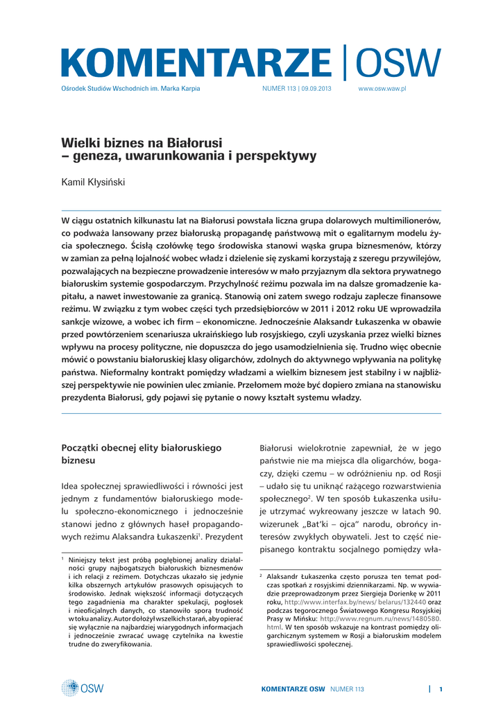 Ośrodek Studiów Wschodnich im. Marka Karpia NUMER 113 | 09.09.2013 www.osw.waw.pl Wielki biznes na Białorusi – geneza, uwarunkowania i perspektywy Kamil Kłysiński W ciągu ostatnich kilkunastu lat na Białorusi powstała liczna grupa dolarowych multimilionerów, co podważa lansowany przez białoruską propagandę państwową mit o egalitarnym modelu życia społecznego. Ścisłą czołówkę tego środowiska stanowi wąska grupa biznesmenów, którzy w zamian za pełną lojalność wobec władz i dzielenie się zyskami korzystają z szeregu przywilejów, pozwalających na bezpieczne prowadzenie interesów w mało przyjaznym dla sektora prywatnego białoruskim systemie gospodarczym. Przychylność reżimu pozwala im na dalsze gromadzenie kapitału, a nawet inwestowanie za granicą. Stanowią oni zatem swego rodzaju zaplecze finansowe reżimu. W związku z tym wobec części tych przedsiębiorców w 2011 i 2012 roku UE wprowadziła sankcje wizowe, a wobec ich firm – ekonomiczne. Jednocześnie Alaksandr Łukaszenka w obawie przed powtórzeniem scenariusza ukraińskiego lub rosyjskiego, czyli uzyskania przez wielki biznes wpływu na procesy polityczne, nie dopuszcza do jego usamodzielnienia się. Trudno więc obecnie mówić o powstaniu białoruskiej klasy oligarchów, zdolnych do aktywnego wpływania na politykę państwa. Nieformalny kontrakt pomiędzy władzami a wielkim biznesem jest stabilny i w najbliższej perspektywie nie powinien ulec zmianie. Przełomem może być dopiero zmiana na stanowisku prezydenta Białorusi, gdy pojawi się pytanie o nowy kształt systemu władzy. Początki obecnej elity białoruskiego biznesu Idea społecznej sprawiedliwości i równości jest jednym z fundamentów białoruskiego modelu społeczno-ekonomicznego i jednocześnie stanowi jedno z głównych haseł propagandowych reżimu Alaksandra Łukaszenki1. Prezydent Niniejszy tekst jest próbą pogłębionej analizy działalności grupy najbogatszych białoruskich biznesmenów i ich relacji z reżimem. Dotychczas ukazało się jedynie kilka obszernych artykułów prasowych opisujących to środowisko. Jednak większość informacji dotyczących tego zagadnienia ma charakter spekulacji, pogłosek i nieoficjalnych danych, co stanowiło sporą trudność w toku analizy. Autor dołożył wszelkich starań, aby opierać się wyłącznie na najbardziej wiarygodnych informacjach i jednocześnie zwracać uwagę czytelnika na kwestie trudne do zweryfikowania. Białorusi wielokrotnie zapewniał, że w jego państwie nie ma miejsca dla oligarchów, bogaczy, dzięki czemu – w odróżnieniu np. od Rosji – udało się tu uniknąć rażącego rozwarstwienia społecznego2. W ten sposób Łukaszenka usiłuje utrzymać wykreowany jeszcze w latach 90. wizerunek „Bat’ki – ojca” narodu, obrońcy interesów zwykłych obywateli. Jest to część niepisanego kontraktu socjalnego pomiędzy wła- 1 Alaksandr Łukaszenka często porusza ten temat podczas spotkań z rosyjskimi dziennikarzami. Np. w wywiadzie przeprowadzonym przez Siergieja Dorienkę w 2011 roku, http://www.interfax.by/news/ belarus/132440 oraz podczas tegorocznego Światowego Kongresu Rosyjskiej Prasy w Mińsku: http://www.regnum.ru/news/1480580. html. W ten sposób wskazuje na kontrast pomiędzy oligarchicznym systemem w Rosji a białoruskim modelem sprawiedliwości społecznej. 2 KOMENTARZE OSW NUMER 113 1 dzą a społeczeństwem, który przez wiele lat zapewniał stosunkowo wysokie poparcie dla prezydenta i zniechęcał Białorusinów do masowego udziału w protestach opozycji. W ciągu ostatnich kilkunastu lat ukształtowała się na Białorusi stosunkowo liczna grupa bardzo zamożnych ludzi, w tym również dolarowych multimilionerów, których liczbę międzynarodowa agencja Wealth-X oceniła w ubiegłym roku na 115 osób, a ich majątek oszacowała na 13 mld USD3. W warunkach autorytarnego systemu władzy i daleko idącej kontroli nad gospodarką sukces w wielkim biznesie jest niemożliwy W ciągu kilkunastu ostatnich lat ukształtowała się na Białorusi grupa bardzo zamożnych ludzi, w tym również dolarowych multimilionerów, których liczbę międzynarodowa agencja Wealth-X oceniła w ubiegłym roku na 115 osób. bez przyzwolenia władz, które z zasady negatywnie odnoszą się do nadmiernego rozwoju sektora prywatnego. Chcą one utrzymać dominującą pozycję sfery budżetowej w gospodarce i tym samym zachować kontrolę nad systemem ekonomicznym oraz społeczeństwem4. W tej sytuacji zgromadzenie większego kapitału, uruchomienie, efektywne prowadzenie, a następnie rozwój dużych firm prywatnych na Białorusi jest niemożliwy bez przychylności władz, czyli przede wszystkim nieformalnych powiązań z przedstawicielami reżimu oraz zaufania ze strony najwyższych władz. Zgodnie z kryterium agencji Wealth-X przynależność do klubu multimilionerów zakłada posiadanie majątku o wartości co najmniej 30 mln USD. Szerzej zob. http:// naviny.by /rubrics/finance/2012/10/17 /ic_articles _114 _ 17 9599/ 4 Sektor państwowy wytwarza ok. 70% PKB Białorusi i zatrudnia ok. 2/3 obywateli. 3 Tę prawidłowość potwierdzają losy niektórych czołowych białoruskich przedsiębiorców tzw. pierwszej fali, którzy fortuny zgromadzili jeszcze w latach 90., wykorzystując tworzące się po rozpadzie ZSRR nowe możliwości biznesowe. Część z nich, w tym m.in. tacy znani biznesmeni z tego okresu jak Leanid Wołk (handel metalami kolorowymi i złotem), Alaksandr Pupiejka (eksport i reeksport towarów przez Białoruś do Rosji), Ihar Pinkiewicz (rynek zbożowy), Walerij Szumski (obrót ropą i produktami naftowymi), Andrej Klimow (sektor budowlany, nieruchomości) oraz Waleryj Kołosowski (produkcja lekarstw), po objęciu przez Alaksandra Łukaszenkę urzędu prezydenta w 1994 roku nie zyskali poparcia nowych władz. W rezultacie wymienieni przedsiębiorcy, pomimo odnoszonych sukcesów i rosnących zysków w ciągu kilku następnych lat zos