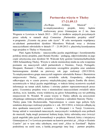 Partnerska wizyta w Theley 17-21.09.13 „Eu-Rope. Zróbmy Musical” – to międzynarodowy projekt, który będzie realizowany przez Gimnazjum nr 2 im. Jana Wegnera w Łowiczu w latach 2013 – 2015 ze środków unijnych pozyskanych przez szkołę w ramach akcji Comenius „Partnerskie projekty szkół" w programie „Uczenie się przez całe życie”. W celu nawiązania współpracy ze szkołami partnerskimi dyrektor Mirosława Walczak wraz z dwiema nauczycielkami odwiedziła w dniach 17 – 21.09.2013 r. placówkę koordynatora tego projektu w Theley w Niemczech. Pani Agata Kołucka – nauczycielka języka angielskiego i koordynatorka polskiej strony projektu, pani Renata Hymka – pedagog, odpowiedzialna za jego część artystyczną oraz dyrektor M. Walczak były gośćmi Gemeinschaftsschule /ERS Schaumberg Theley. Wizyta w szkole niemieckiej miała na celu wzajemne poznanie się nauczycieli szkół partnerskich z Niemiec, Turcji, Portugalii, Hiszpanii, Rumunii i Polski, omówienie szczegółów projektu oraz ustalenie harmonogramu działań na pierwszy rok jego realizacji (2013/2014). Ta międzynarodowa grupa nauczycieli najpierw odwiedziła Ratusz i Burmistrza miejscowości Theley, potem zwiedziła szkołę Gospodarzy, obejrzała odbywające się w czasie przerwy międzylekcyjnej zajęcia Zumby dla dzieci, uczestniczyła w lekcji języka angielskiego, w trakcie której uczniowie uzyskali informacje na temat szkół, kultury i oświaty państw reprezentowanych przez gości. Uczestnicy projektu wraz z niemieckimi nauczycielami zwiedzili także okolicę, m.in. katedrę, wieżę widokową na górze Schaumberg czy też pobliską miejscowość St. Wendel. W czasie wizyty w Theley odbyła się uroczystość oficjalnego odsłonięcia tablicy projektu Comenius z udziałem Starosty Theley – Theley pana Udo Reckenwalda. Najważniejsze w czasie tego pobytu były ustalenia dotyczące realizacji projektu w r. szk. 2013/2014, w którym odbędą się dwa spotkania nauczycieli i uczniów – w Hiszpanii i w Turcji. Uczniowie, biorąc udział w warsztatach tanecznych, muzycznych i wokalnych oraz próbach do musicali, będą mogli poznawać kulturę kraju, który odwiedzą oraz ćwiczyć język angielski jako język komunikacji w projekcie. Musical, który z inicjatywy Gimnazjum nr 2 w Łowiczu powstanie na kanwie powieści pt. „Alicja w Krainie Czarów” już w tym roku szkolnym, nosi tytuł „Alice in Euroland”. Będzie podzielony na sześć scen, a każdą przygotuje inny kraj – partner projektu. Pierwsza wizyta nauczycieli i uczniów w Hiszpanii przewidziana jest na styczeń 2014 r., druga – w Turcji – na maj 2014 r. W czasie wizyt uczniowie będą brali udział w warsztatach, próbach do musicalu, jak również w zajęciach integrujących, pozwalających poznać kulturę nie tylko odwiedzanego kraju, ale również krajów partnerskich. Wizyta w Niemczech była bardzo cennym doświadczeniem dla nauczycieli. Wspólne działanie osób z sześciu różnych krajów, mówiących sześcioma różnymi językami było czasem zabawne, ale na pewno obiecujące i dobrze rokujące na przyjazną, owocną pracę.