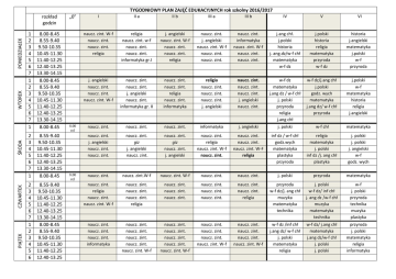 TYGODNIOWY PLAN ZAJĘĆ EDUKACYJNYCH rok szkolny 2016/2017 PIĄTEK CZWARTEK ŚRODA WTOREK PONIEDZIAŁEK rozkład godzin 1 2 3 4 5 6 7 1 2 3 4 5 6 7 1 8.00-8.45 8.55-9.40 9.50-10.35 10.45-11.30 11.40-12.25 12.40-13.25 13.30-14.15 8.00-8.45 8.55-9.40 9.50-10.35 10.45-11.30 11.40-12.25 12.40-13.25 13.30-14.15 8.00-8.45 2 3 4 5 6 7 1 8.55-9.40 9.50-10.35 10.45-11.30 11.40-12.25 12.40-13.25 13.30-14.15 8.00-8.45 2 3 4 5 6 7 1 2 3 4 5 6 8.55-9.40 9.50-10.35 10.45-11.30 11.40-12.25 12.40-13.25 13.30-14.15 8.00-8.45 8.55-9.40 9.50-10.35 10.45-11.30 11.40-12.25 12.40-13.25 „0” 8.00 rel 8.00 rel I II a II b III a III b IV V VI naucz. zint. W-f naucz. zint. naucz. zint. religia religia naucz. zint. w-f naucz. zint. naucz. zint. informatyka gr.I j. angielski naucz. zint. W-f naucz. zint. naucz. zint. religia naucz. zint. j. angielski naucz. zint. W-f naucz. zint. naucz. zint. naucz. zint. informatyka naucz. zint. W-f naucz. zint. naucz. zint. j.ang chł. j.polski historia j. ang.dz/w-f chł matematyka w-f dz j.polski historia religia matematyka przyroda w-f dz historia j.angielski matematyka j.polski w-f przyroda j. angielski naucz. zint. naucz. zint. naucz. zint. W-f naucz. zint. naucz. zint. j. angielski naucz. zint. informatyka gr. II naucz. zint. naucz. zint. religia naucz. zint. informatyka religia naucz. zint. naucz. zint. naucz. zint. j. angielski naucz. zint. naucz. zint. naucz. zint. j. angielski naucz. zint. w-f dz matematyka j.ang dz / w-f chł j. polski przyroda religia j.ang chł w-f dz/j.ang chł j.polski godz. wych matematyka j.ang dz/ w-f chł przyroda j.polski w-f matematyka historia religia j.angielski naucz. zint. naucz. zint. naucz. zint. informatyka j. angielski j. polski w-f chł matematyka naucz. zint. j. angielski naucz. zint. naucz. zint. naucz. zint. giz j. angielski naucz. zint. naucz. zint. giz naucz. zint. j. angielski naucz. zint. religia naucz. zint. W-f naucz. zint. naucz. zint. naucz. zint. naucz. zint. W-F religia inf dz / w-f chł godz.wych matematyka plastyka przyroda religia matematyka j. polski inf dz /j. ang chł plastyka j. polski j. polski j. angielski w-f godz. wych naucz. zint. naucz. zint.W-f naucz. zint. W-f naucz. zint. naucz. zint. j. polski przyroda matematyka naucz. zint. religia naucz. zint. naucz. zint. W-f naucz. zint. naucz. zint. naucz. zint. religia naucz. zint. naucz. zint. naucz. zint. naucz. zint. naucz. zint. naucz. zint. naucz. zint. naucz. zint. religia przyroda w-f dz/j. ang chł muzyka matematyka technika j. polski w-f dz/ inf chł j. ang dz /w-f chł muzyka matematyka technika w-f j. polski przyroda technika muzyka plastyka naucz. zint. naucz. zint. naucz. zint. informatyka naucz. zint. naucz. zint. naucz. zint. naucz. zint. naucz. zint. W-f naucz. zint. naucz. zint. naucz. zint. naucz. zint. naucz. zint. W-f naucz. zint. naucz. zint. naucz. zint. naucz. zint. W-f naucz. zint. naucz. zint. naucz. zint. naucz. zint. W-f w-f dz /inf chł j.ang dz/ w-f chł j. polski matematyka religia w-f dz/ j.ang chł matematyka j.ang dz/w-f chł j. polski j. polski przyroda j. polski matematyka religia informatyka