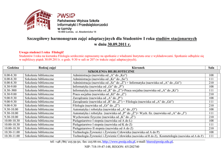 18-400 Łomża, ul. Akademicka 14 Szczegółowy harmonogram zajęć adaptacyjnych dla Studentów I roku studiów stacjonarnych w dniu 30.09.2011 r. Uwaga studenci I roku Filologii! Studentów I roku na kierunku Filologia serdecznie zapraszamy na spotkanie z władzami Instytutu oraz z wykładowcami. Spotkanie odbędzie się w najbliższy piątek 30.09.2011r. o godz. 9:30 w sali nr 207 (w trakcie zajęć adaptacyjnych). Godzina 8.00-8.30 8.00-8.30 8.00-8.30 8.30-9.00 8.30-.900 8.30-9.00 9.00-9.30 9.00-9.30 9.00-9.30 9.30-10.00 9.30-10.00 9.30-10.00 10.00-10.30 10.00-10.30 10.00-10.30 10.30-11.00 10.30-11.00 Rodzaj zajęć Szkolenie biblioteczne Szkolenie biblioteczne Szkolenie biblioteczne Szkolenie biblioteczne Szkolenie biblioteczne Szkolenie biblioteczne Szkolenie biblioteczne Szkolenie biblioteczne Szkolenie biblioteczne Szkolenie biblioteczne Szkolenie biblioteczne Szkolenie biblioteczne Szkolenie biblioteczne Szkolenie biblioteczne Szkolenie biblioteczne Szkolenie biblioteczne Szkolenie biblioteczne Kierunek SZKOLENIA BILBLIOTECZNE Administracja (nazwiska od „A” do „Ko”) Administracja (nazwiska od „Kr” do „So”) Administracja (nazwiska od „Sz” do „Ż”) + Informatyka (nazwiska od „A” do „Gó”) Informatyka (nazwiska od „Gr” do „P”) Informatyka (nazwiska od „R” do „Z”)+Praca socjalna (nazwiska od „A” do „Ki”) Praca socjalna (nazwiska od „Kł” do „Z”) Zarządzanie (nazwiska od „A” do „P”) Zarządzanie (nazwiska od „R” do „Ż”) + Filologia (nazwiska od „A” do „Gó”) Filologia (nazwiska od „Gr” do „Z”) Automatyka i robotyka (nazwiska od „A” do „O”) Automatyka i robotyka (nazwiska od „P” do „Ż”)+ Wych. fiz. (nazwiska od „A” do „J”) Wychowanie fizyczne (nazwiska od „K” do „Ż”) Pielęgniarstwo I stopnia (nazwiska od A do Ł) Pielęgniarstwo I stopnia (nazwiska od K do Z) Pielęgniarstwo II stopnia (nazwiska od A do Z) Technologia Żywności i Żywienie Człowieka (nazwiska od A do P) Technologia Żywności i Żywienie Człowieka (nazwiska od R do Z), Kosmetologia (nazwiska od A do F) tel: +48 /86/ 215 59 50, fax: 215 66 00, http://www.pwsip.edu.pl, e-mail: [email protected], NIP: 718-19-47-148, REGON: 451202740 Sala 108 111 210 108 111 210 108 111 210 108 111 210 108 111 210 108 111 18-400 Łomża, ul. Akademicka 14 10.30-11.00 8:00 8:00 8:30 9:00 8.00 9:45-10:00 10.15-11:00 11:00-11:45 11:00-11:45 Szkolenie biblioteczne Kosmetologia (nazwiska od K do W) ODBIÓR DOKUMENTÓW (INDEKS, LEGITYMACJA) – DZIAŁ SPRAW STUDENCKICH Odbiór legitymacji i indeksów Zarządzanie + Filologia mgr S. Skrodzka Odbiór legitymacji i indeksów mgr M. Chojnowska, mgr M. Automatyka i Robotyka, Wychowanie fizyczne Jastrzębska Odbiór legitymacji i indeksów Administracja mgr N. Cholewicka Odbiór legitymacji i indeksów mgr M. Chojnowska, mgr M. Informatyka, Praca socjalna Jastrzębska Odbiór legitymacji i indeksów mgr inż. J. Krawczyk-Deptuła, Kosmetologia, Pielęgniarstwo I i II stopień, Technologia Żywności i Żywienie Człowieka mgr E. Mioduszewska DZIAŁ WSPÓLPRACY Z ZAGRANICĄ Dział współpracy z zagranicą Kosmetologia, Pielęgniarstwo I i II stopień, Technologia Żywności i Żywienie Człowieka mgr Lilianna Rywacka Dział współpracy z zagranicą Administracja, Automatyka i robotyka, Informatyka, Praca socjalna, Wychowanie fizyczne, mgr Lilianna Rywacka Zarządzanie, Filologia DZIAŁ SYSTEMÓW KOMPUTEROWYCH mgr inż. L. Laskowski - Dział Administracja, Automatyka i robotyka, Informatyka, Praca socjalna, Wychowanie fizyczne, Systemów Komputerowych i Zarządzanie, Filologia Telekomunikacyjnych mgr inż. M. Dąbrowski - Dział Systemów Komputerowych i Kosmetologia, Pielęgniarstwo I i II stopień, Technologia Żywności i Żywienie Człowieka Telekomunikacyjnych tel: +48 /86/ 215 59 50, fax: 215 66 00, http://www.pwsip.edu.pl, e-mail: [email protected], NIP: 718-19-47-148, REGON: 451202740 210 114 115 213 115 315 315 315 315 214 18-400 Łomża, ul. Akademicka 14 11.45-12.00 11:45-12:00 12:00-13:00 12:00-13:00 13:00-14:00 13:00-14:00 mgr Marlena Włodkowska Biuro Karier PWSIiP mgr Małgorzata Tyszka Biuro Karier PWSIiP Szkolenie BHP mgr Andrzej Mojski Szkolenie BHP mgr Agata Gołębiewska Szkolenie BHP mgr Agata Gołębiewska Szkolenie BHP mgr Andrzej Mojski BIURO KARIER Administracja, Automatyka i robotyka, Informatyka, Praca socjalna, Wychowanie fizyczne, Zarządzanie, Filologia Kosmetologia, Pielęgniarstwo I i II stopień, Technologia Żywności i Żywienie Człowieka SZKOLENIE BHP Administracja, Automatyka i robotyka, Informatyka, Praca socjalna, Wychowanie fizyczne, Zarządzanie, Filologia 315 214 315 Kosmetologia, Pielęgniarstwo I i II stopień, Technologia Żywności i Żywienie Człowieka 214 Administracja, Automatyka i robotyka, Informatyka, Praca socjalna, Wychowanie fizyczne, Zarządzanie, Filologia 315 Kosmetologia, Pielęgniarstwo I i II stopień, Technologia Żywności i Żywienie Człowieka 214 tel: +48 /86/ 215 59 50, fax: 215 66 00, http://www.pwsip.edu.pl, e-mail: [email protected], NIP: 718-19-47-148, REGON: 451202740
