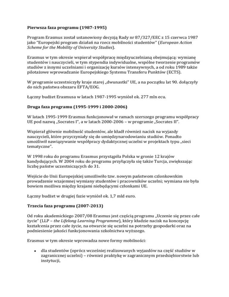 Pierwsza faza programu (1987-1995) Program Erasmus został ustanowiony decyzją Rady nr 87/327/EEC z 15 czerwca 1987 jako “Europejski program działań na rzecz mobilności studentów” (European Action Scheme for the Mobility of University Studies). Erasmus w tym okresie wspierał współpracę międzyuczelnianą obejmującą: wymianę studentów i nauczycieli, w tym stypendia indywidualne, wspólne tworzenie programów studiów z innymi uczelniami i organizację kursów intensywnych, a od roku 1989 także pilotażowe wprowadzanie Europejskiego Systemu Transferu Punktów (ECTS). W programie uczestniczyły kraje starej „dwunastki” UE, a na początku lat 90. dołączyły do nich państwa obszaru EFTA/EOG. Łączny budżet Erasmusa w latach 1987-1995 wyniósł ok. 277 mln ecu. Druga faza programu (1995-1999 i 2000-2006) W latach 1995-1999 Erasmus funkcjonował w ramach szerszego programu współpracy UE pod nazwą „Socrates I”, a w latach 2000-2006 – w programie „Socrates II”. Wspierał głównie mobilność studentów, ale kładł również nacisk na wyjazdy nauczycieli, które przyczyniały się do umiędzynarodowianiu studiów. Ponadto umożliwił nawiązywanie współpracy dydaktycznej uczelni w projektach typu „sieci tematyczne”. W 1998 roku do programu Erasmus przystąpiła Polska w gronie 12 krajów kandydujących. W 2004 roku do programu przyłączyła się także Turcja, zwiększając liczbę państw uczestniczących do 31. Wejście do Unii Europejskiej umożliwiło tzw. nowym państwom czlonkowskim prowadzenie wzajemnej wymiany studentów i pracowników uczelni; wymiana nie była bowiem możliwa między krajami niebędącymi członkami UE. Łączny budżet w drugiej fazie wyniósł ok. 1,7 mld euro. Trzecia faza programu (2007-2013) Od roku akademickiego 2007/08 Erasmus jest częścią programu „Uczenie się przez całe życie” (LLP – the Lifelong Learning Programme), który kładzie nacisk na koncepcję kształcenia przez całe życie, na otwarcie się uczelni na potrzeby gospodarki oraz na podniesienie jakości funkcjonowania szkolnictwa wyższego. Erasmus w tym okresie wprowadza nowe formy mobilności: dla studentów (oprócz wcześniej realizowanych wyjazdów na część studiów w zagranicznej uczelni) – również praktykę w zagranicznym przedsiębiorstwie lub instytucji, dla pracowników uczelni (oprócz wcześniej realizowanych wyjazdów w celu prowadzenia zajęć dydaktycznych w zagranicznej uczelni) – również wyjazdy szkoleniowe. Program wspiera także projekty współpracy wielostronnej między uczelniami. Obecnie w programie uczestniczą łącznie 33 kraje: 27 krajów UE, 4 kraje EOG (Islandia, Norwegia, Lichtenstein i Szwajcaria) i 2 kraje kandydujące (Chorwacja i Turcja). Do udziału w Erasmusie jest uprawnionych ok. 4 tysięcy uczelni. Łączny budżet programu w trzeciej fazie ma wynieść ok. 3 mld euro. Znaczenie Erasmusa Program Erasmus zainspirował rozwój współpracy międzynarodowej w polskich uczelniach, przyczynił się do zwiększenia oferty programowej w językach obcych, ma udział w promocji polskich uczelni za granicą oraz wprowadza standardy podnoszące jakość kształcenia w szkołach wyższych. Jak przyznają stypendyści programu w ankietach, które wypełniają po powrocie do kraju, Erasmus przynosi również szereg innych indywidualnych korzyści – umożliwia zdobycie „europejskiego doświadczenia”, jest ceniony ze względu na korzyści w wymiarze kulturowym (poznanie innych krajów, języków), akademickim (poznanie innych modeli kształcenia i funkcjonowania uczelni), zawodowym (studia za granicą stanowią atut w oczach pracodawców), ale również osobistym (tolerancja, otwarcie na inne kultury i innych ludzi, usamodzielnienie się, pozbycie kompleksów). Ewa Kolanowska, autorka opracowania „10 lat Erasmusa w Polsce”, pisze: „... studenci Erasmusa tworzą to, co często cytowany prof. Stefan Wolff, niemiecki politolog pracujący obecnie na University of Nottingham, nazwał „pokoleniem Erasmusa” pokoleniem ludzi, którzy naprawdę czują się nie tylko Polakami, Niemcami, Grekami i Finami, ale także Europejczykami.